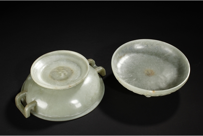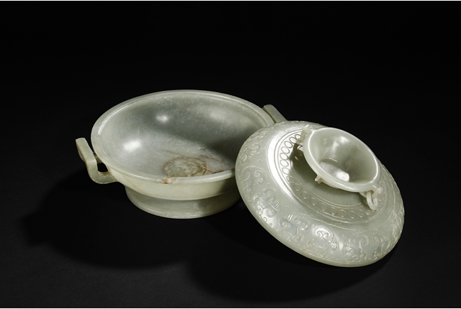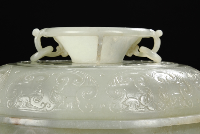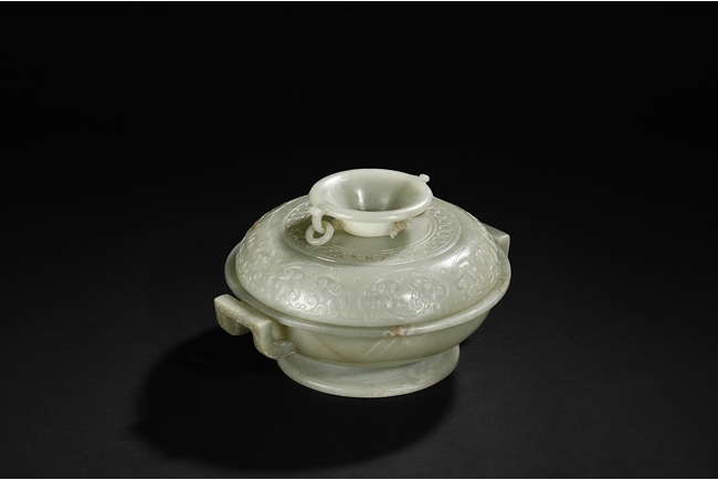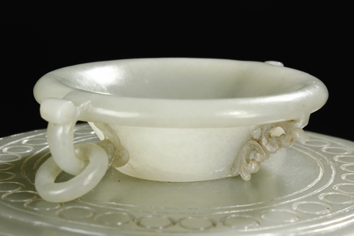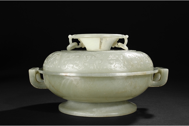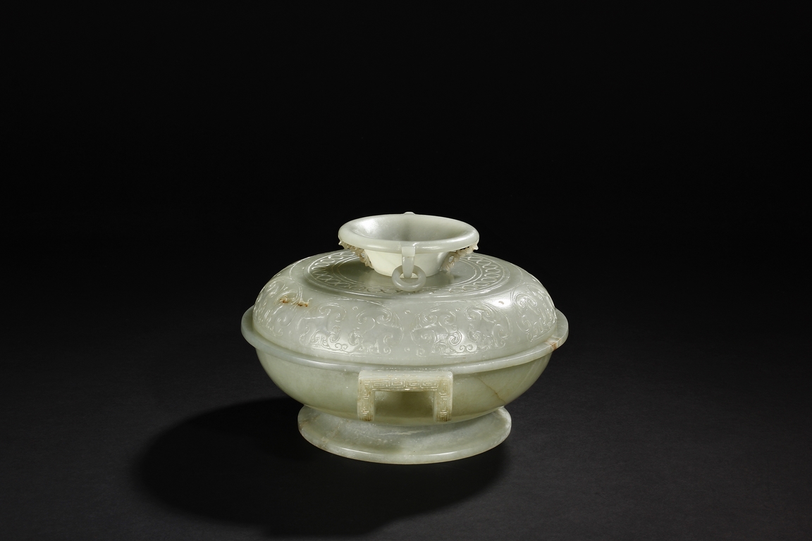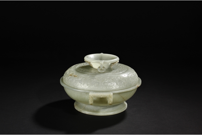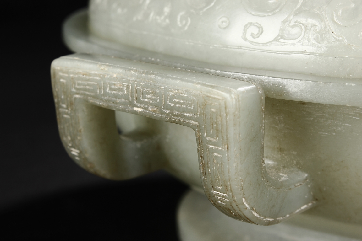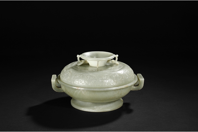 Of compressed globular form, the censer rises from a spreading circular foot. The sides are carved with S-shaped handles, and the cover is finely incised in low relief with auspicious bat ruyi patterns and surmounted with a domed cover suspended with loose rings. The stone is of translucent and even celadon tone with few russet veins in interior. Qing Dynasty period.