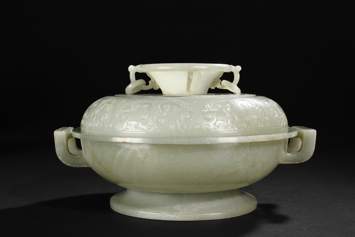玉質細膩瑩潤, 雕工精細,紋飾流暢,選料考究,造型古樸厚重,實為難得。