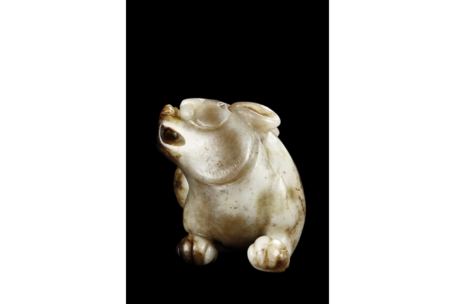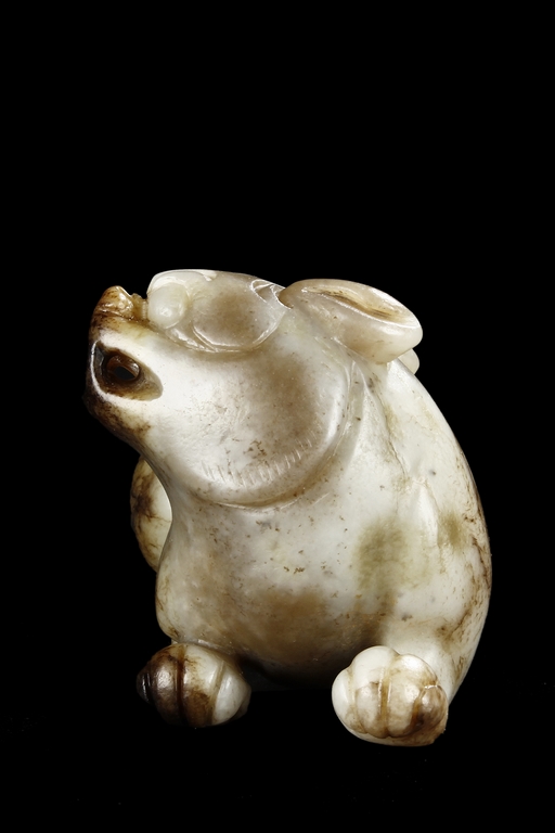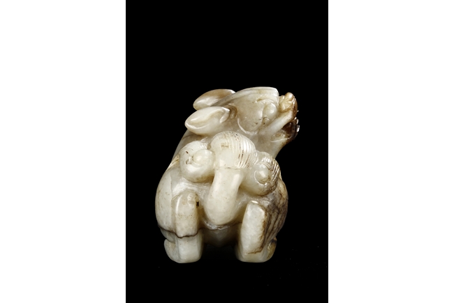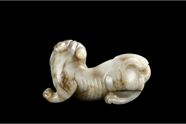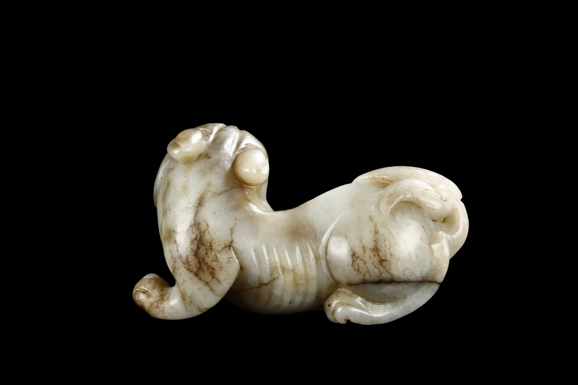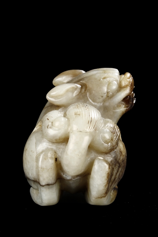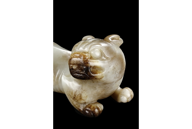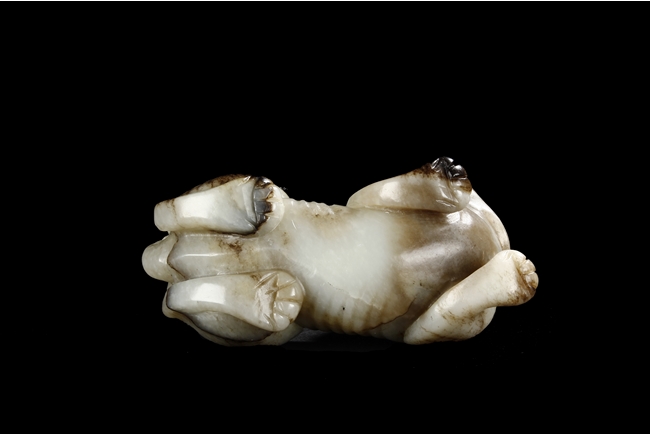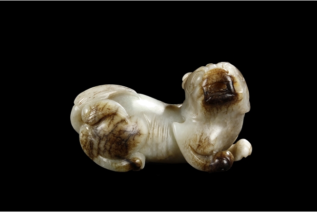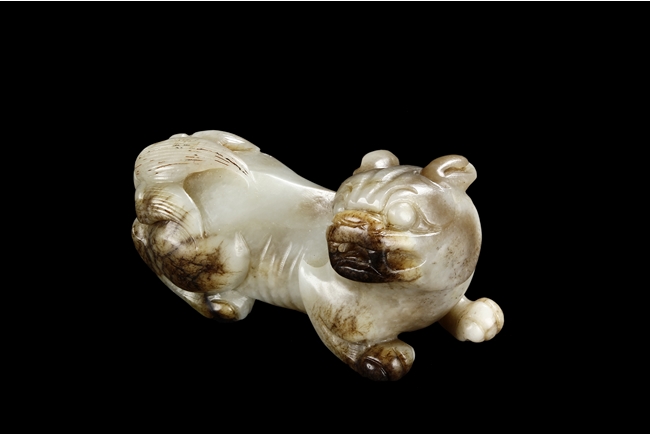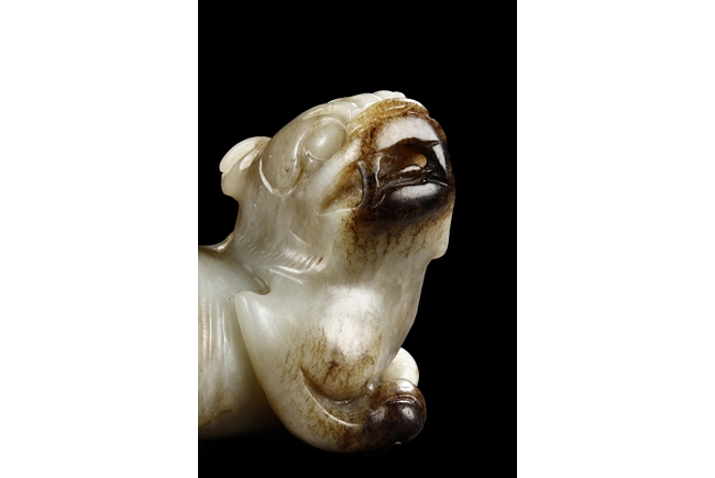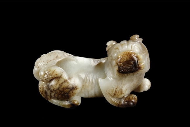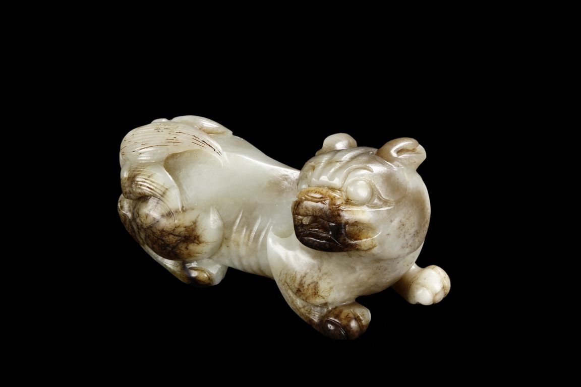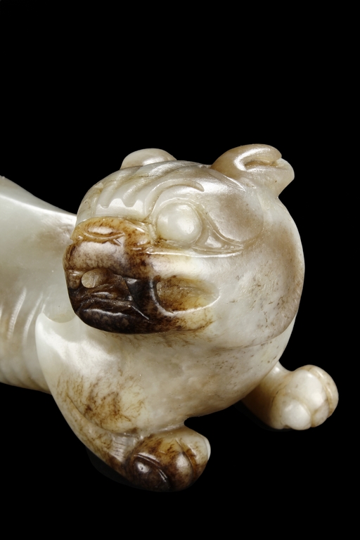 The jade dog is shown with the head turning aside featuring ferocious expression, the incised tails are highly detailed, the stone is of white tone with dark russet markings highlighting the mouth and feet.