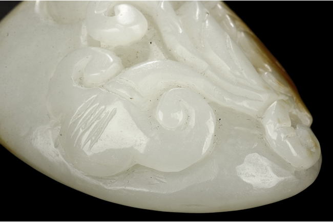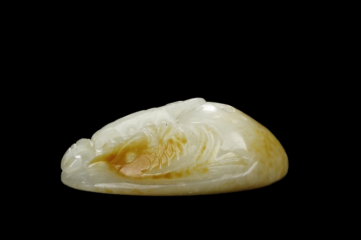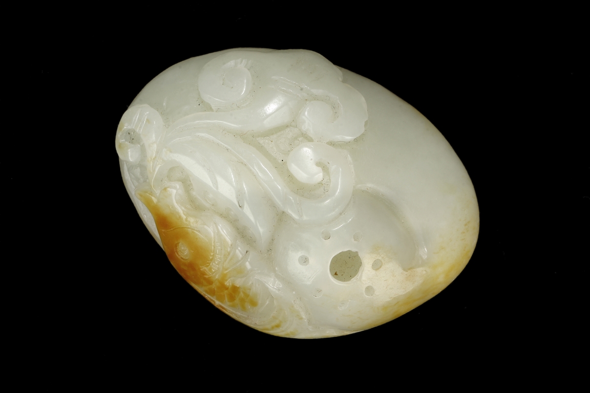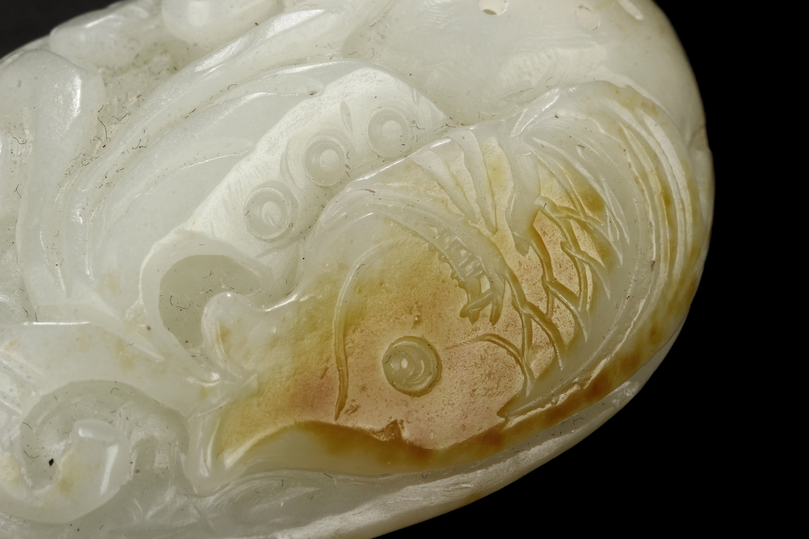 The pendant is carved with a fish with water coming out of its mouth highlighted on the russet area of the stone. The stone is of white tone with russet markings and skin. Qing Dynasty period.