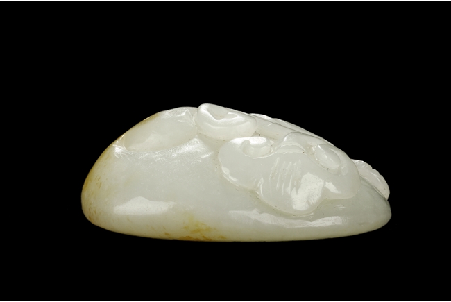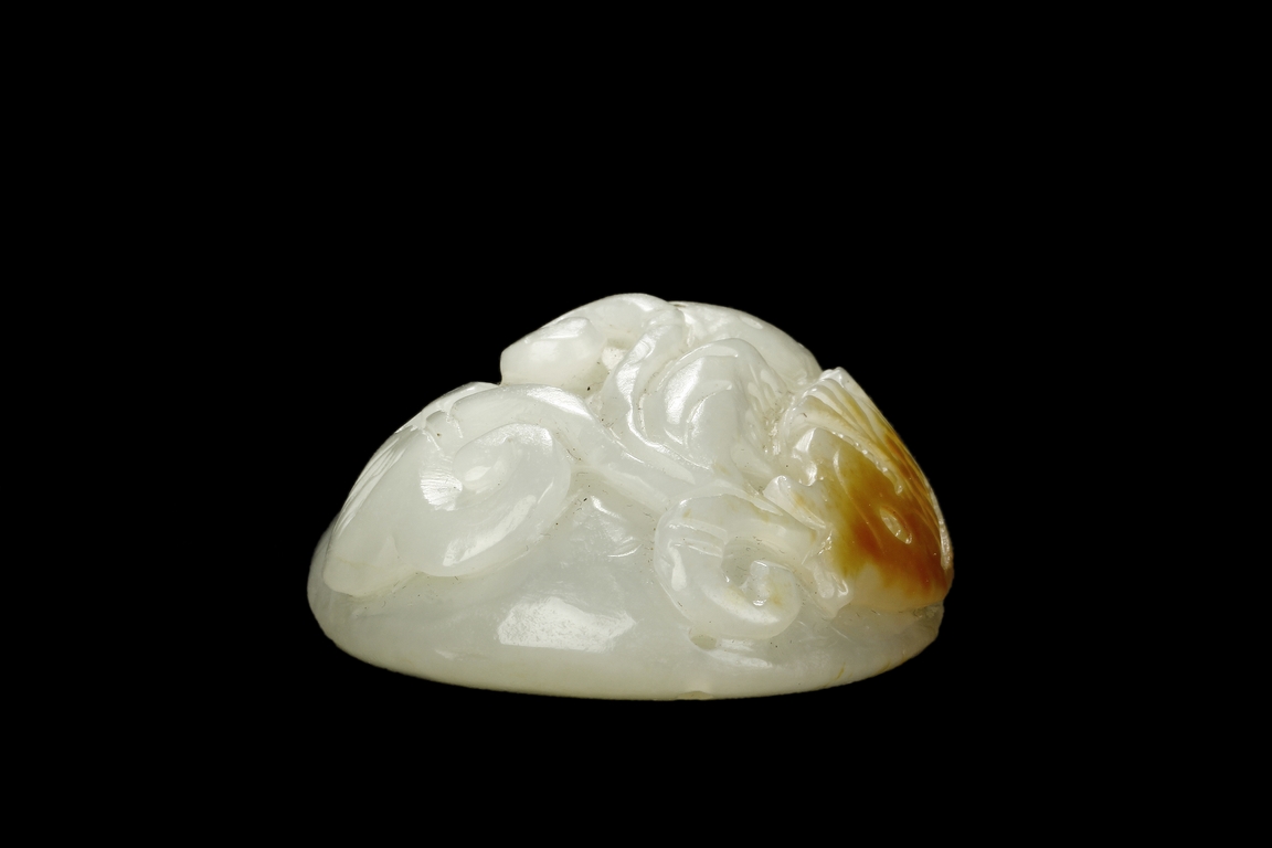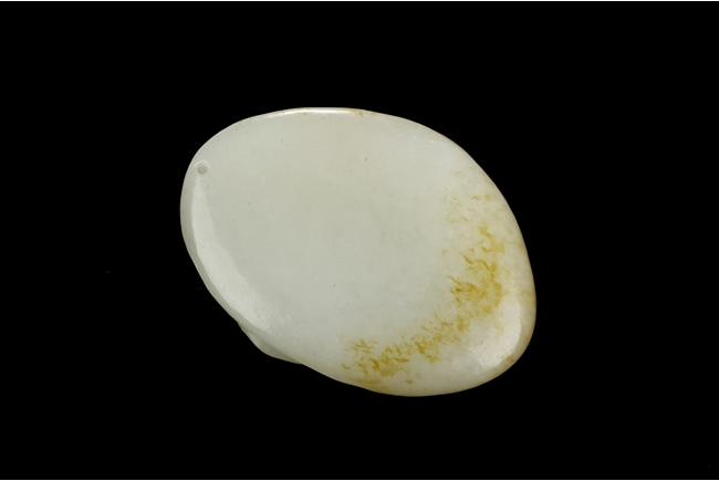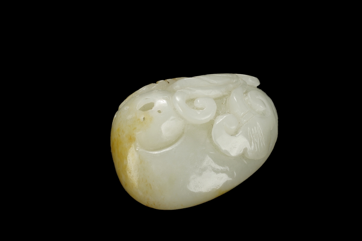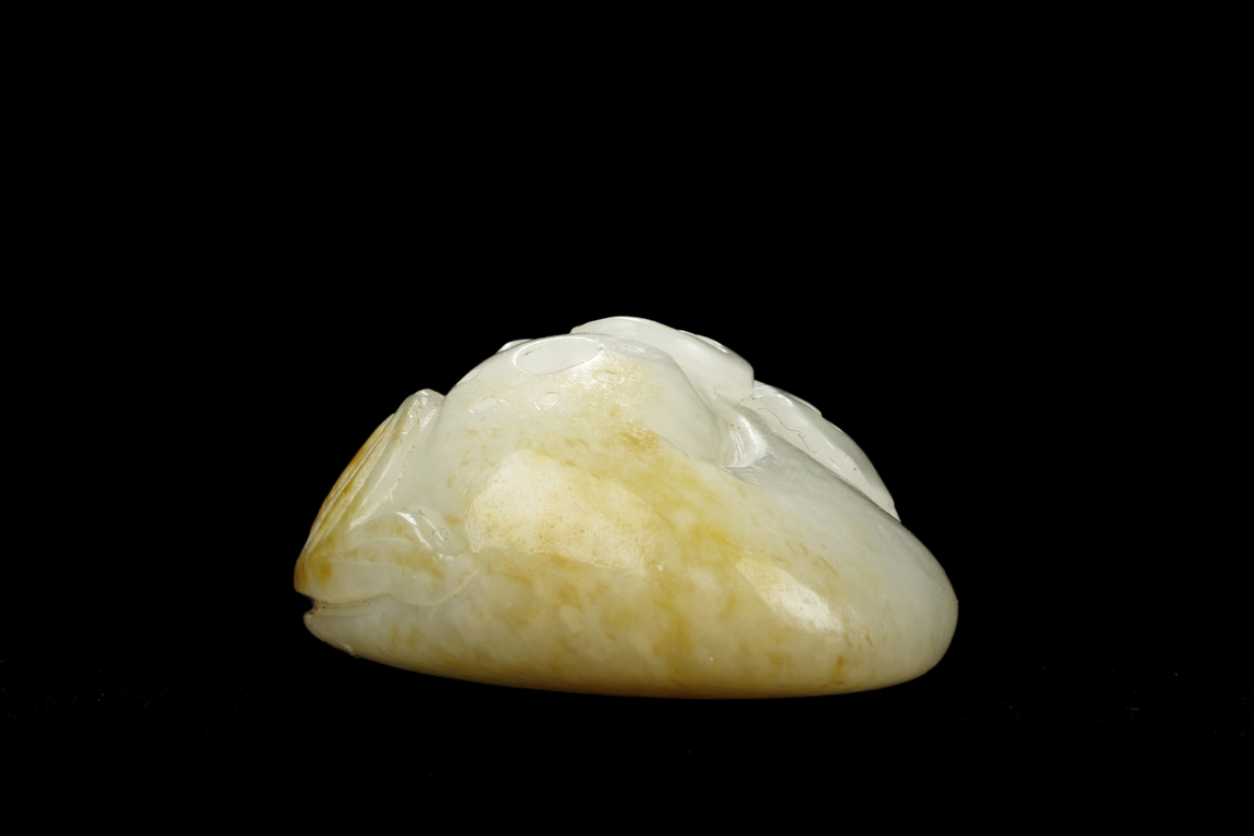 The pendant is carved with a fish with water coming out of its mouth highlighted on the russet area of the stone. The stone is of white tone with russet markings and skin. Qing Dynasty period.