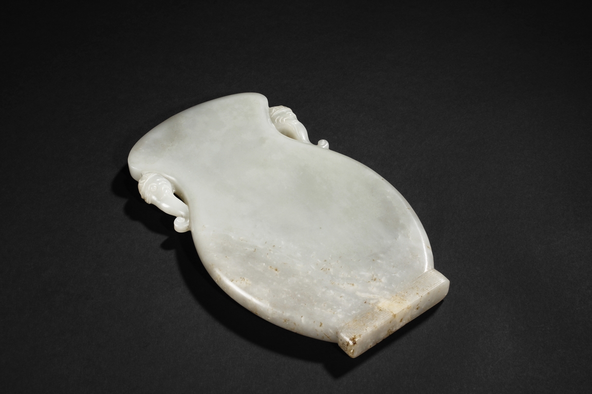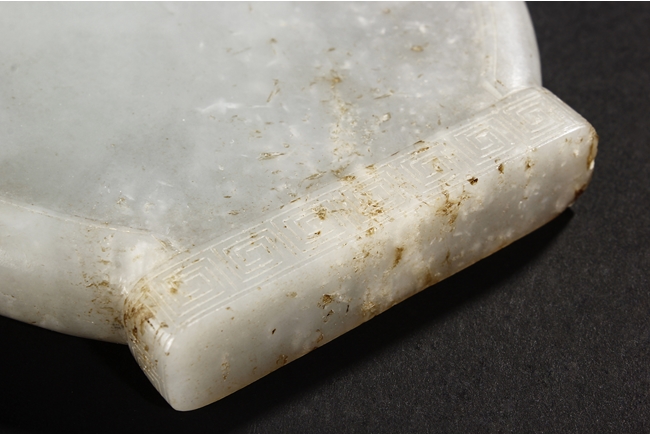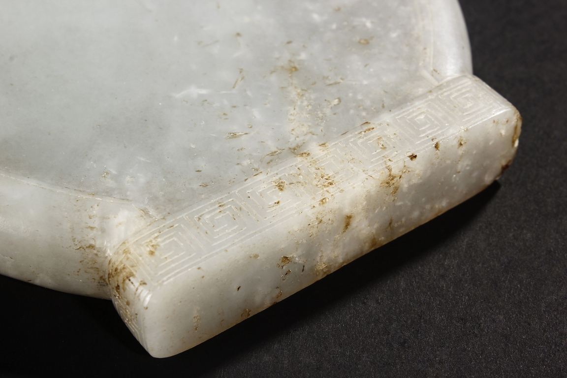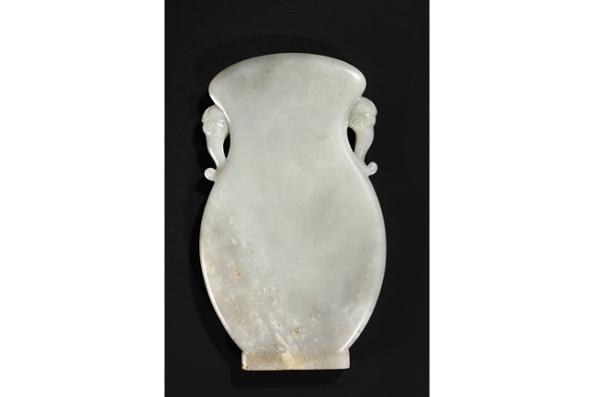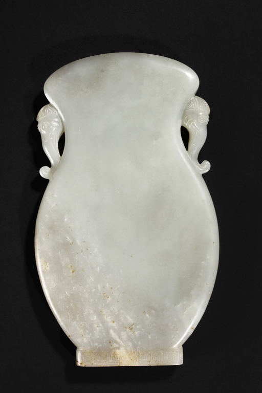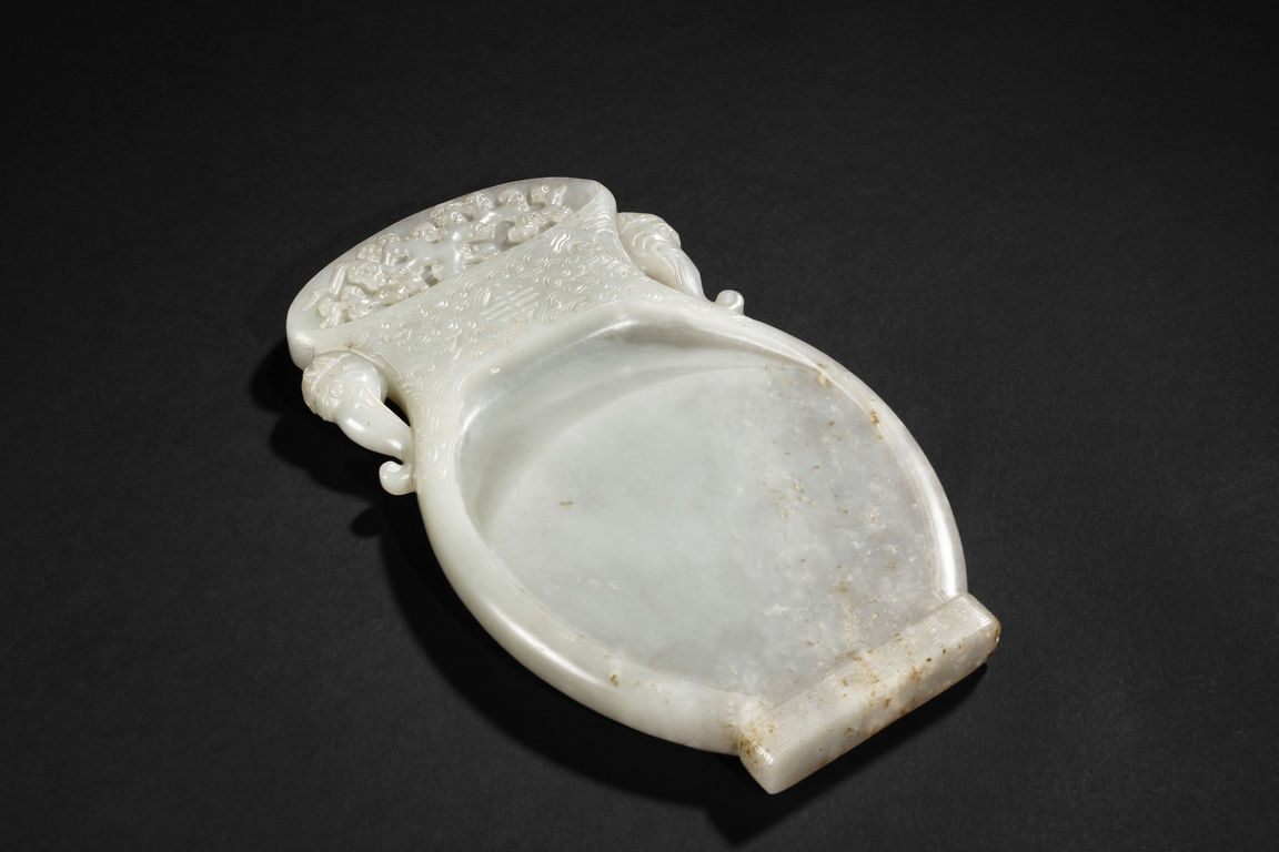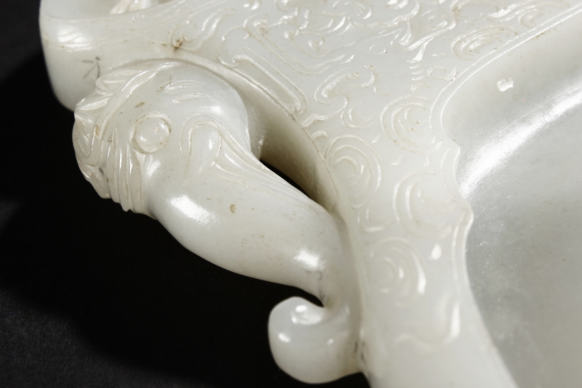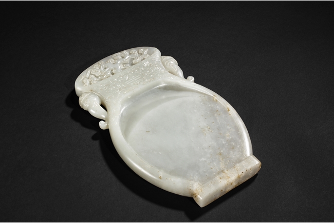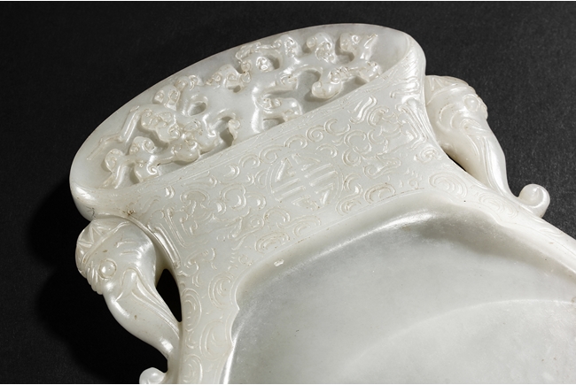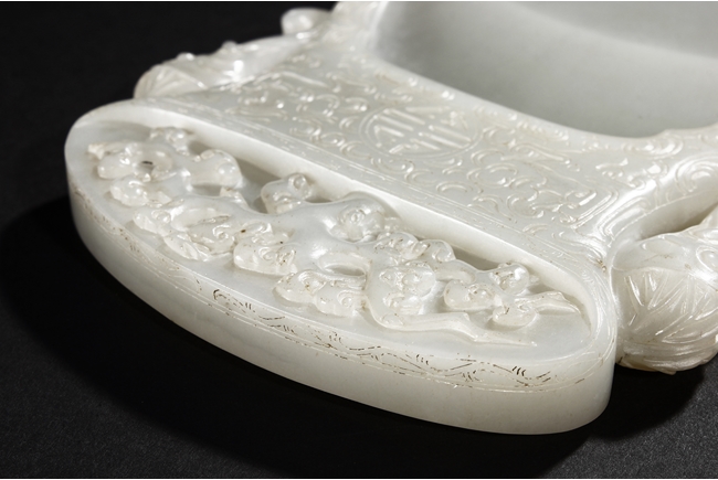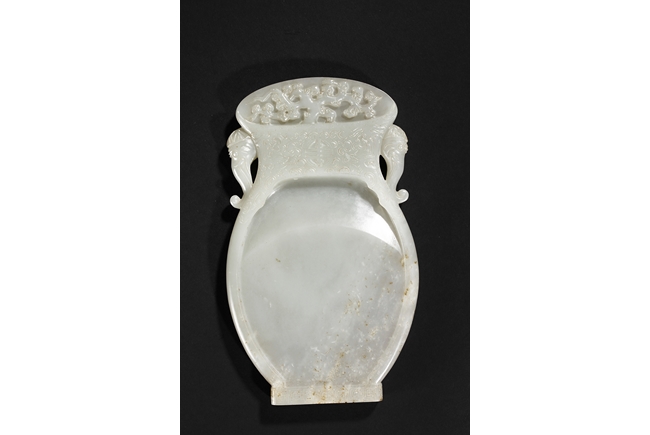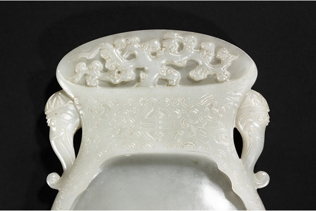 The ink stone is carved in the form of a zun vessel with a base of key-fret pattern and two delicate elephant-formed handles on the sides, the well below a finely carved stylized auspicious character amidst a leiwen ground and detailed Lingzhi tree issuing from the vessel. The stone is of white tone with russet markings and veining.