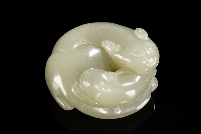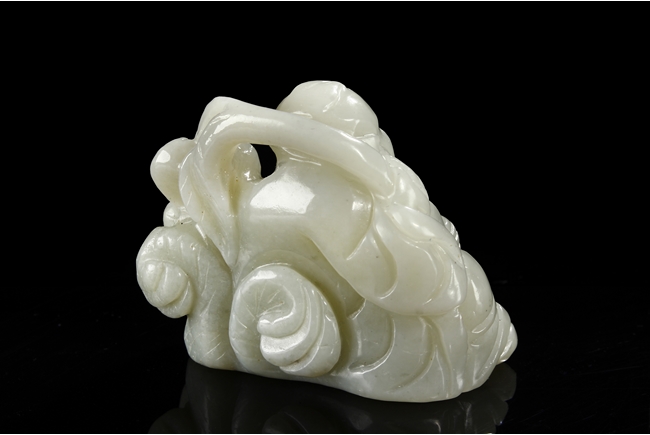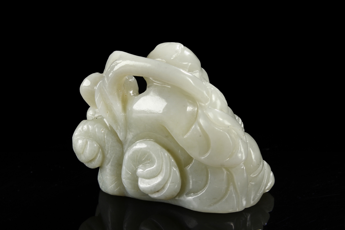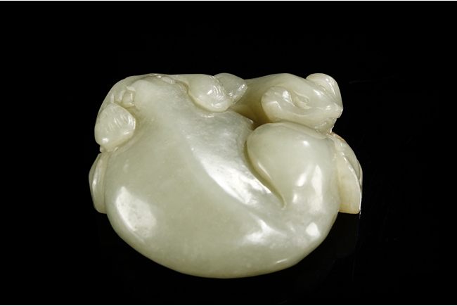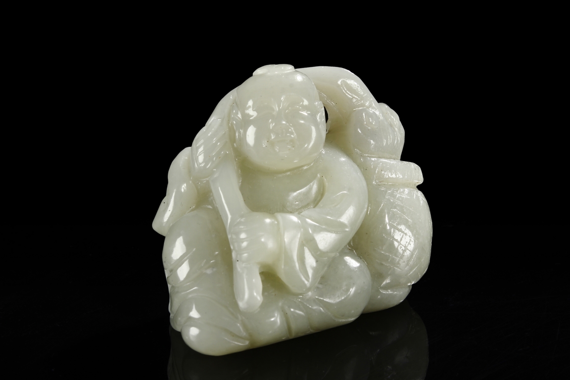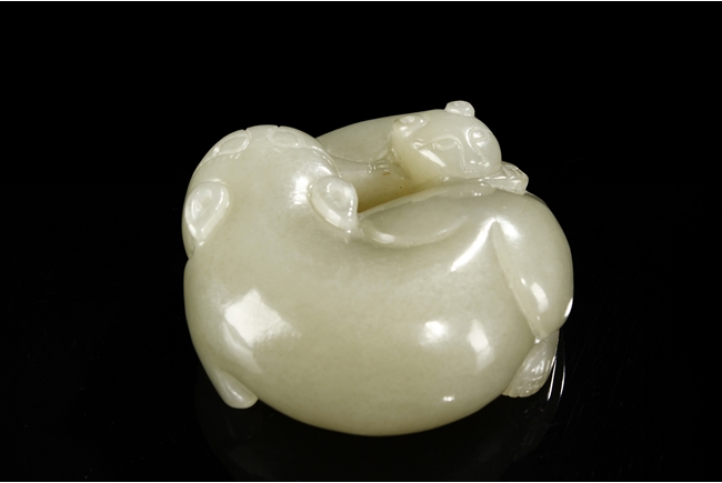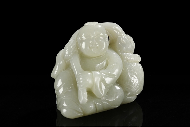 The group consists of three carvings, including a celadon jade figure of boy holding ruyi, a celadon jade carving of two cats side by side, and a celadon jade model of mythical beast.