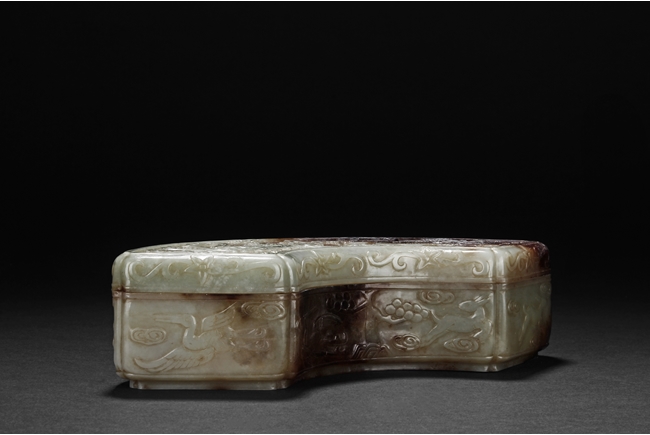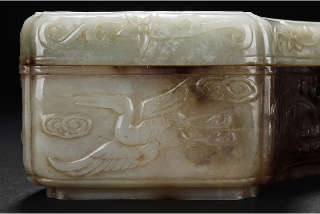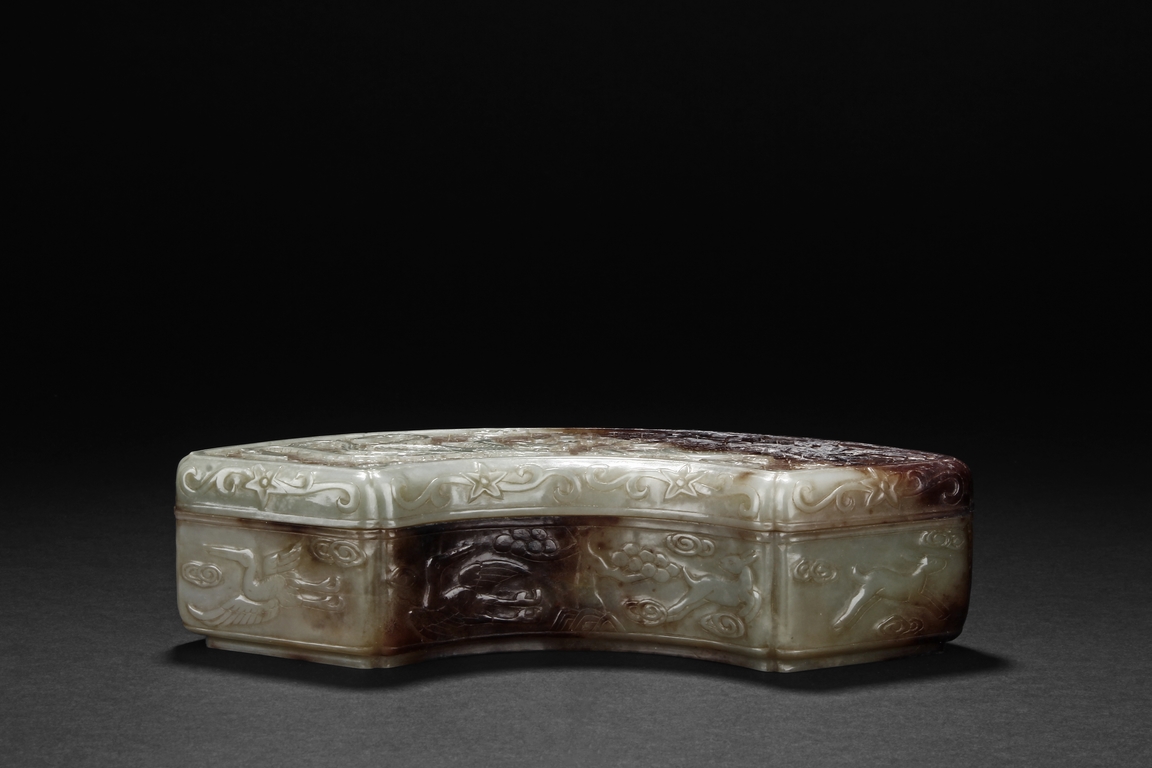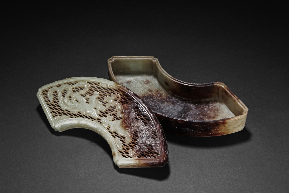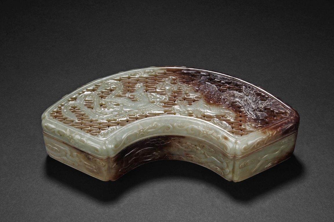 Modelled in the form of fan-shape, the cover is carved and pierced with a phoenix and dragon flanking a flaming ball, all on a dense network of auspicious cloud motif in openwork. The sides are decorated in shallow relief with cranes in flight and deers in chase. The stone is of celadon tone with extensive dark russet skin.