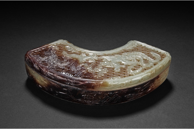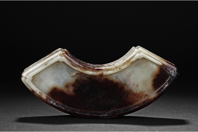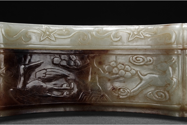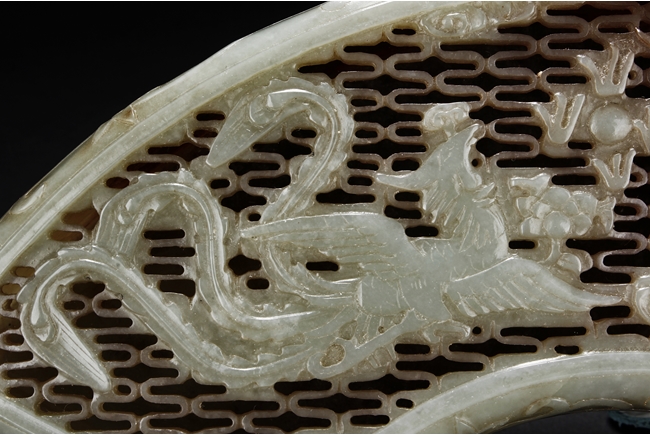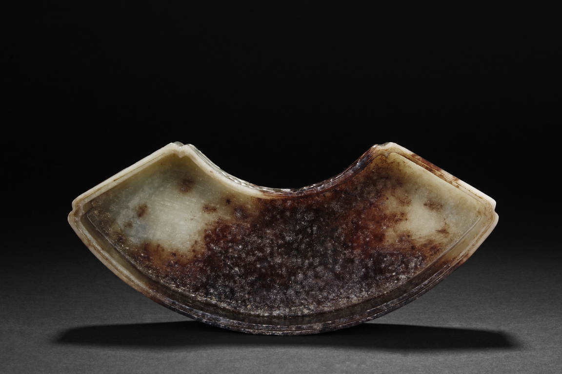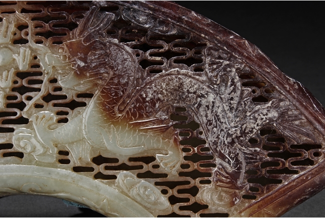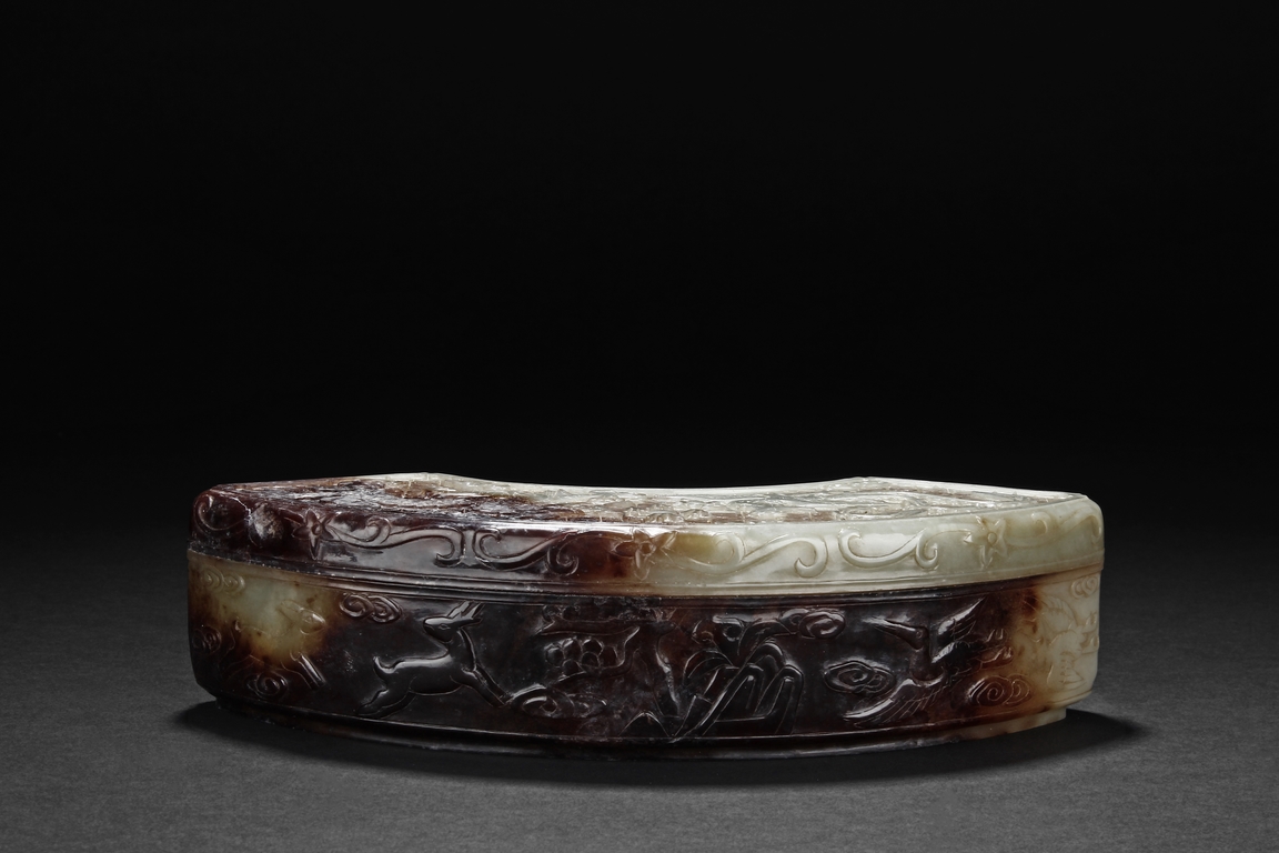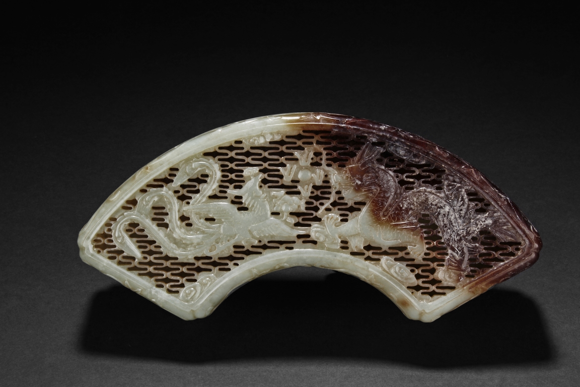 Modelled in the form of fan-shape, the cover is carved and pierced with a phoenix and dragon flanking a flaming ball, all on a dense network of auspicious cloud motif in openwork. The sides are decorated in shallow relief with cranes in flight and deers in chase. The stone is of celadon tone with extensive dark russet skin.
