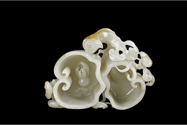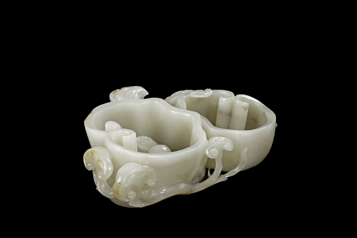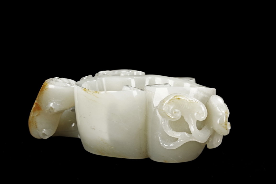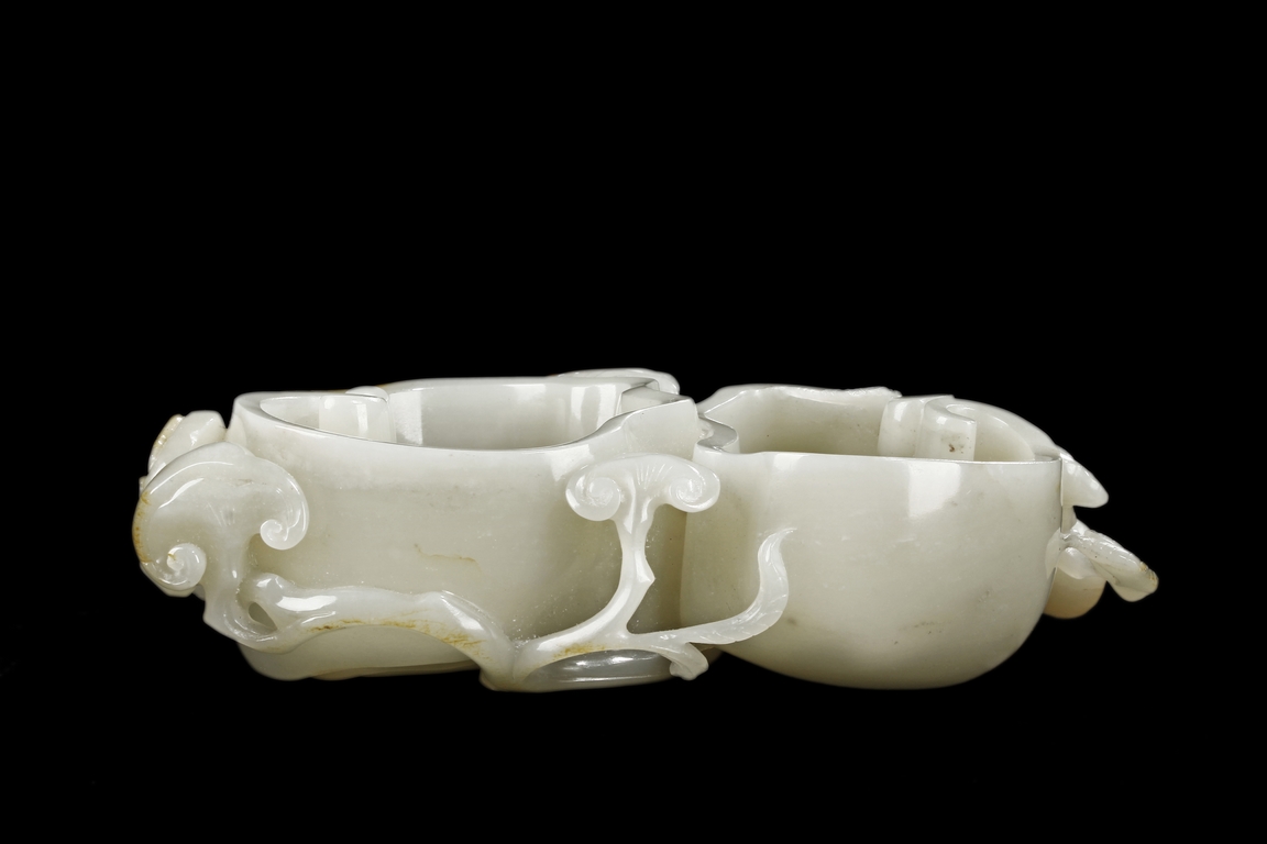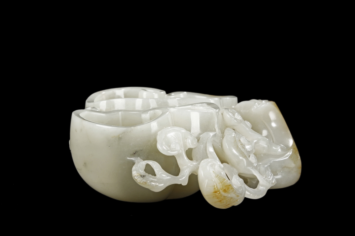 Modelled as two linked Lingzhi shaped receptacle, enveloped around the sides with Lingzhi and gnarled branches, the interior of one receptacle is carved in relief with a Buddha's hand. The stone is of white tone with russet markings and veining on Lingzhi and the main branch.