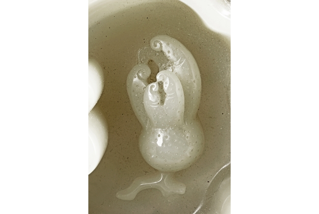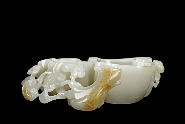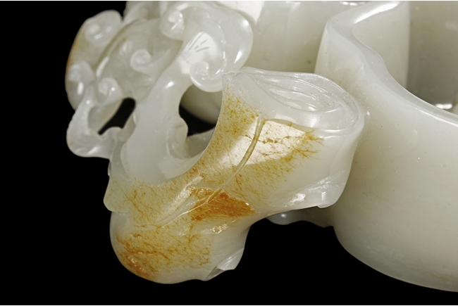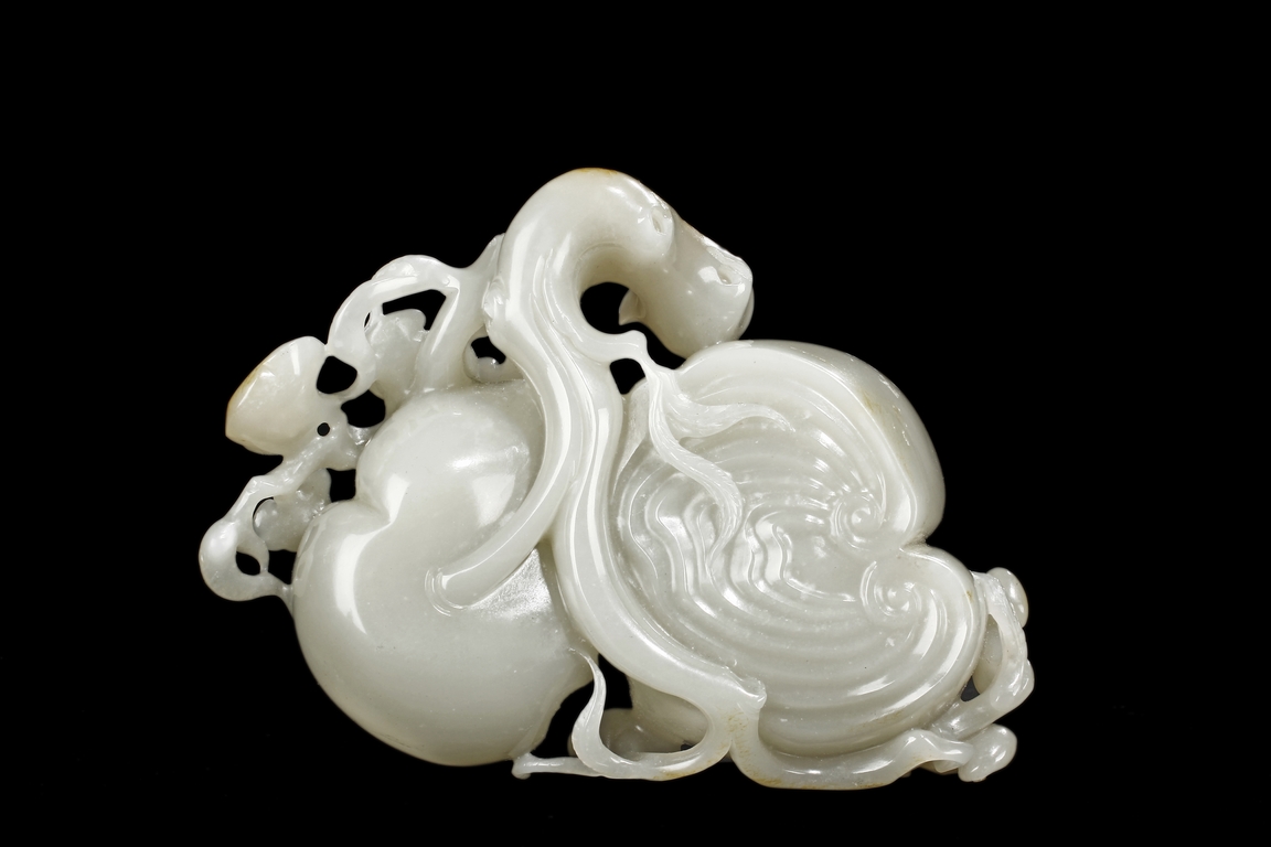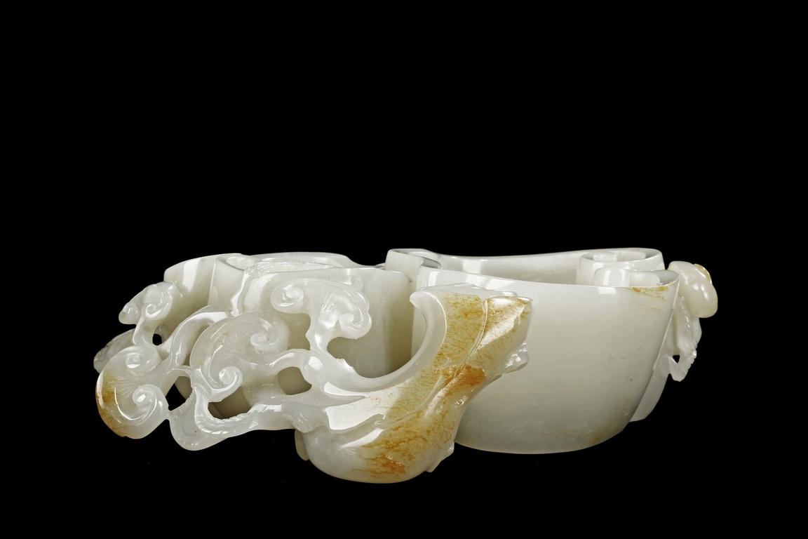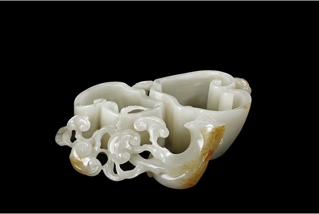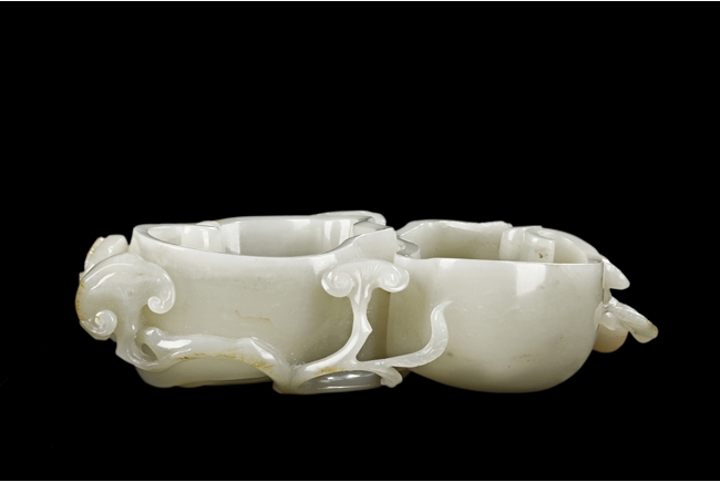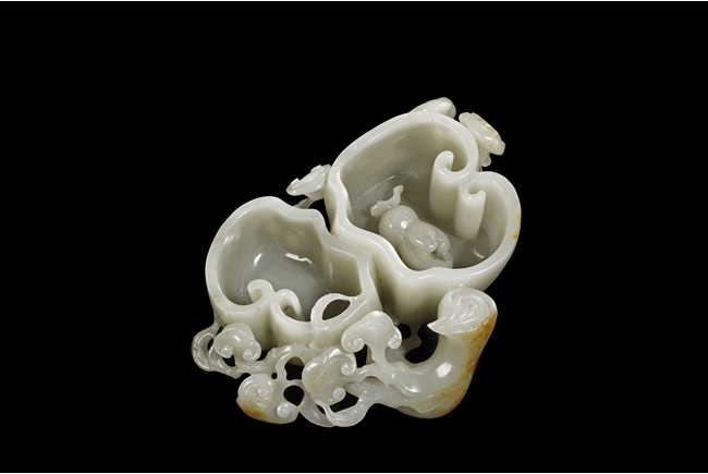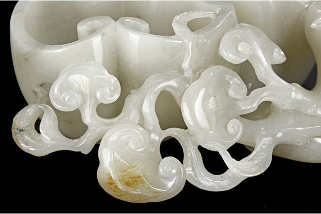 Modelled as two linked Lingzhi shaped receptacle, enveloped around the sides with Lingzhi and gnarled branches, the interior of one receptacle is carved in relief with a Buddha's hand. The stone is of white tone with russet markings and veining on Lingzhi and the main branch.