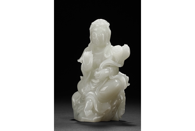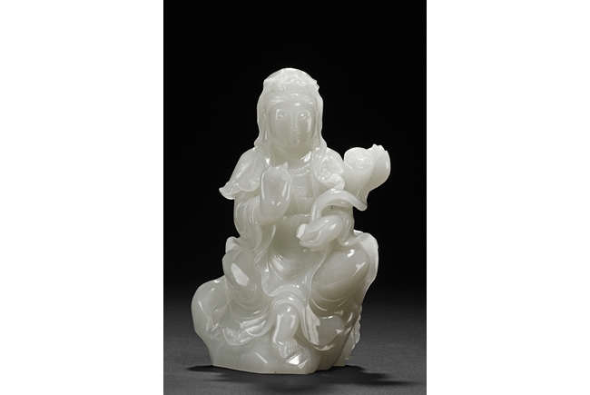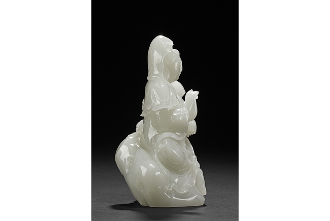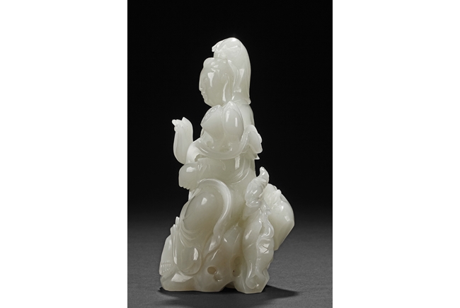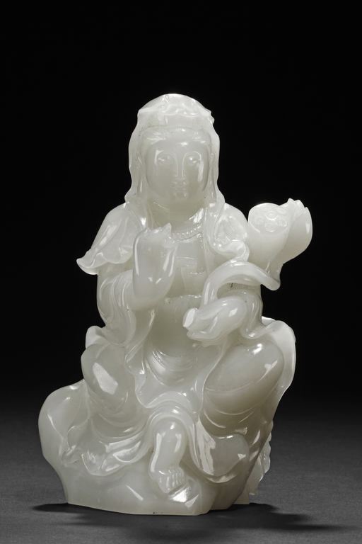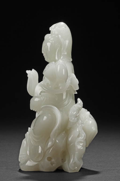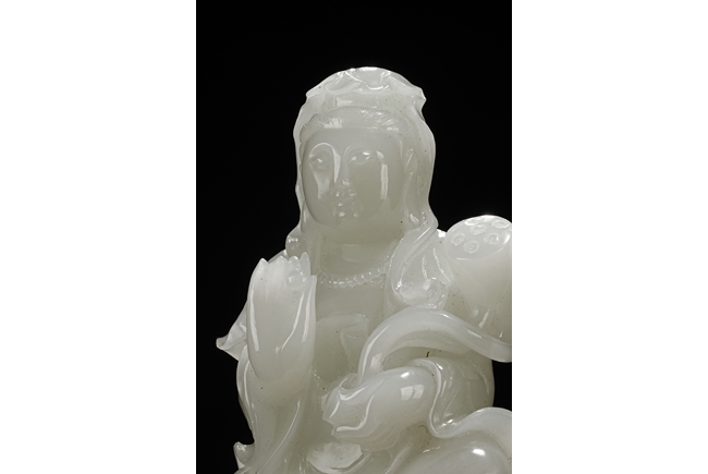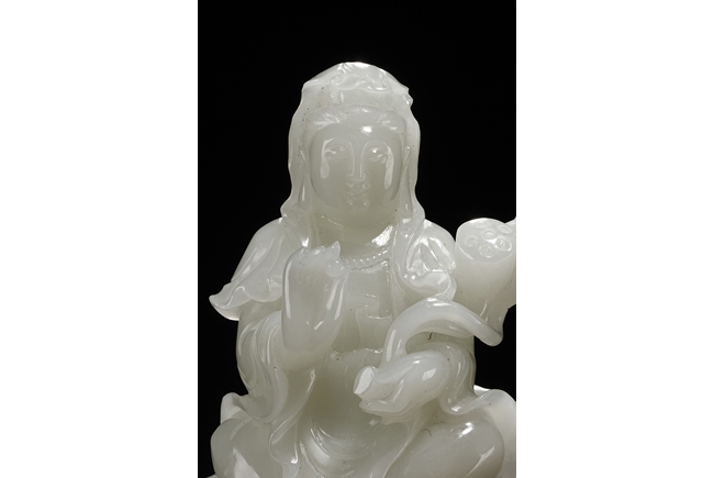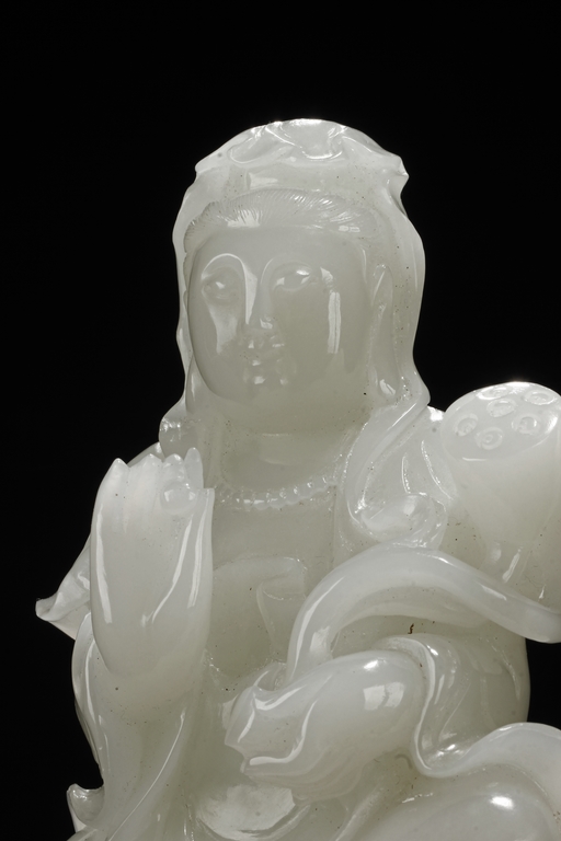 此觀音雕工精細,左手持蓮,右手結說法印,神態莊嚴,面目慈祥