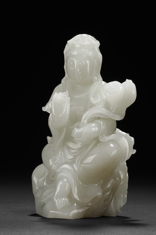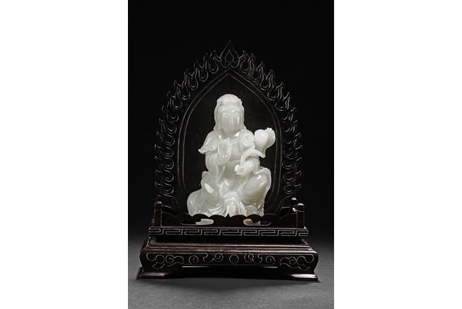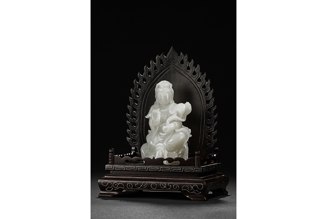 Shown seated with the right foot hiding under the left foot, the Guanyin wears a loose robe showing her bejeweled chest, her face is shown with a serene expression and wears a headdress covering her hair, with right hand raising and left hand holding a large lotus, placed on a carved wooden stand complete with flaming mandorla backdrop.