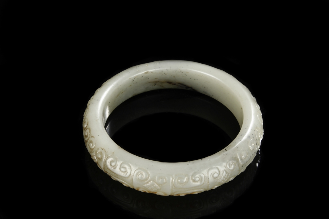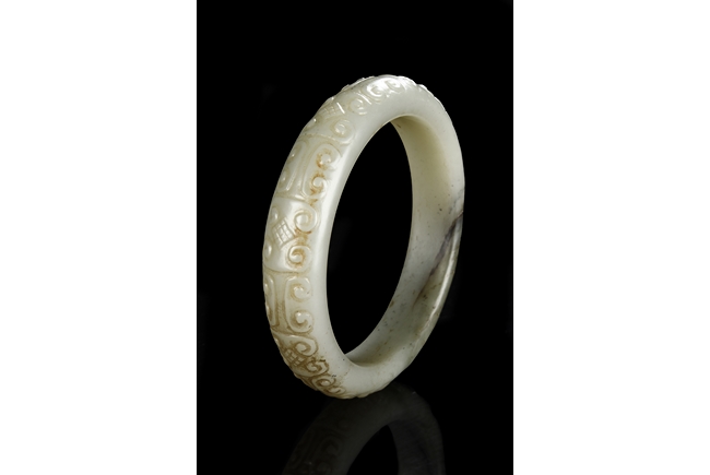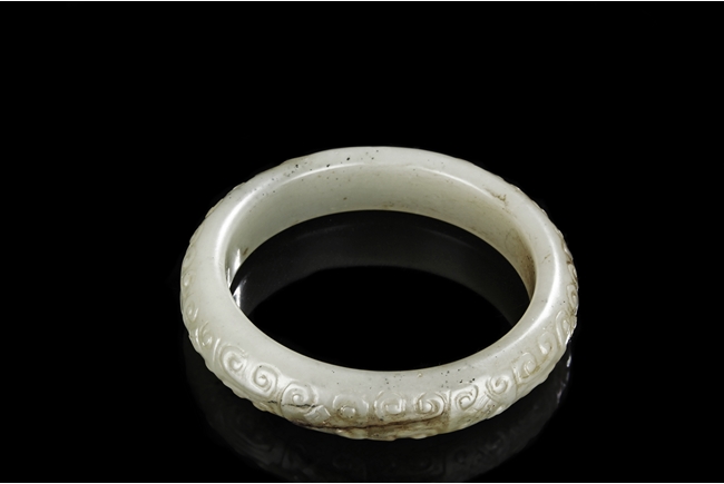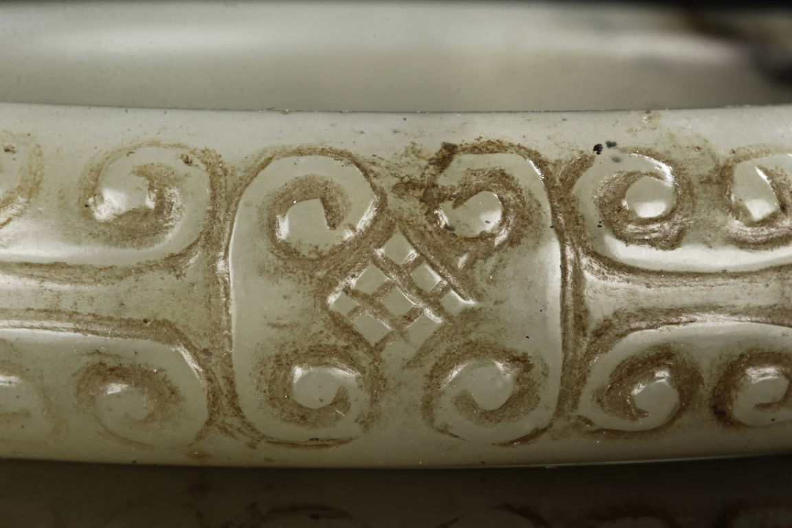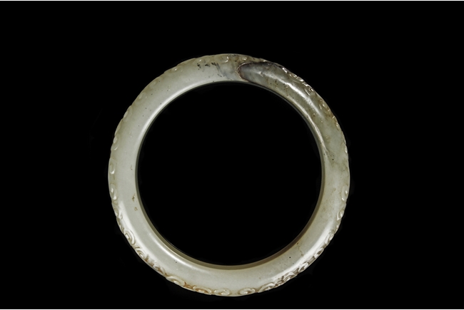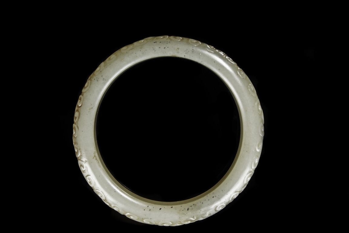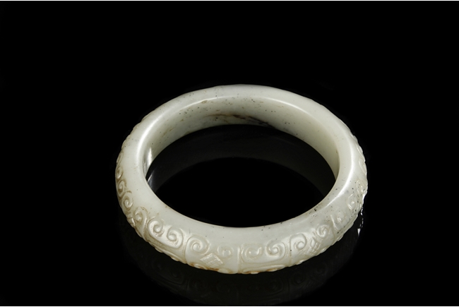 The jade bangle is carved with scrolling stylized cloud motif around the exterior. The stone is of white tone with russet and black markings and veining.