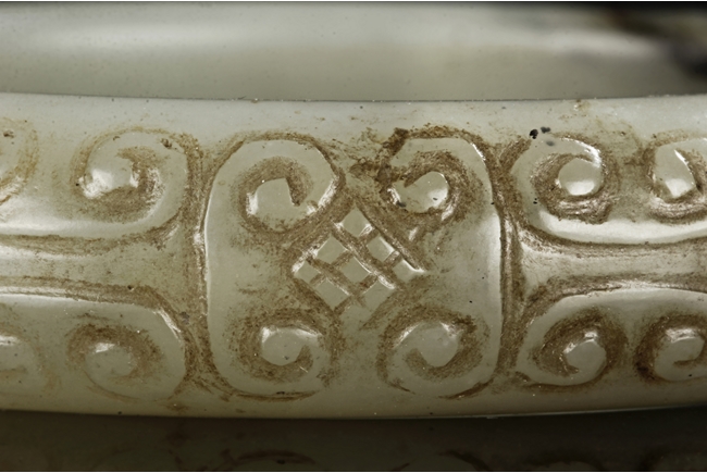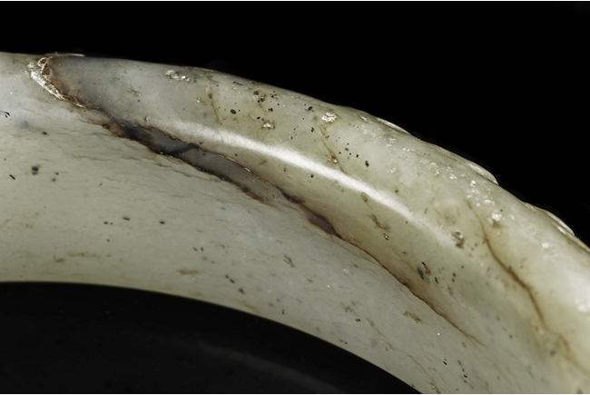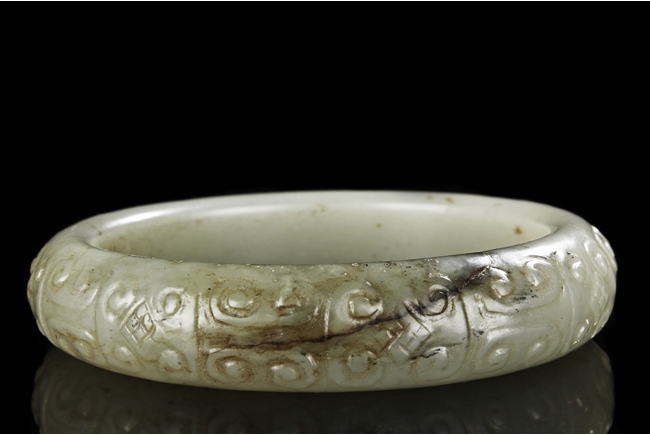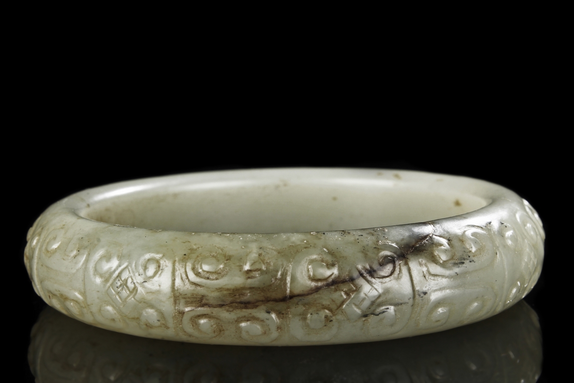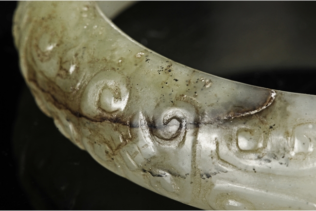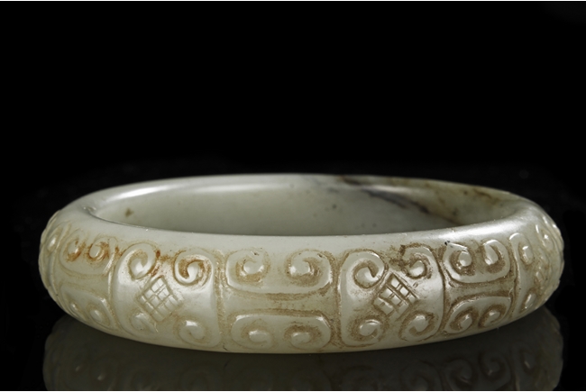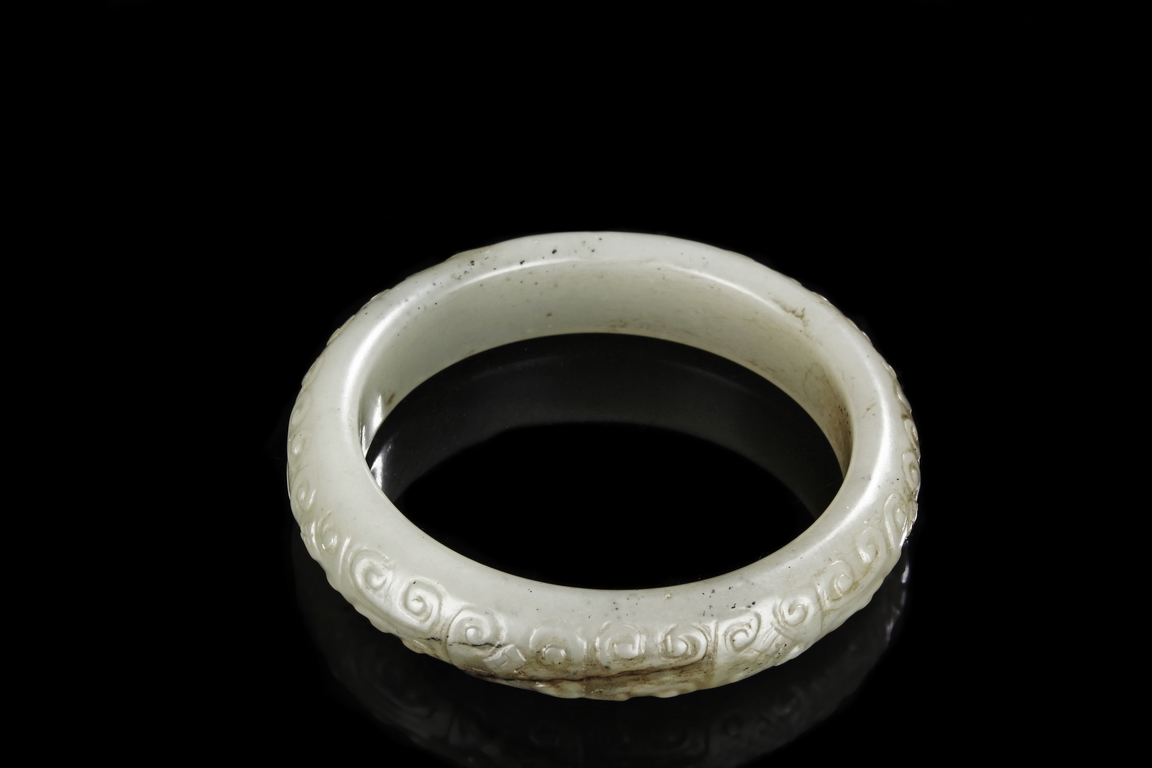 The jade bangle is carved with scrolling stylized cloud motif around the exterior. The stone is of white tone with russet and black markings and veining.