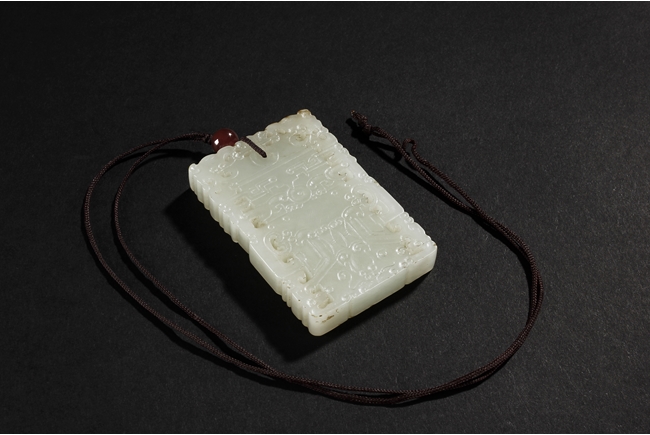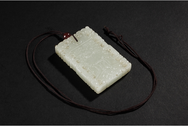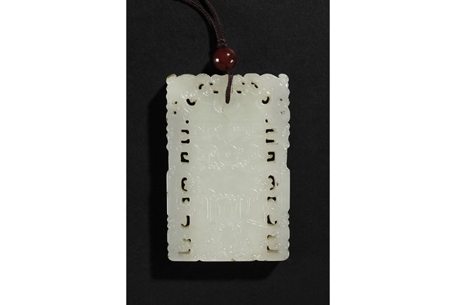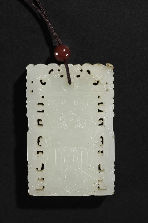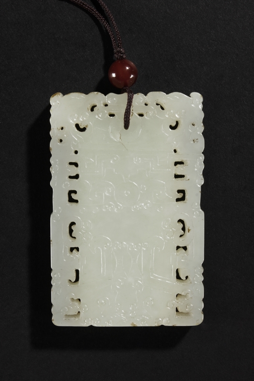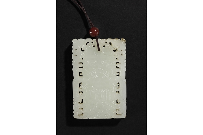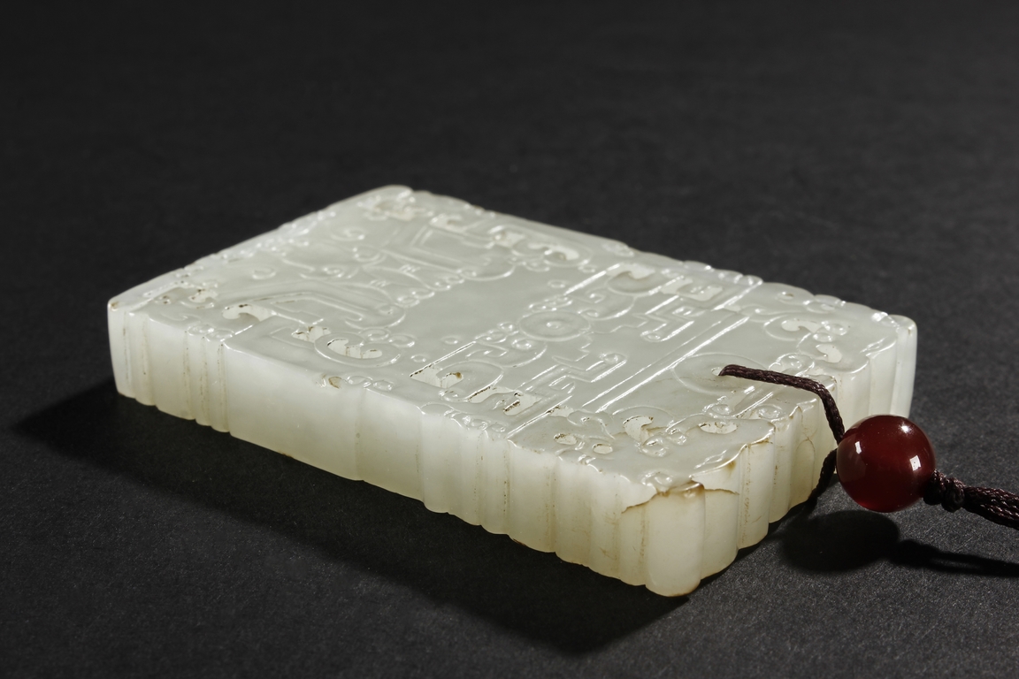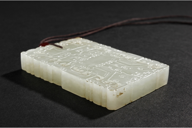 The plaque is carved in low relief to both sides with archaic motif. The stone is of whitish celadon tone.