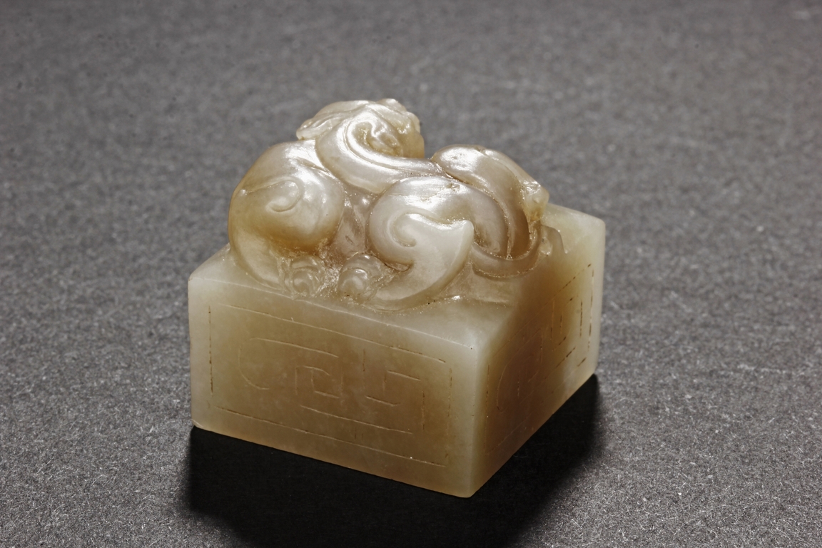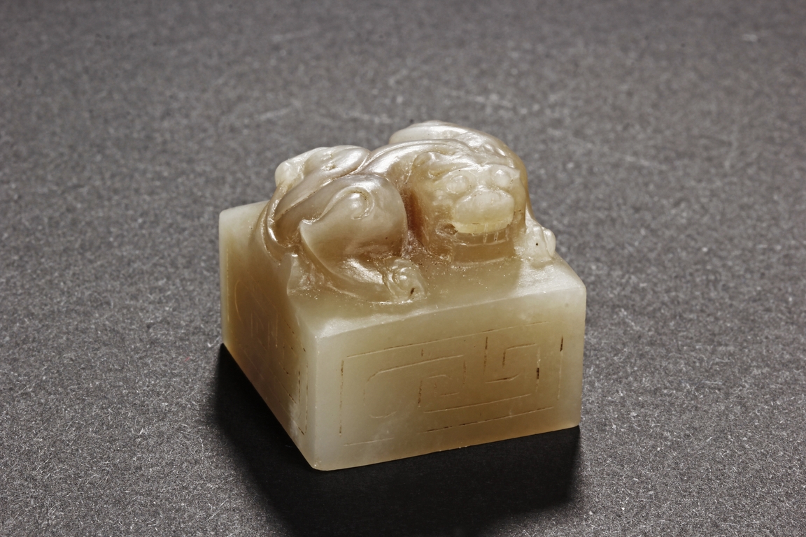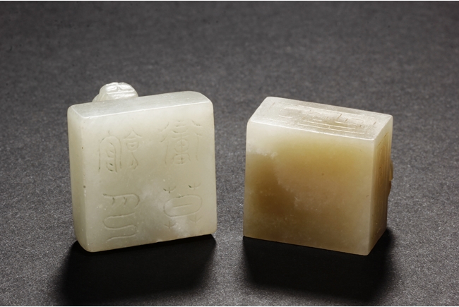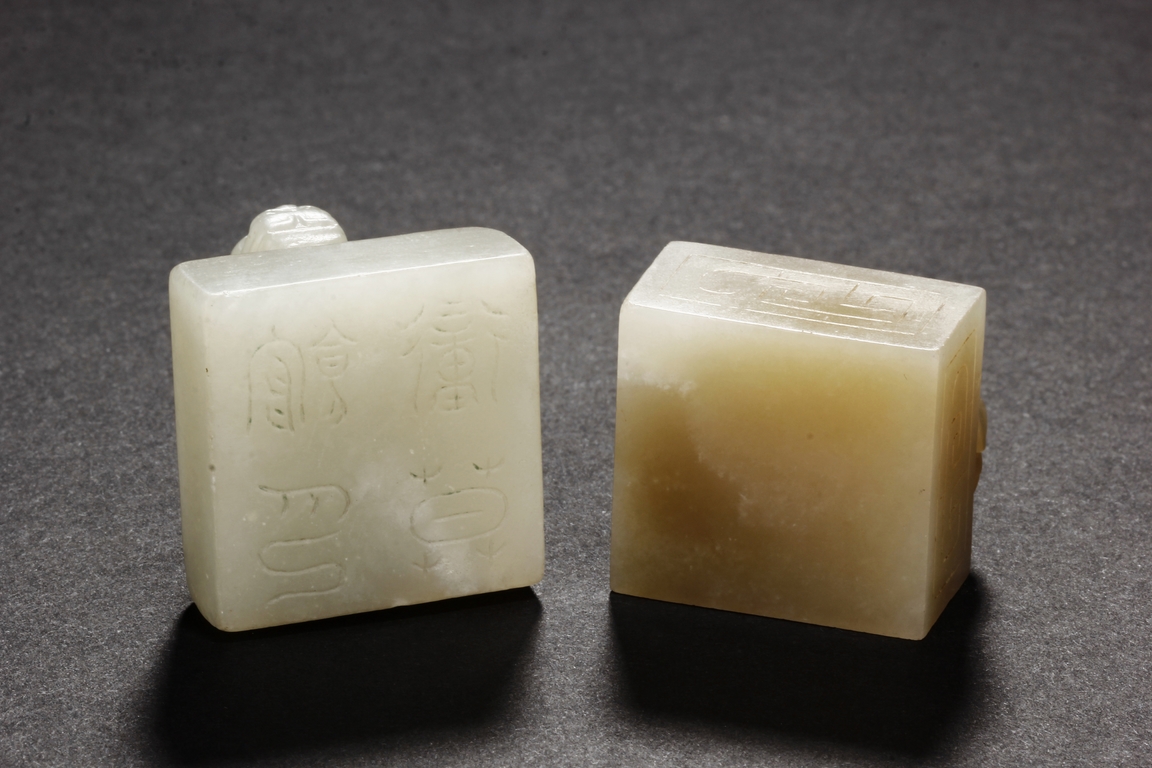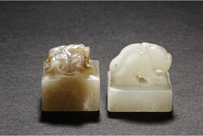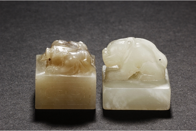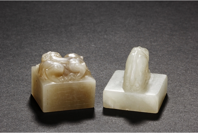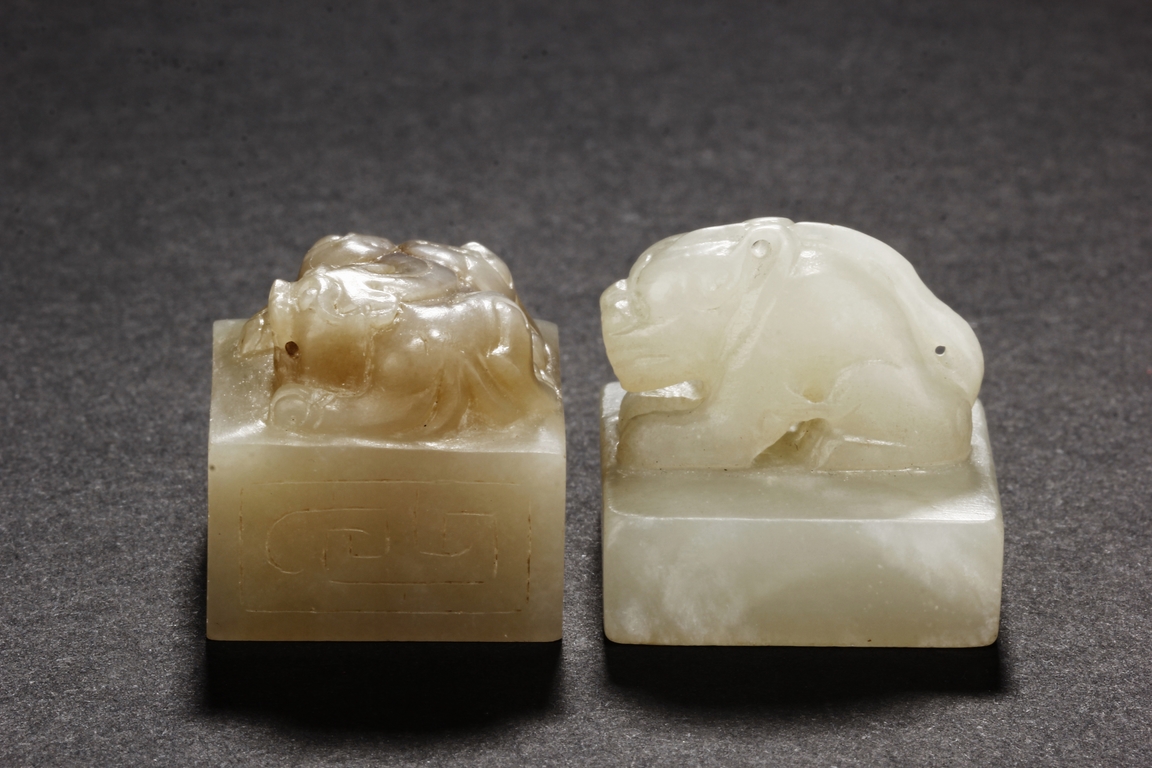 One stamp seal is of compressed square form, a mythical beast chi-long mounted on the top, with head turned sideways, the sides lightly carved with maze-like patterns, the bottom uncarved, the stone of white color with brown russet. The other stamp seal has a mythical beast seated with two hind legs, situated on top of a compressed square stamp, the stone of grayish white, four characters carved on the bottom.