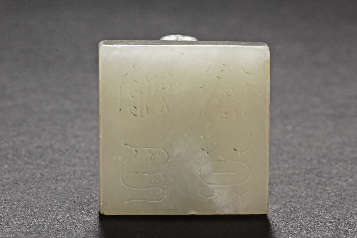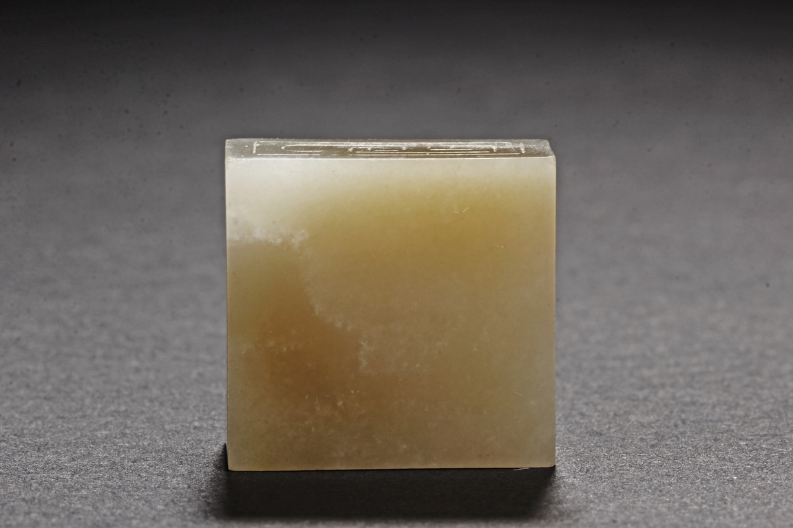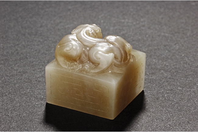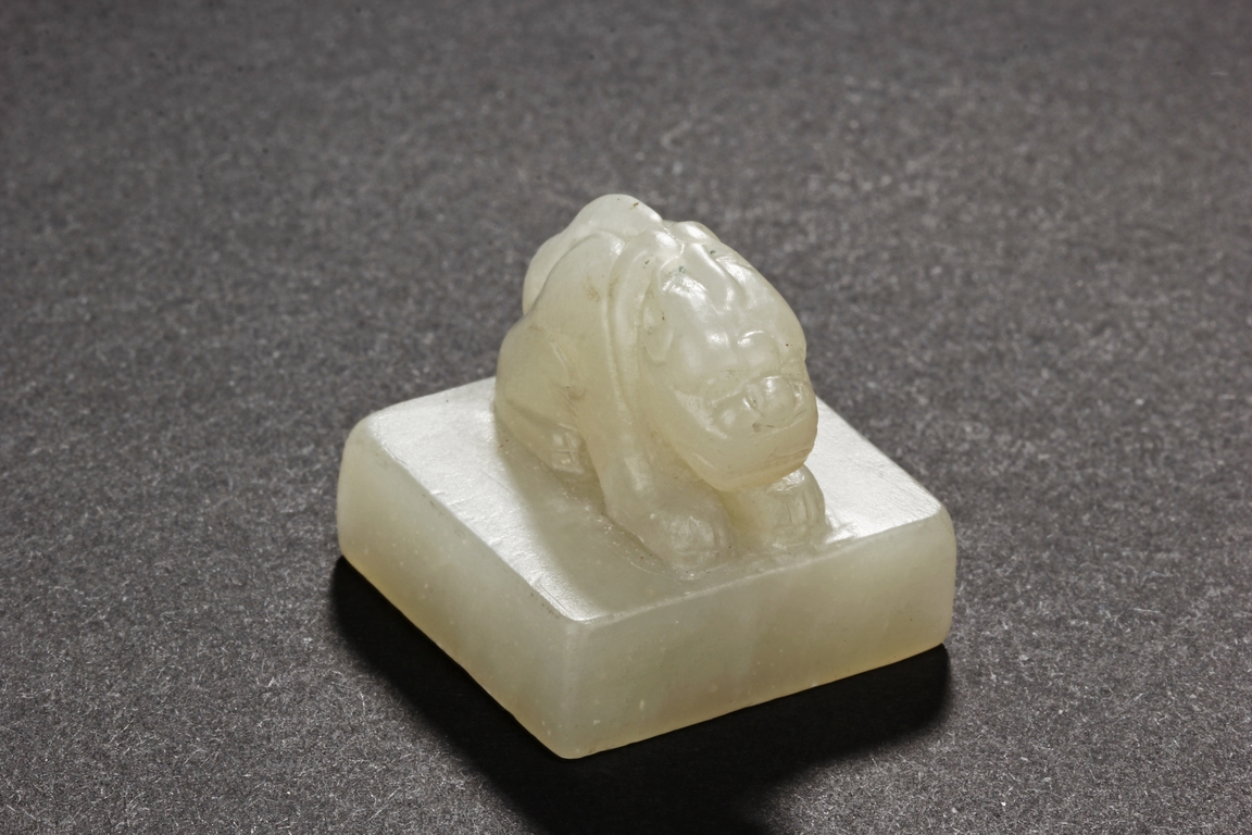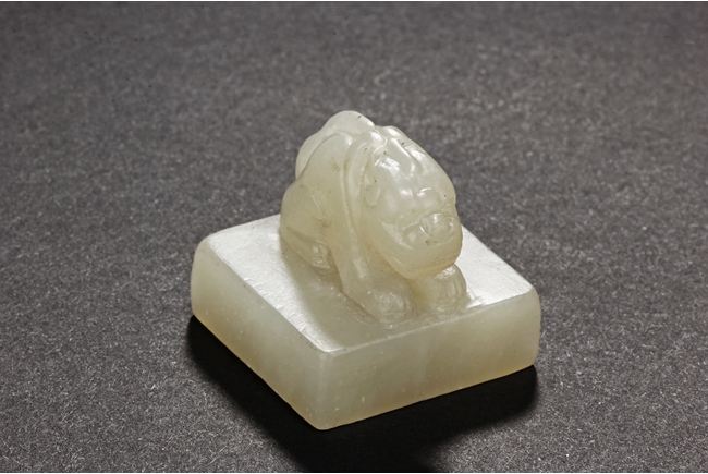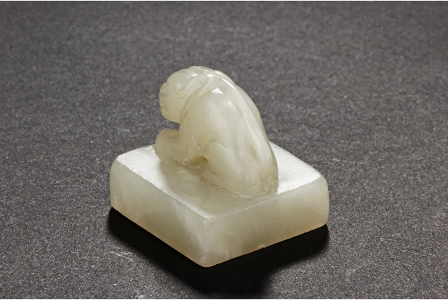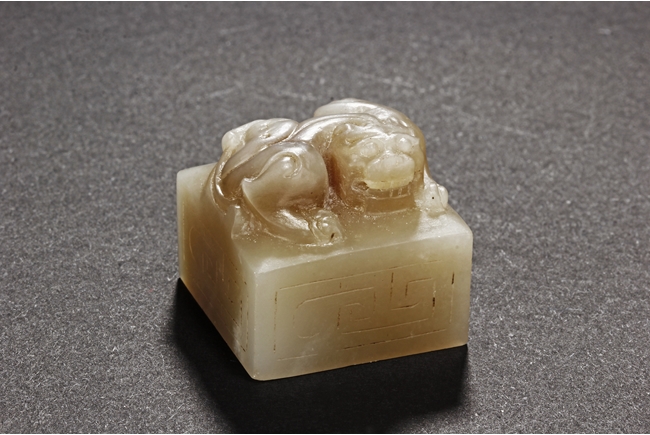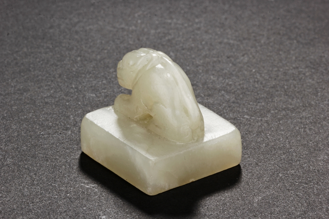 One stamp seal is of compressed square form, a mythical beast chi-long mounted on the top, with head turned sideways, the sides lightly carved with maze-like patterns, the bottom uncarved, the stone of white color with brown russet. The other stamp seal has a mythical beast seated with two hind legs, situated on top of a compressed square stamp, the stone of grayish white, four characters carved on the bottom.
