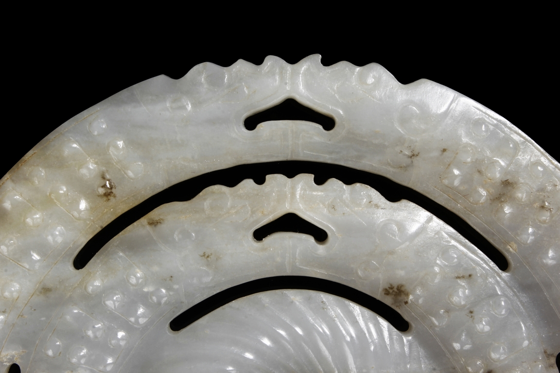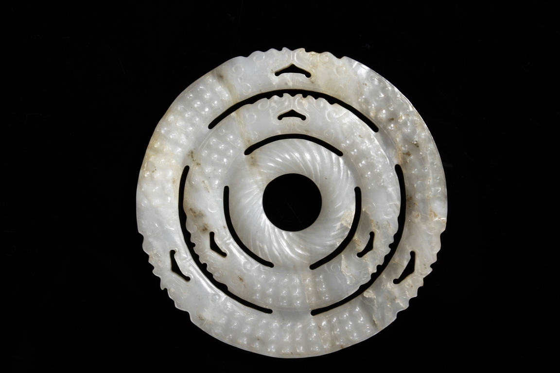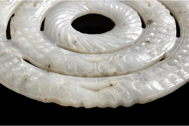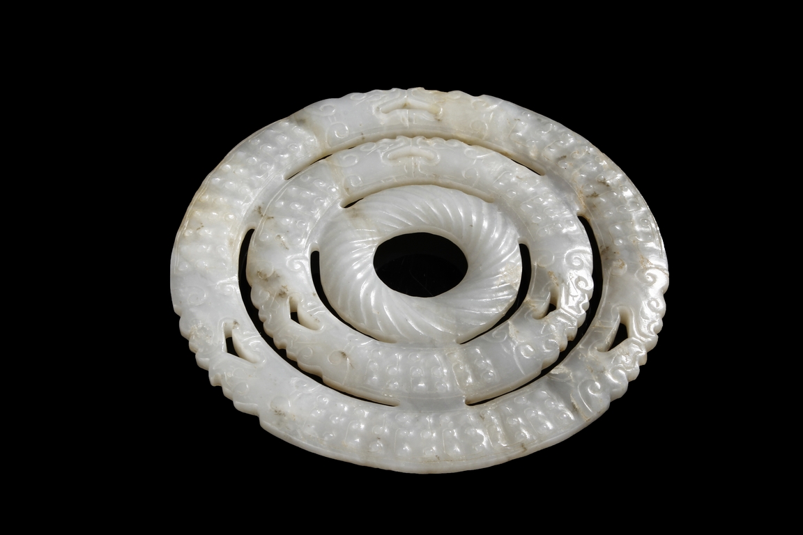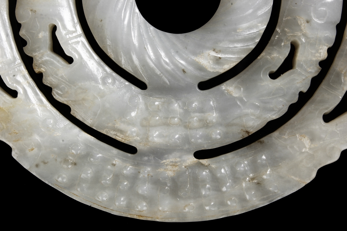 The jade pendant formed from three attached rings, with uniform width but different design, such as spiral, dotted, and arrow patterns, the reverse with same theme, the stone is of grayish-white tone with translucency.