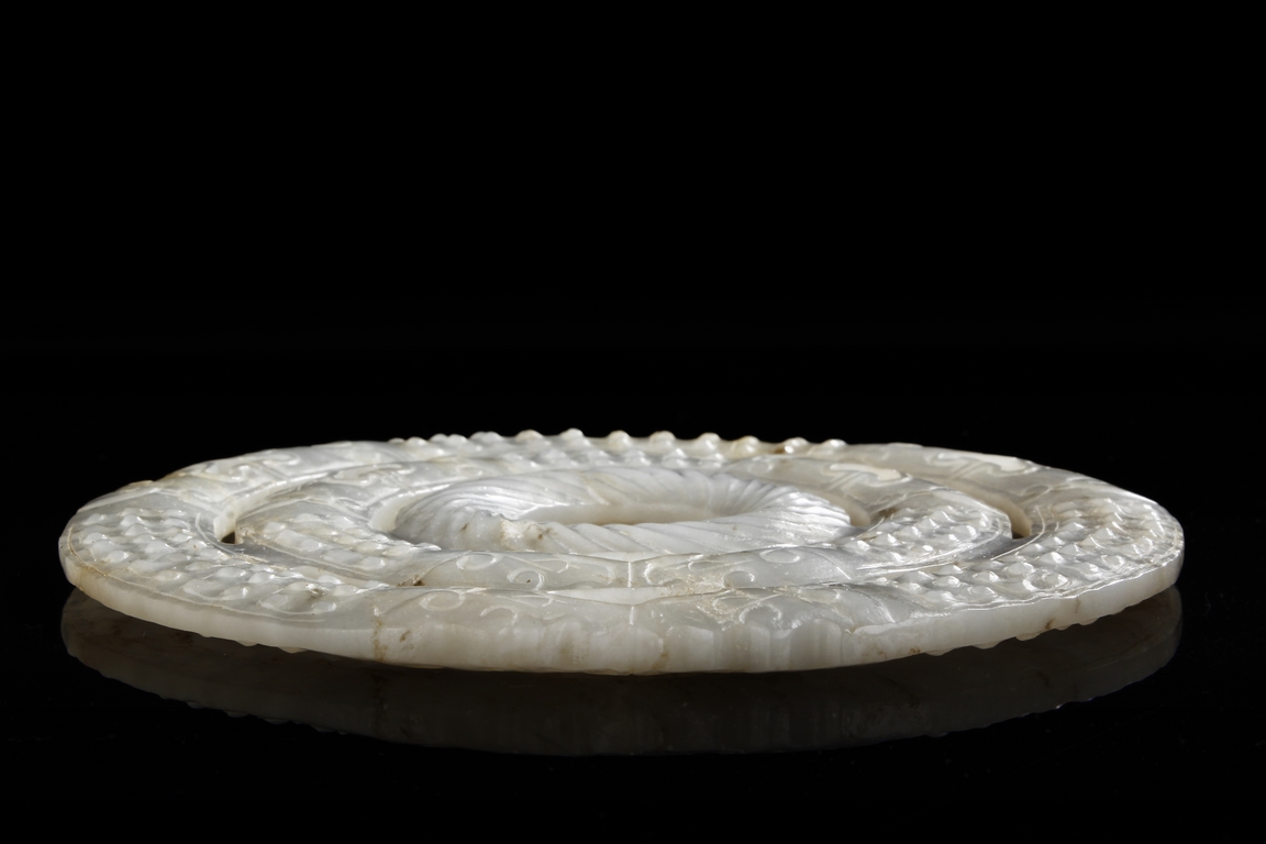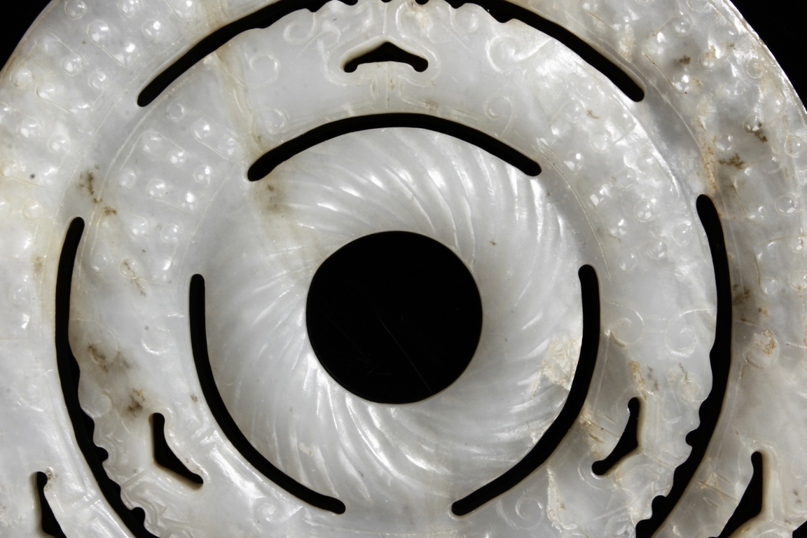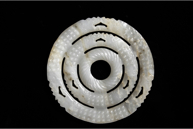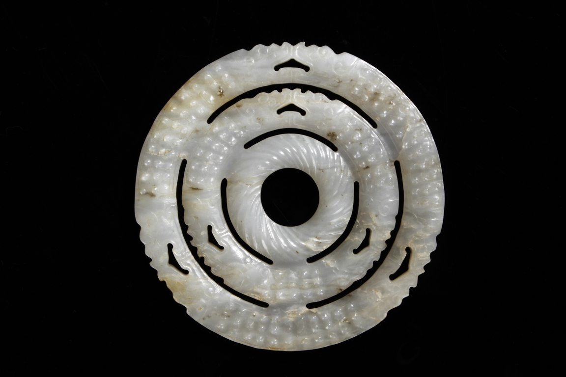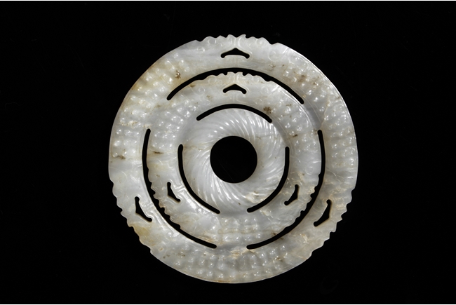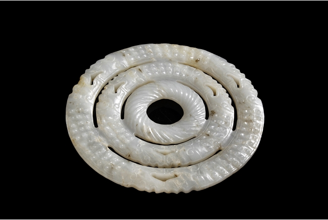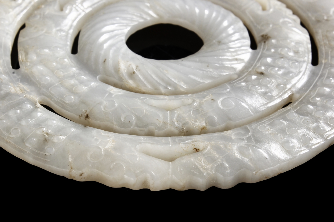 The jade pendant formed from three attached rings, with uniform width but different design, such as spiral, dotted, and arrow patterns, the reverse with same theme, the stone is of grayish-white tone with translucency.