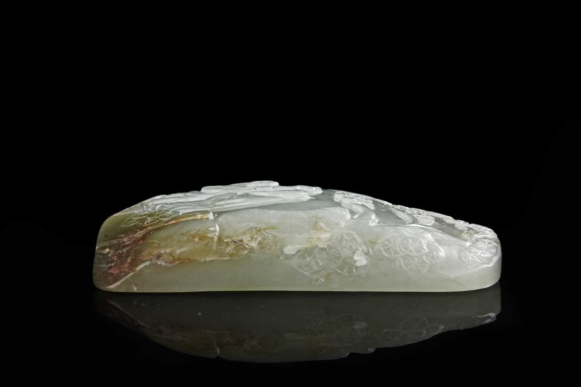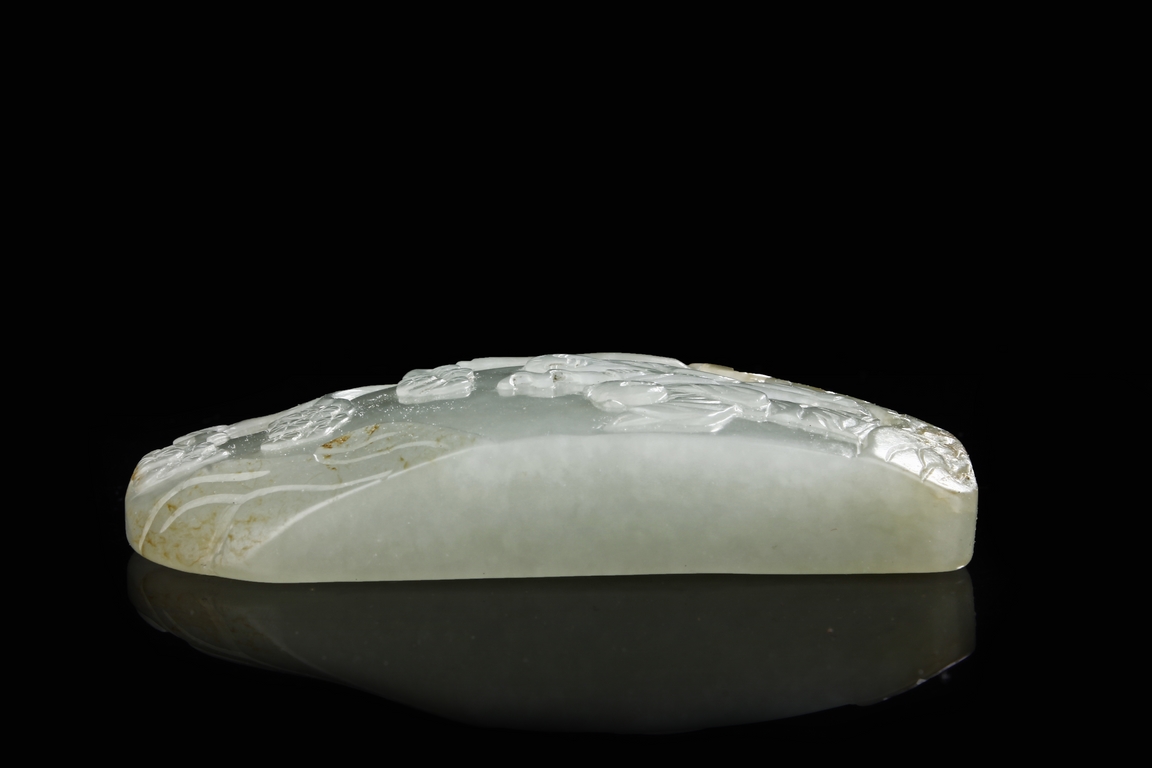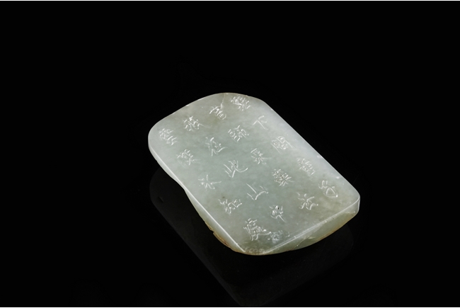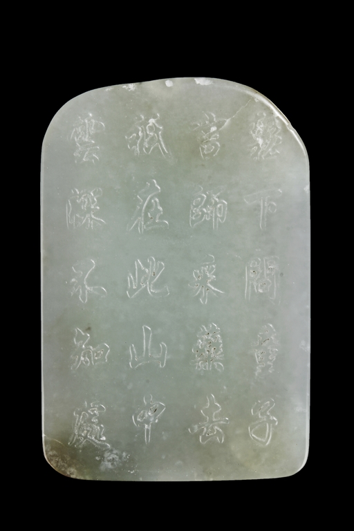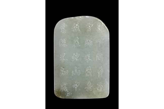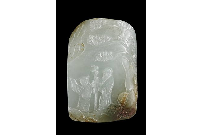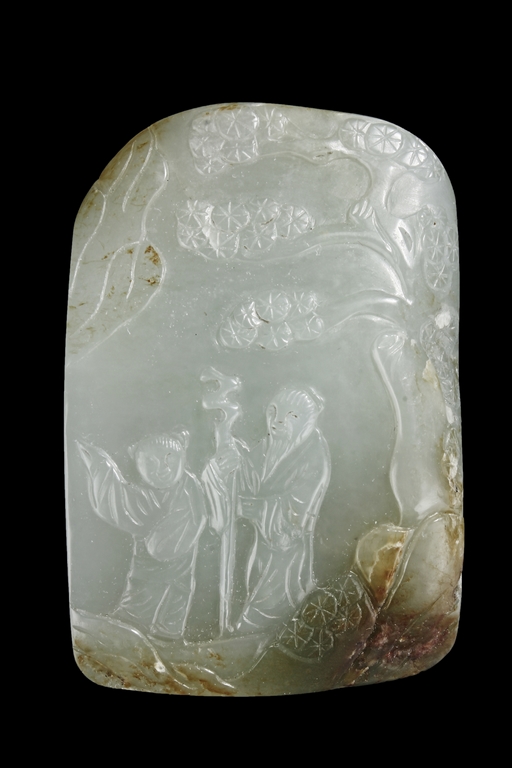 Carved on rectangular celadon jade with curved and uneven corners, one side depicts an elder conversing with a young attendant under the pine tree, the reverse carved with poetry calligraphy.