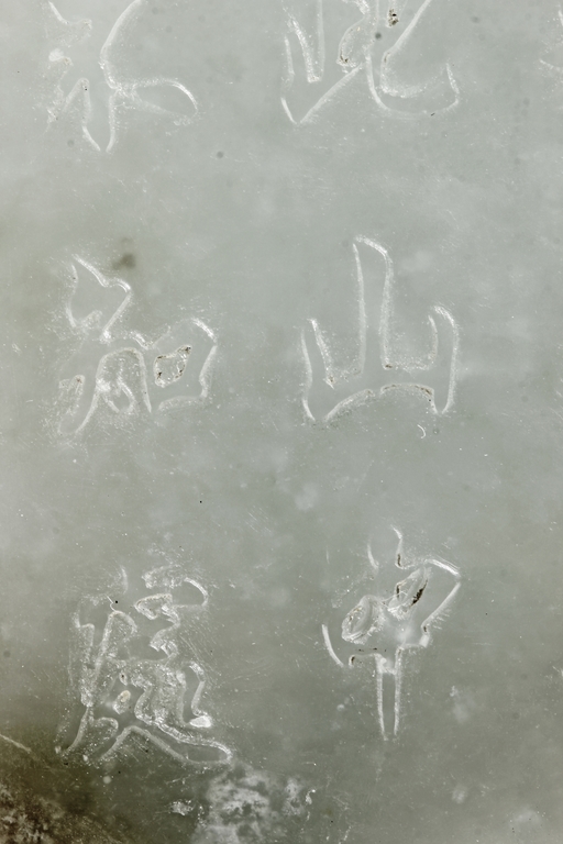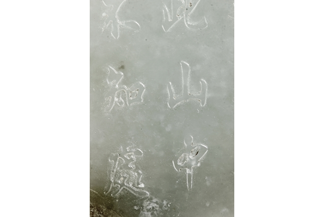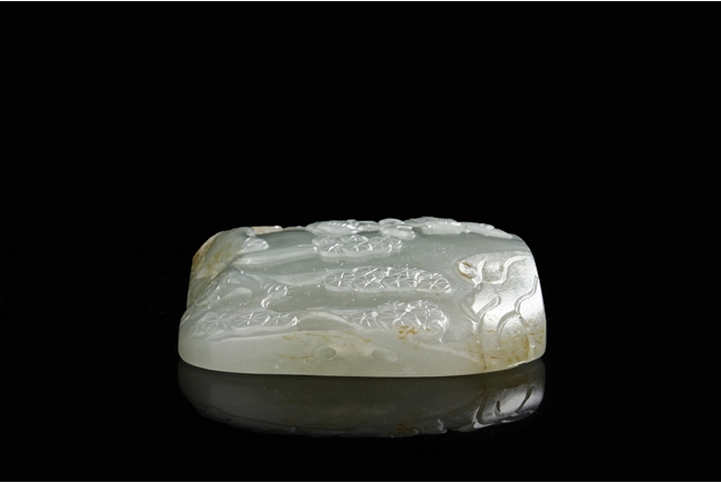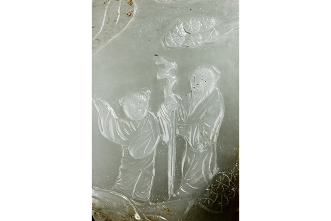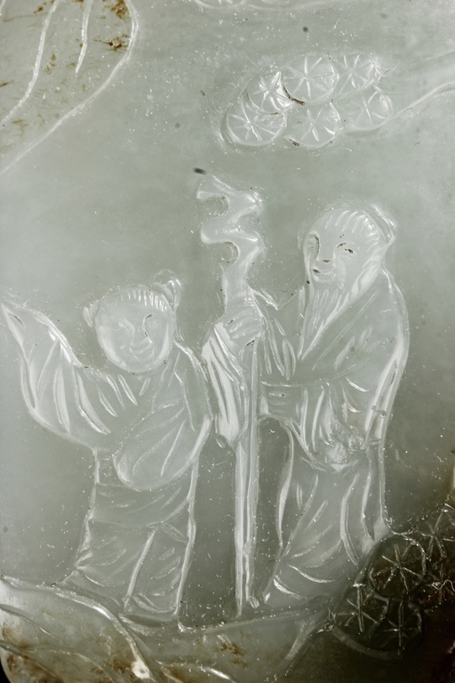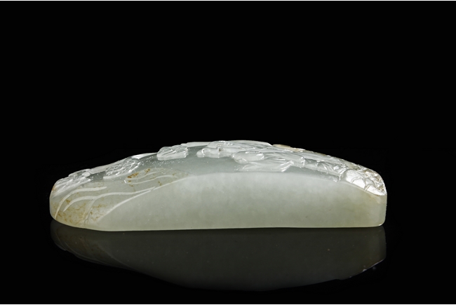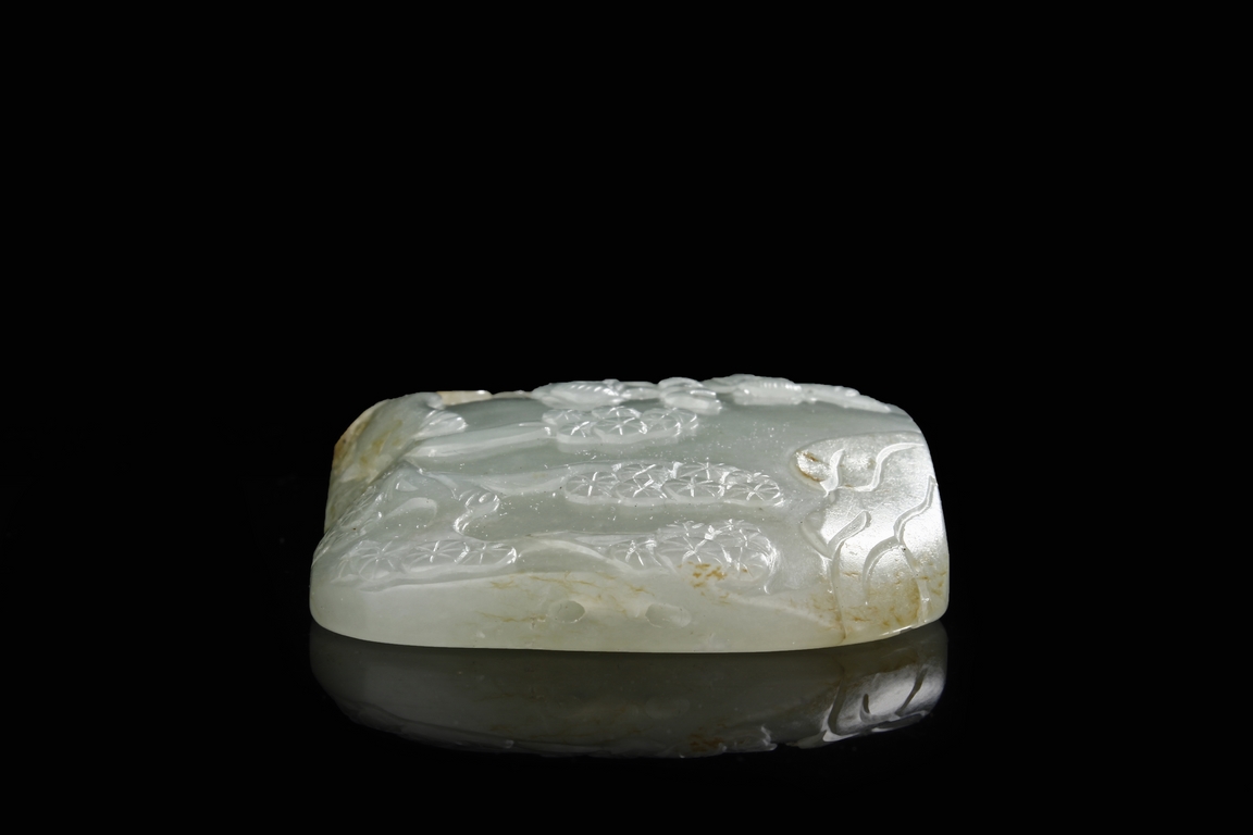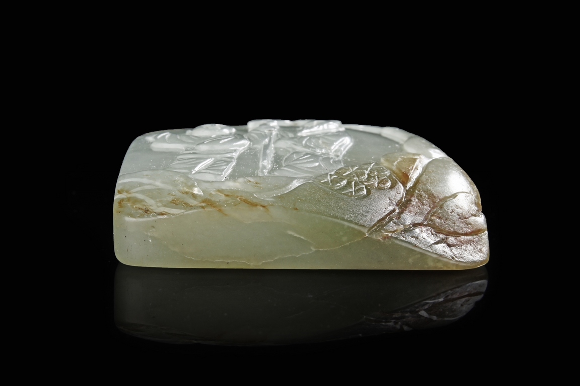 Carved on rectangular celadon jade with curved and uneven corners, one side depicts an elder conversing with a young attendant under the pine tree, the reverse carved with poetry calligraphy.