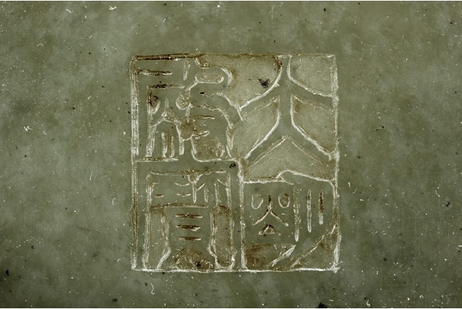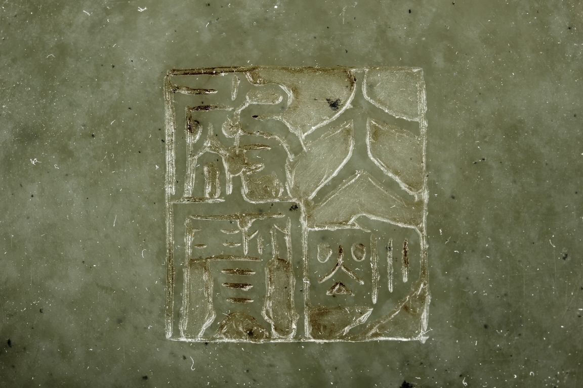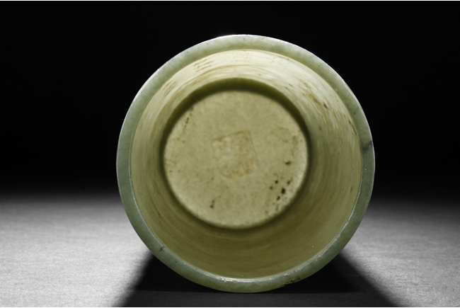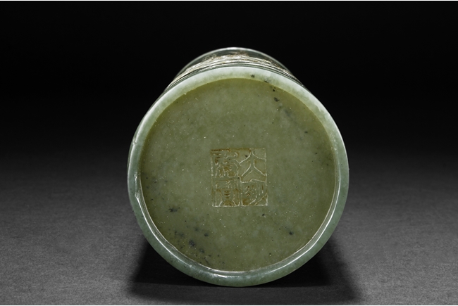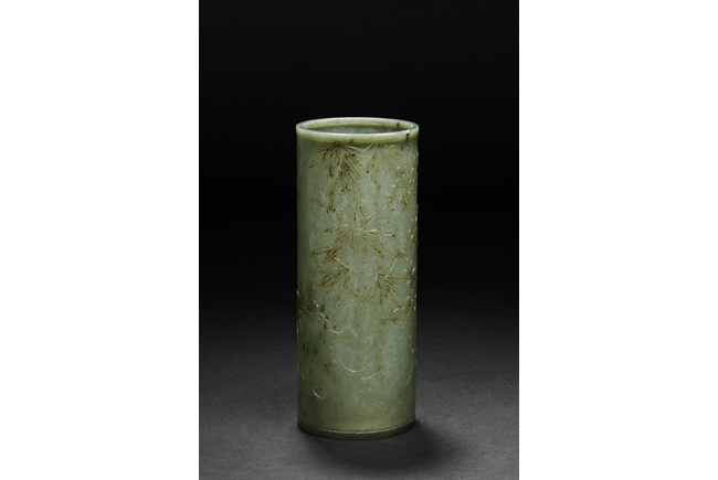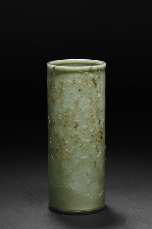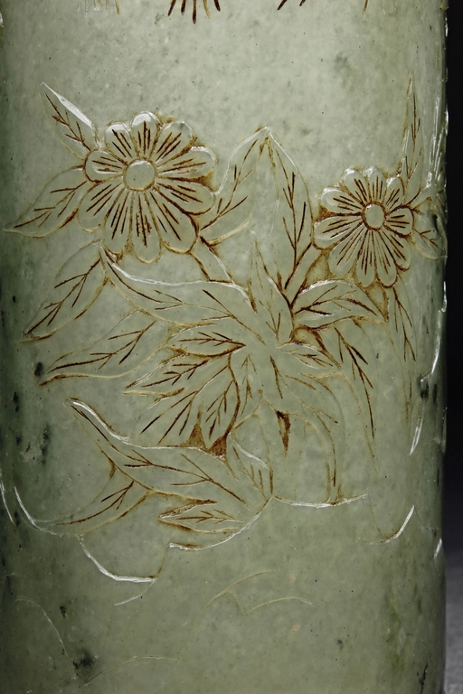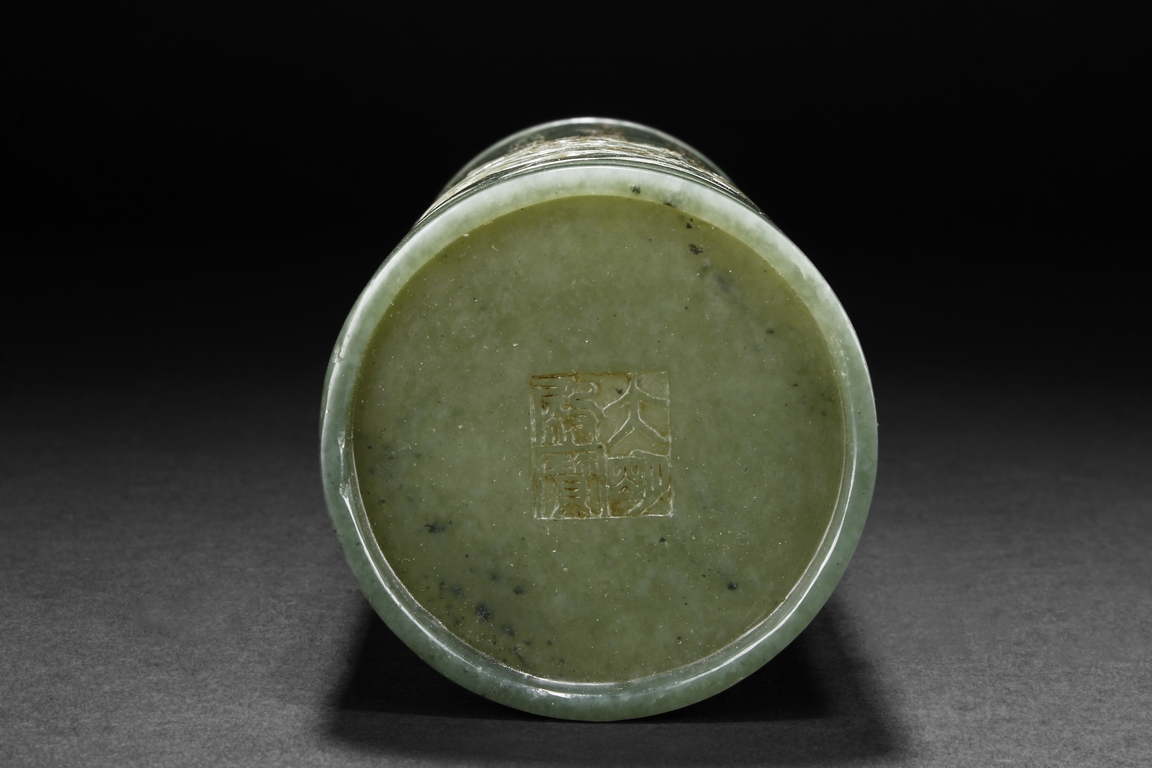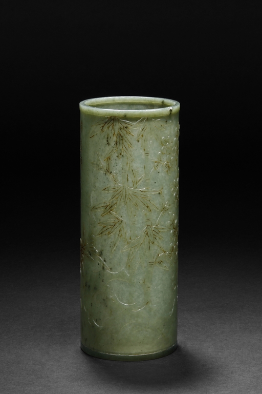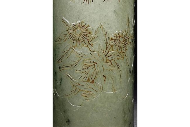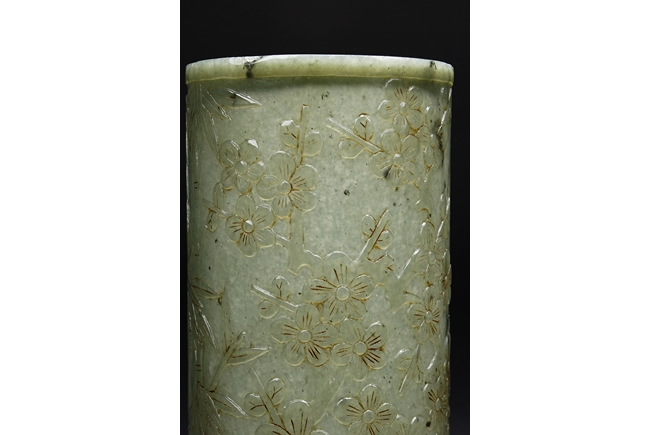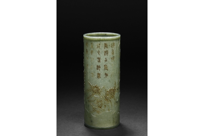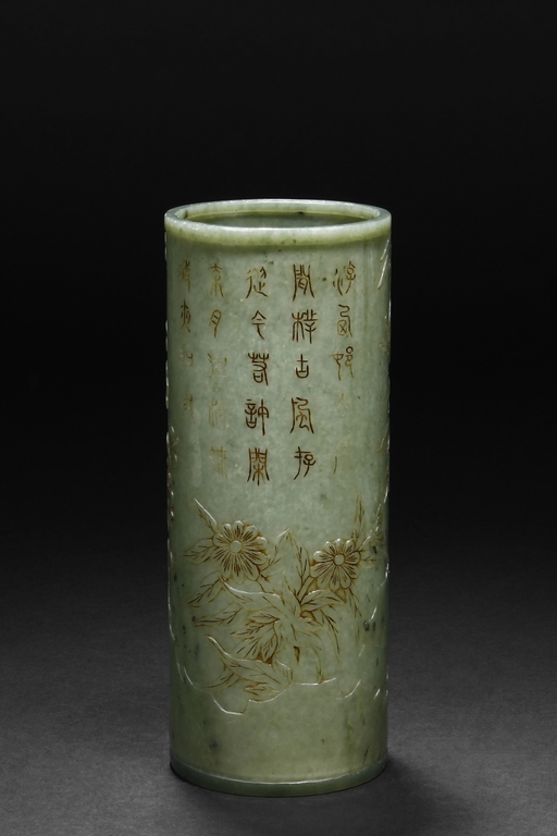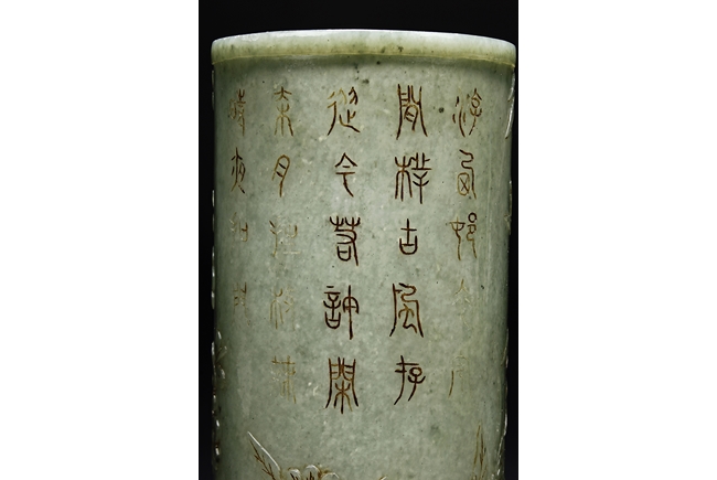 The brush pot is carved in cylindrical form, the exterior finely incised with poems in seal format, above a continuous landscape of plum, chrysanthemum, and bamboo issuing from rock-work. The bottom bears four character mark. The stone is of celadon tone.