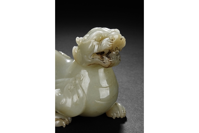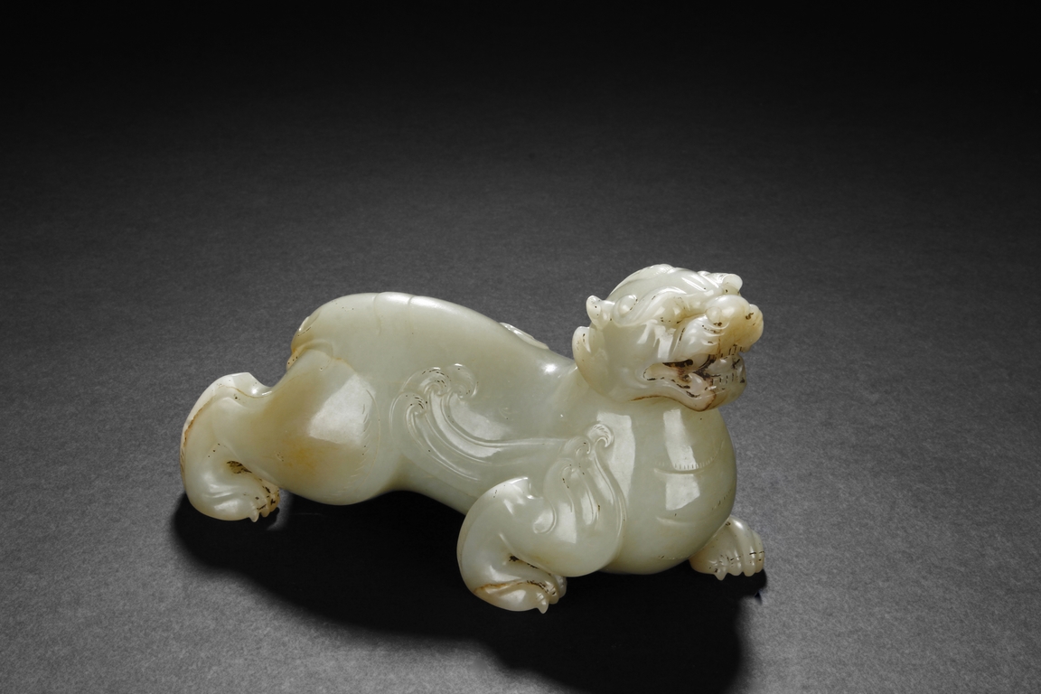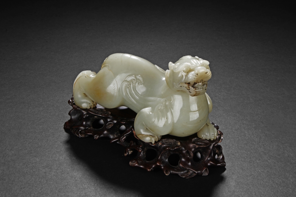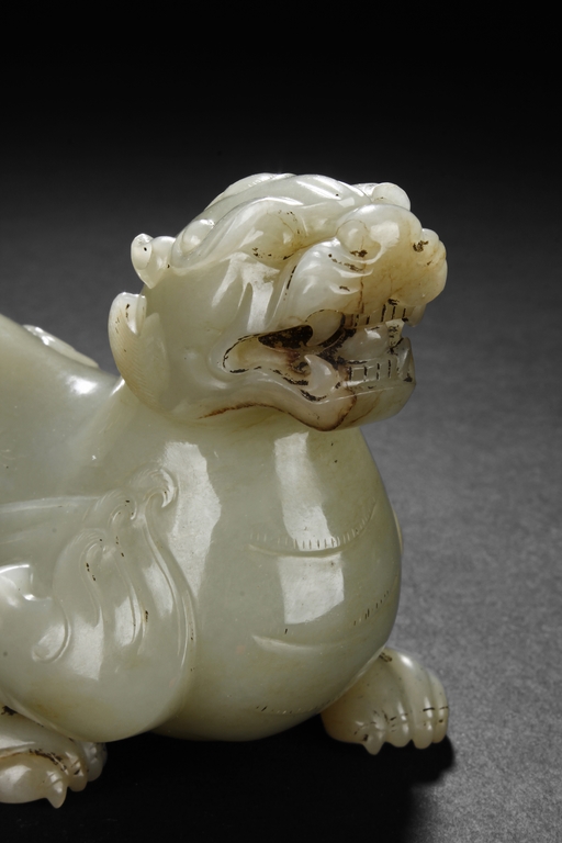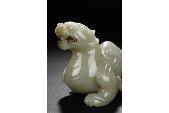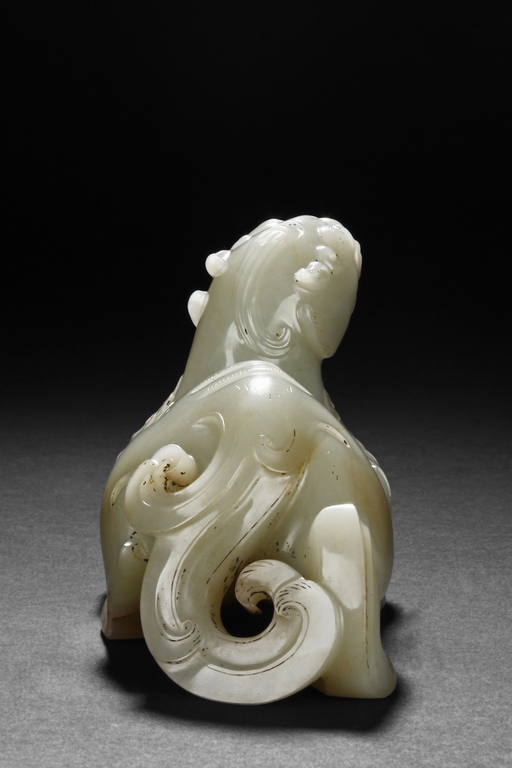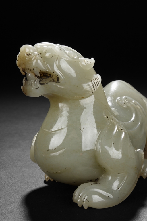 The figure is carved in alert position, shown with mouth open revealing the sharp teeth, the eyes wide open and thick eyebrows, with two scrolling wings to its shoulder,the paws detailed with bared claws, its tails bifurcates. The stone is of celadon tone with minor russet areas.