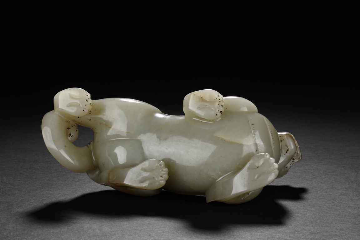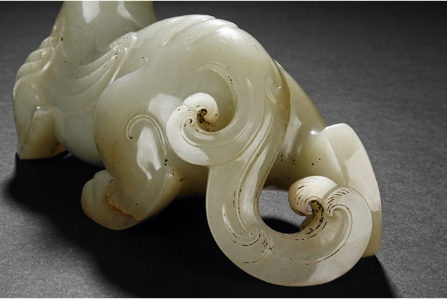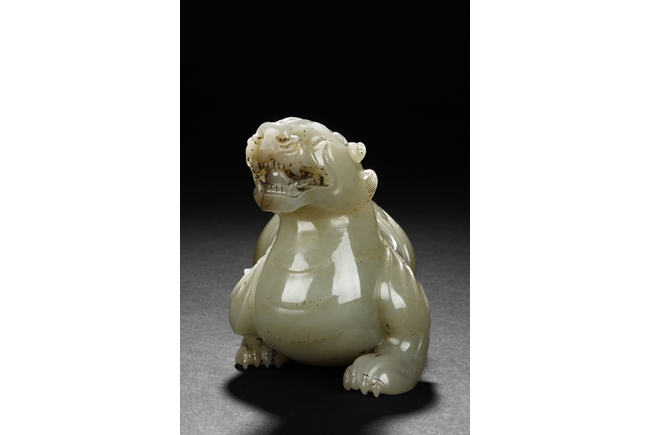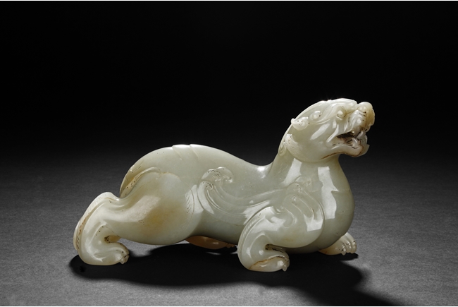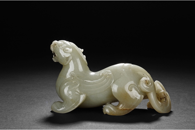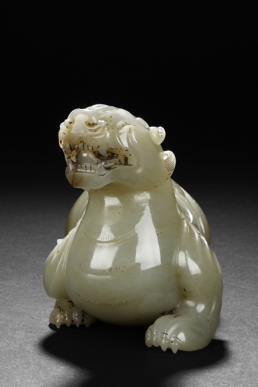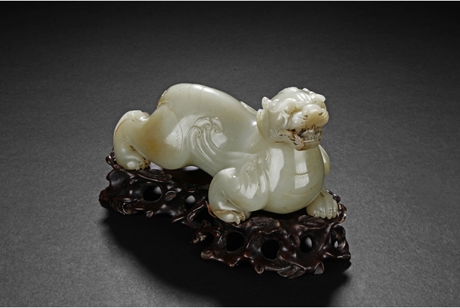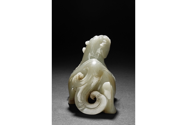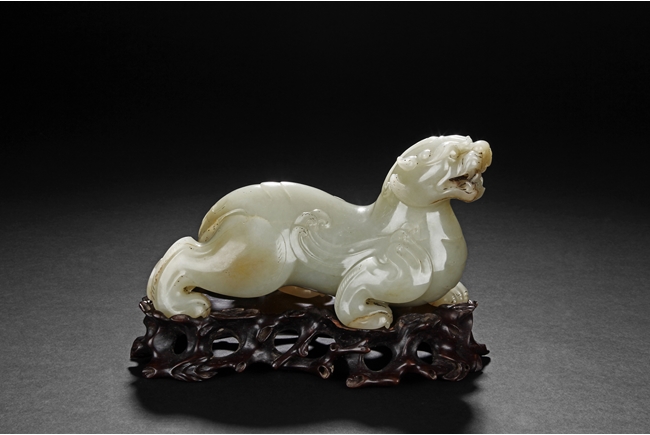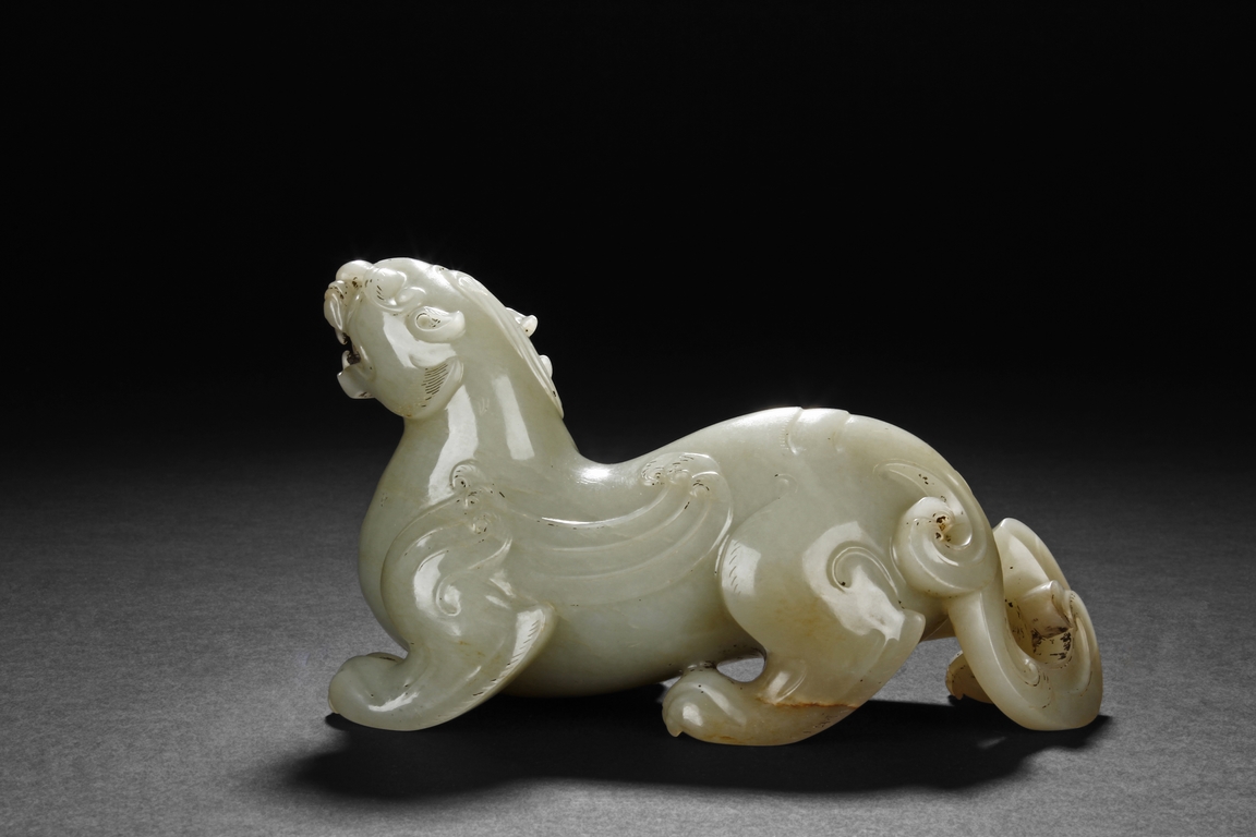 The figure is carved in alert position, shown with mouth open revealing the sharp teeth, the eyes wide open and thick eyebrows, with two scrolling wings to its shoulder,the paws detailed with bared claws, its tails bifurcates. The stone is of celadon tone with minor russet areas.