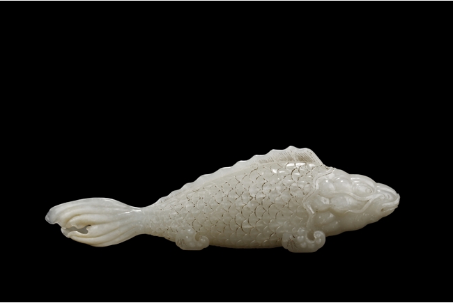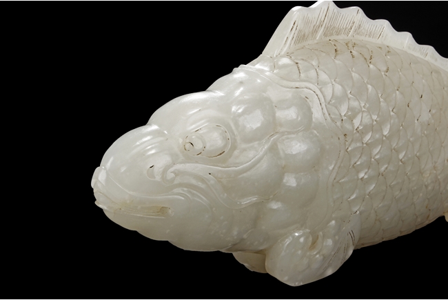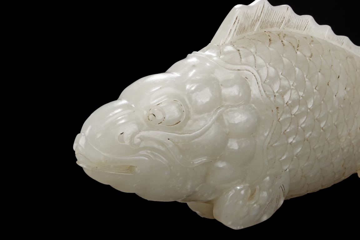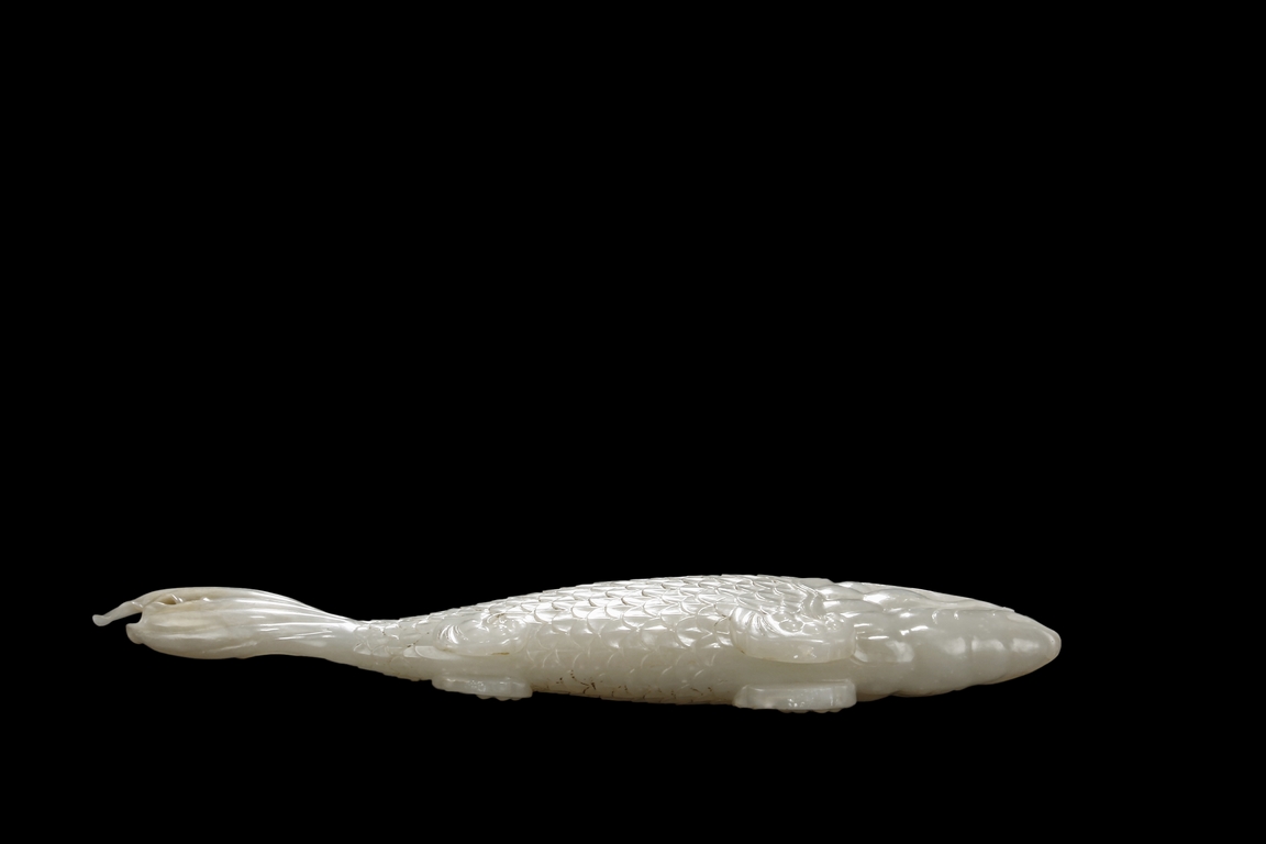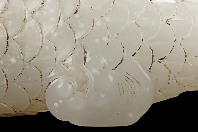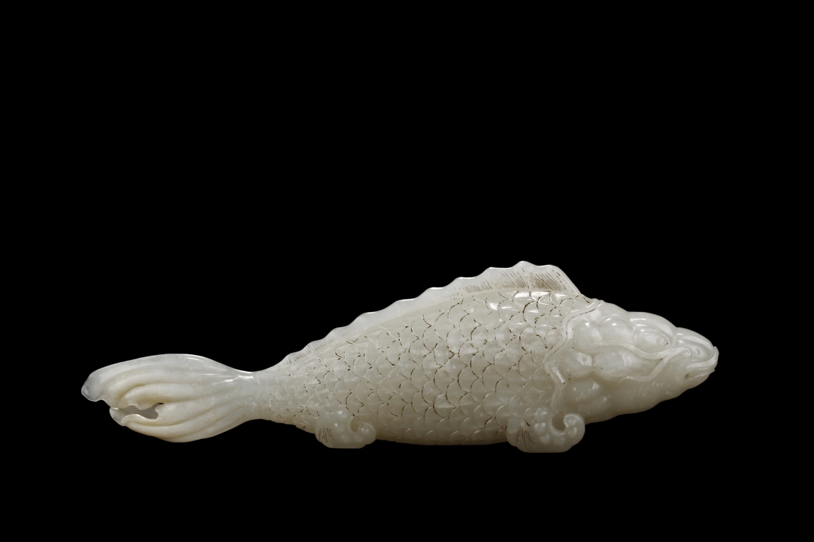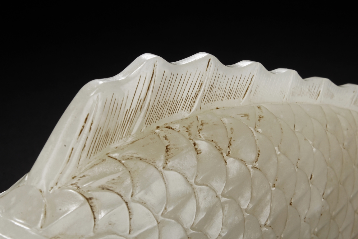 The fish model is realistically carved with highly detailed incised fins and scales, the body raised above a small section of swirled water, the stone is of white tone.