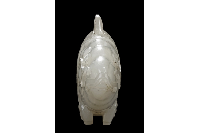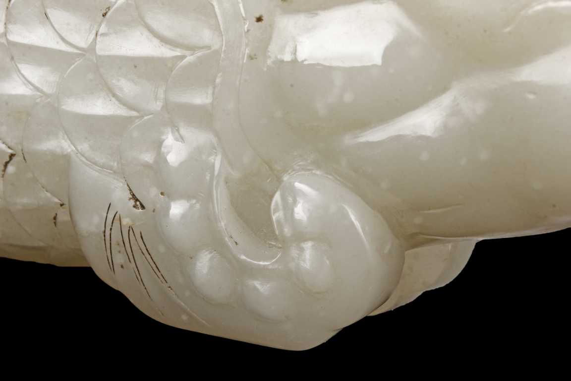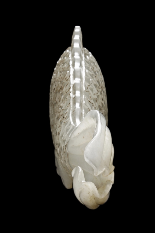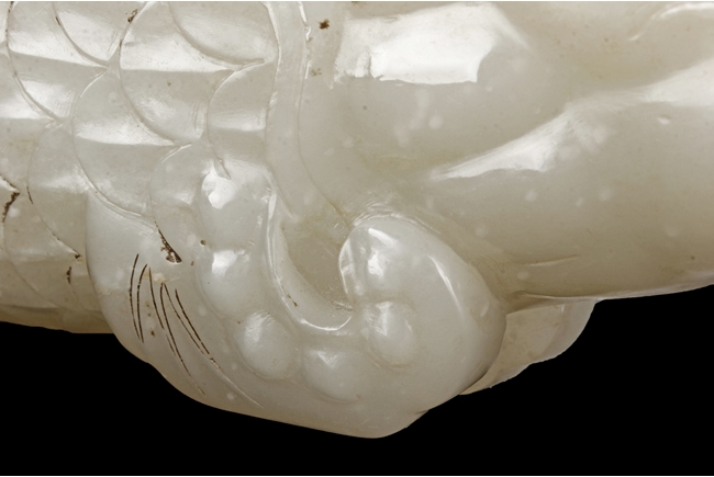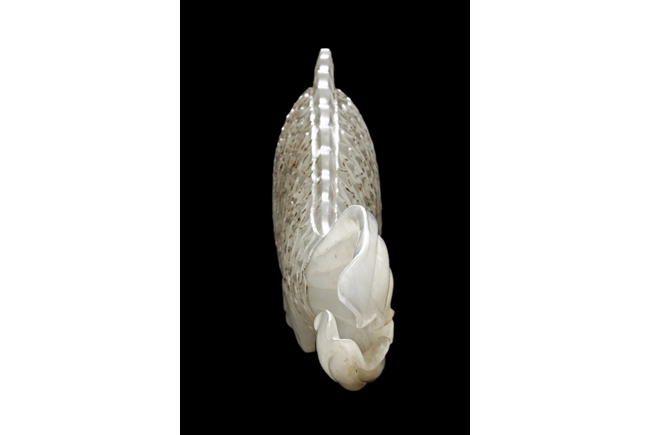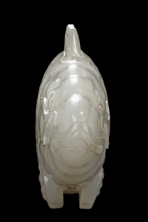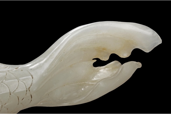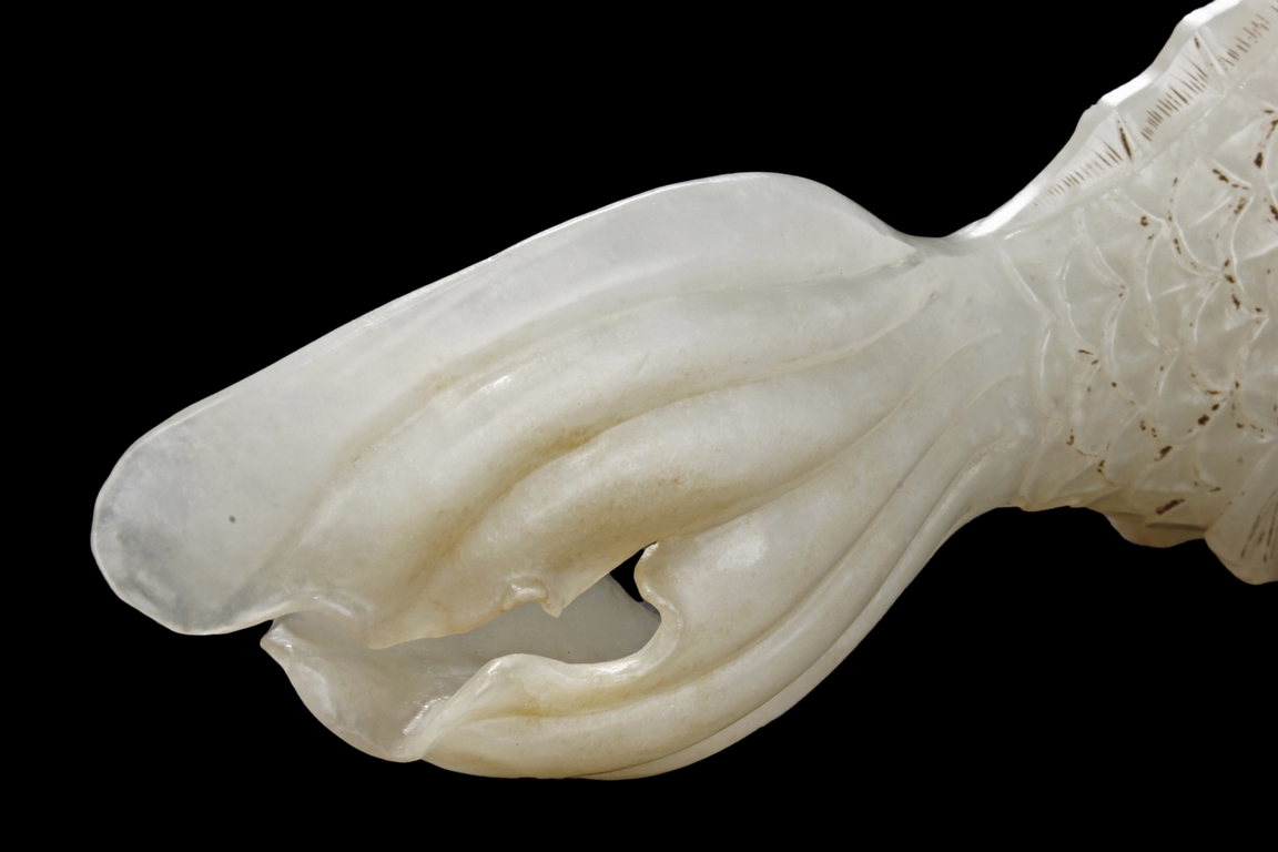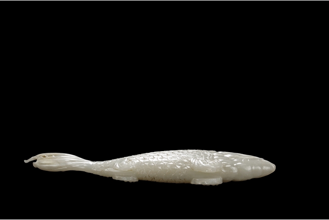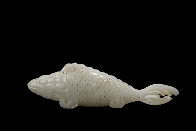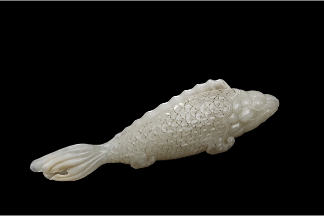 The fish model is realistically carved with highly detailed incised fins and scales, the body raised above a small section of swirled water, the stone is of white tone.