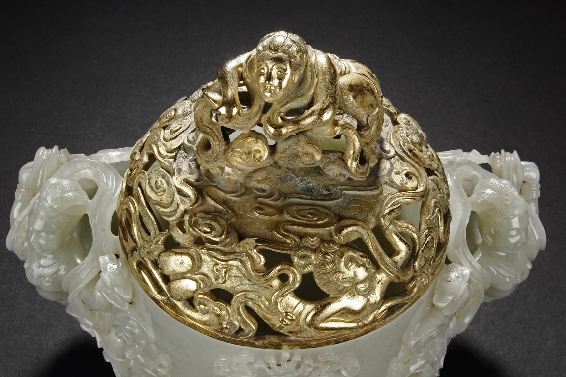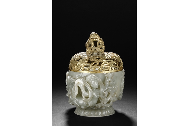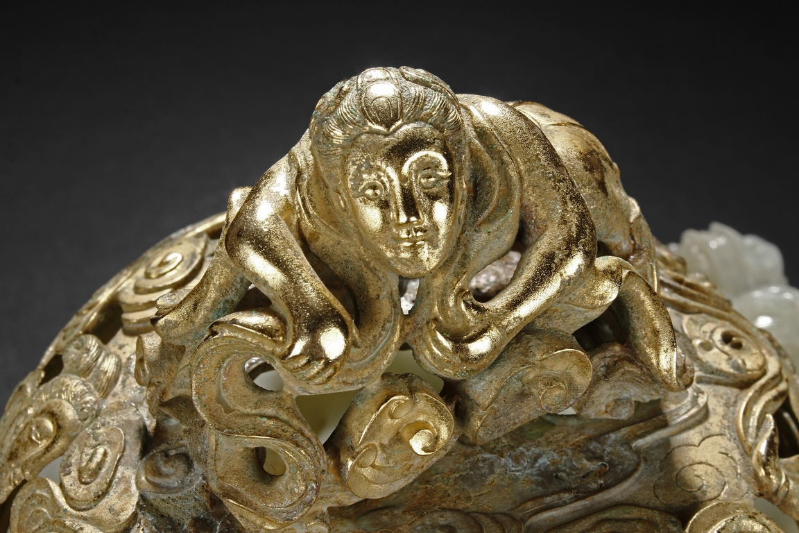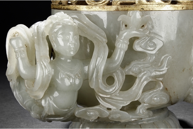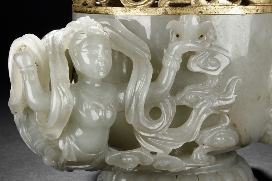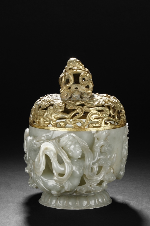 The exterior of the bowl on both sides is delicately carved in high relief with flying Aspara, or Feitian, shown wearing long celestial scarf and holding a peach amid the auspicious clouds. The face of the Aspara is shown with a benevolent expression and hair pulled into chignon detailed with incised lines. The bowl is supported by spreading pedestal foot ring. The gilt-bronze cover is cast in openwork with similar motif of auspicious clouds and celestial Aspara and the dome topped with a high-reilef Aspara as finial. The stone is of white tone with russet areas.
