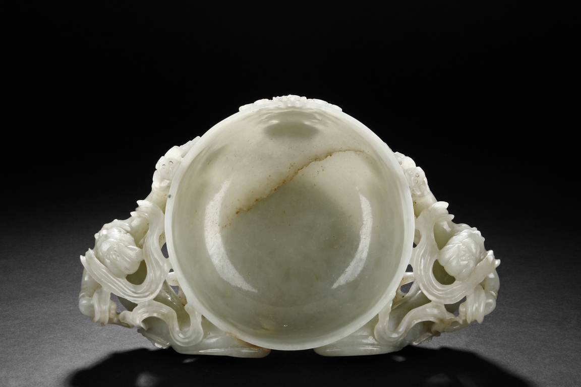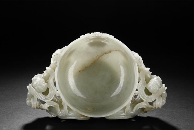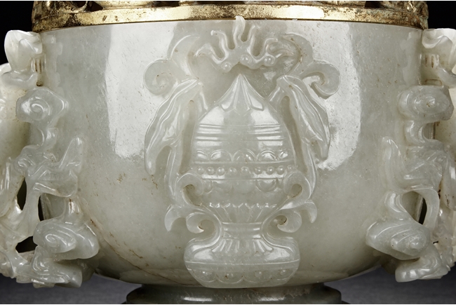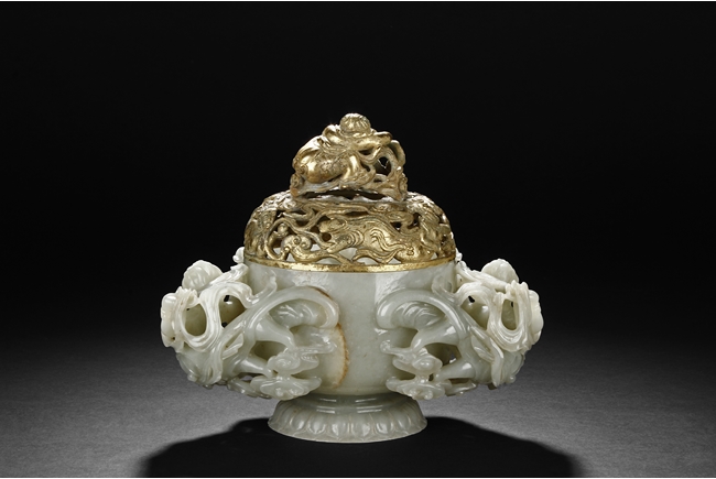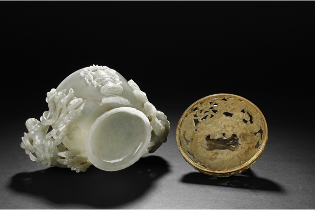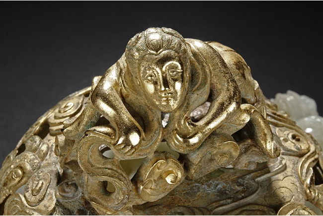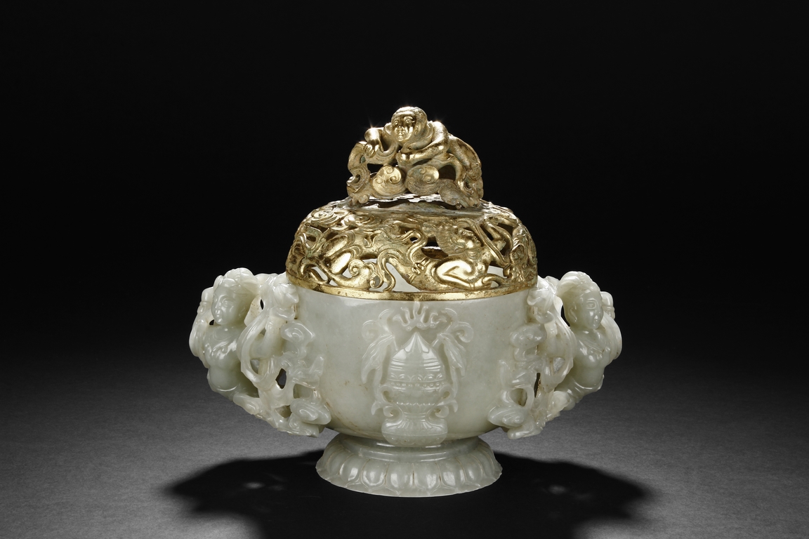 The exterior of the bowl on both sides is delicately carved in high relief with flying Aspara, or Feitian, shown wearing long celestial scarf and holding a peach amid the auspicious clouds. The face of the Aspara is shown with a benevolent expression and hair pulled into chignon detailed with incised lines. The bowl is supported by spreading pedestal foot ring. The gilt-bronze cover is cast in openwork with similar motif of auspicious clouds and celestial Aspara and the dome topped with a high-reilef Aspara as finial. The stone is of white tone with russet areas.