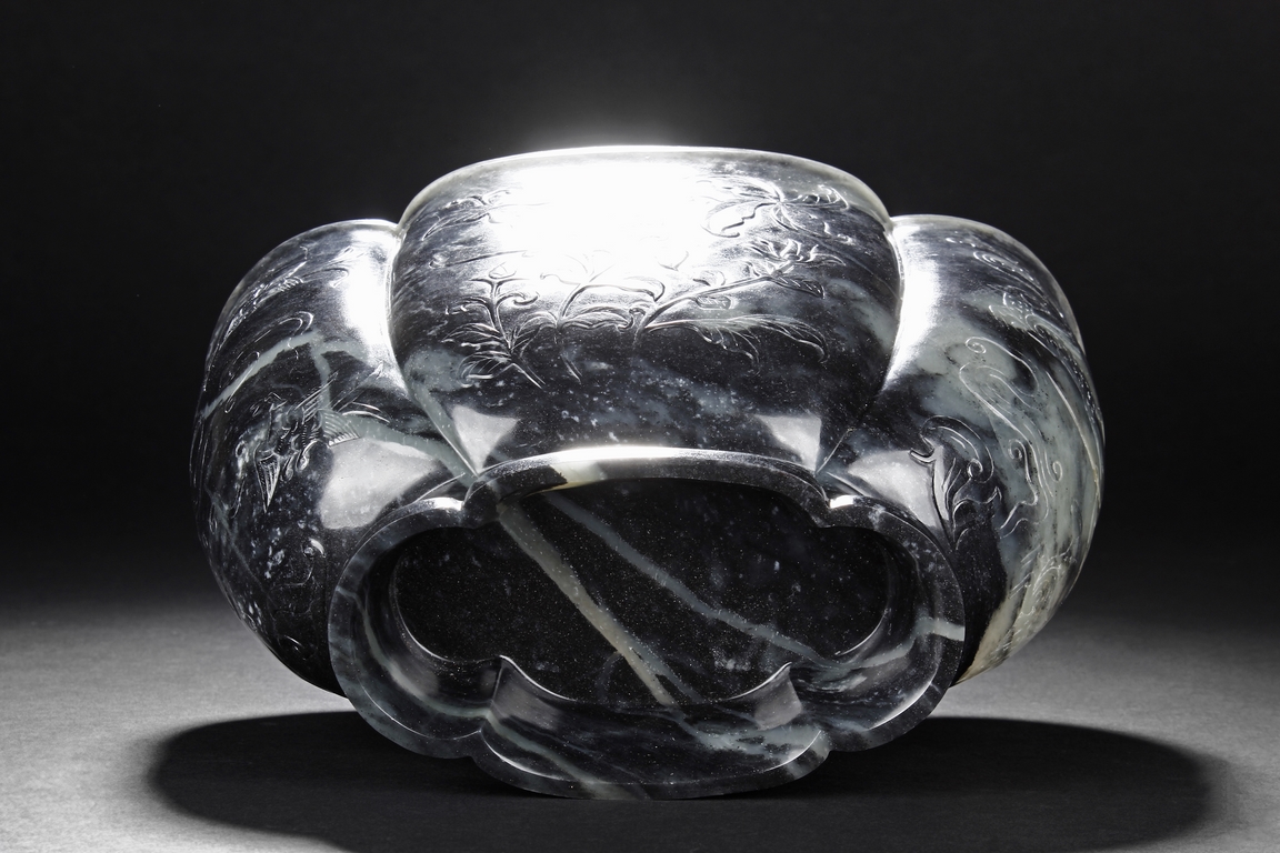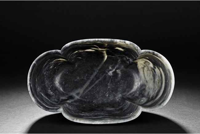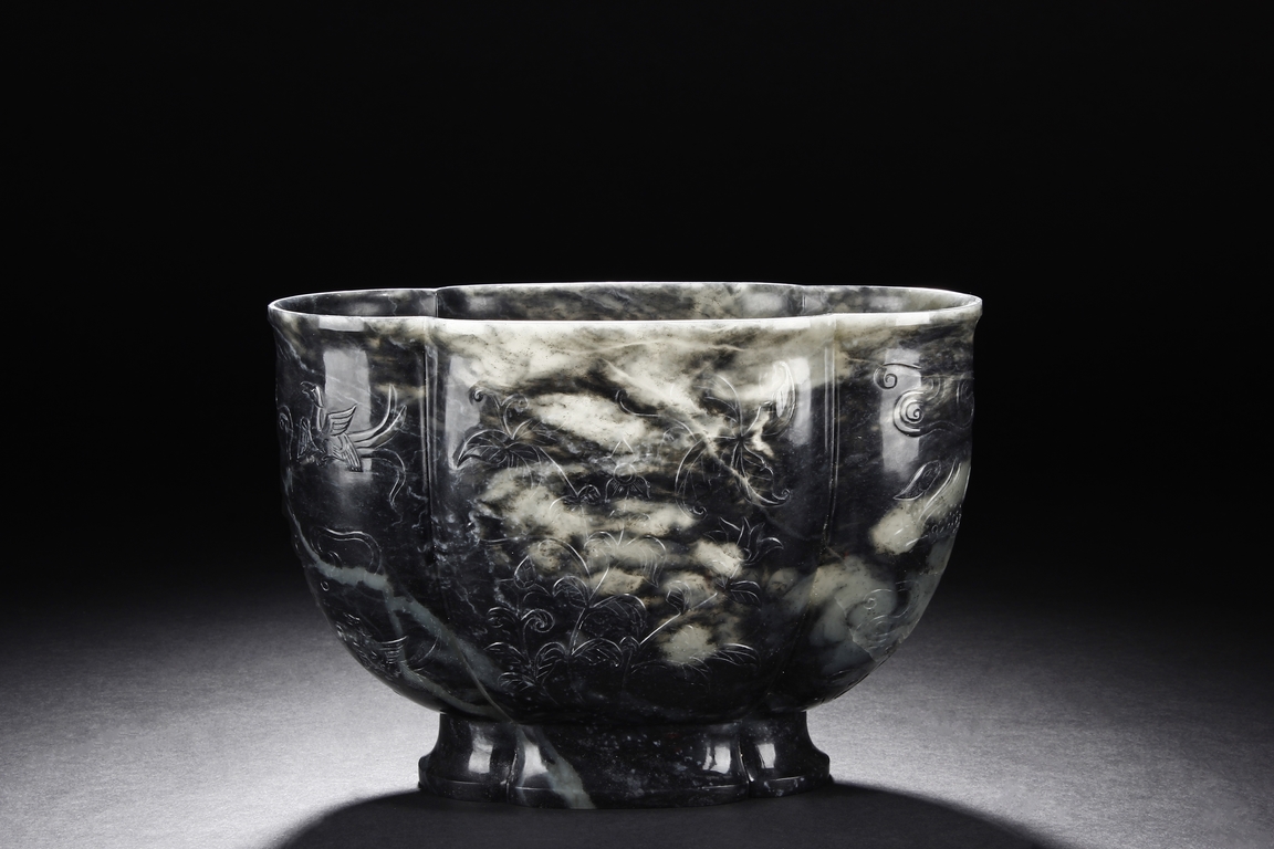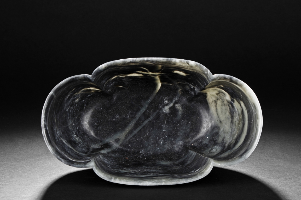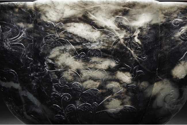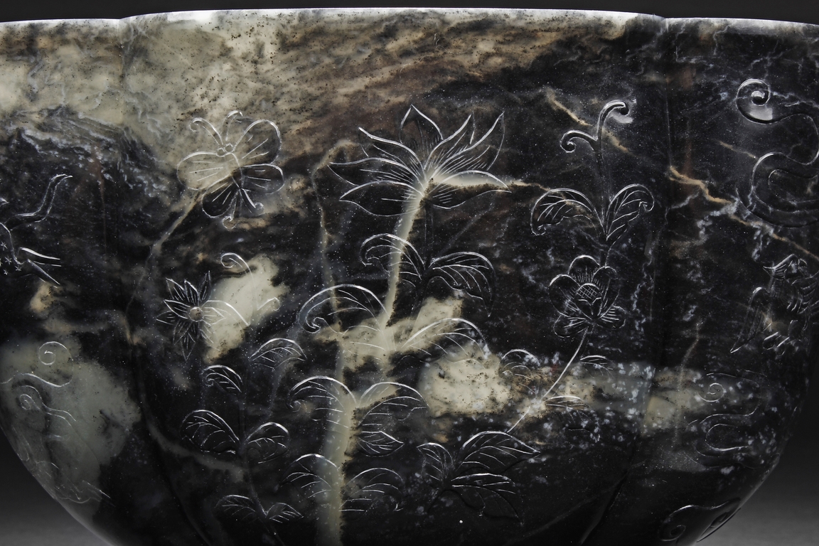 Of lobed quarter-foil form with steep sides rising to the rim, the sides are incised in shallow relief with flower and butterflies motif, the stone is of dark spinach tone with areas of white tone.