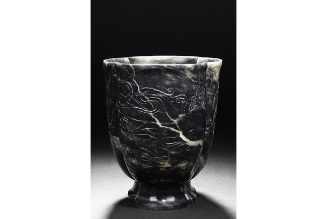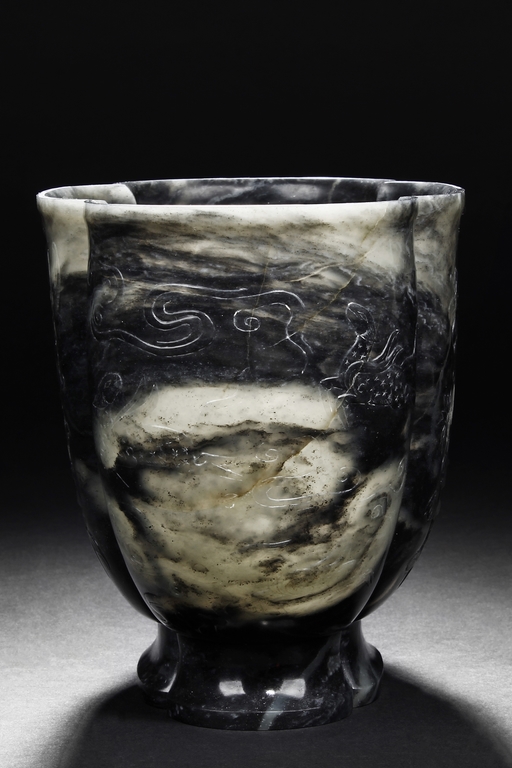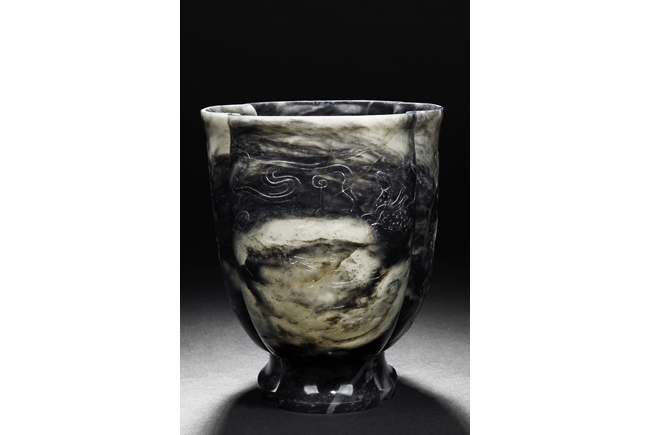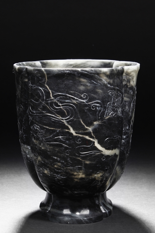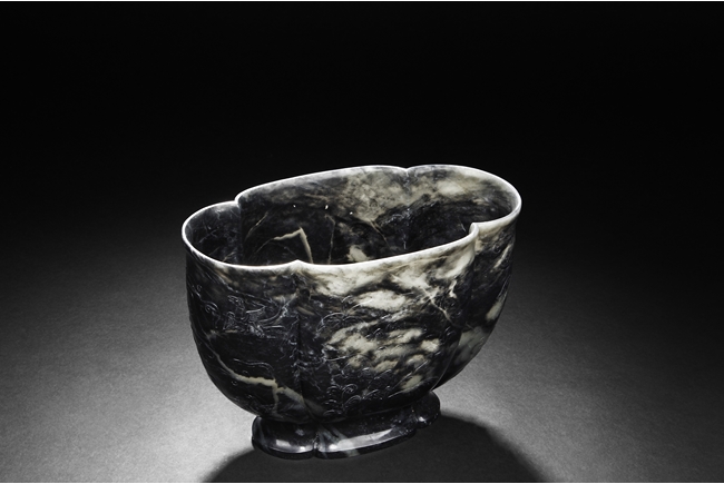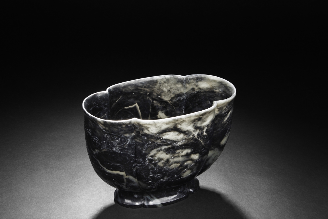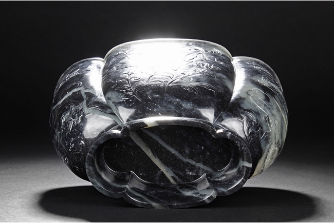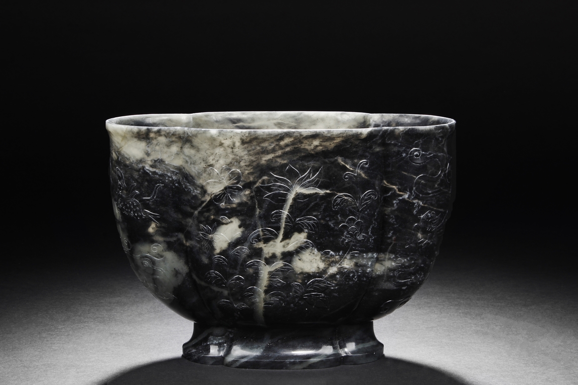 Of lobed quarter-foil form with steep sides rising to the rim, the sides are incised in shallow relief with flower and butterflies motif, the stone is of dark spinach tone with areas of white tone.