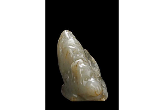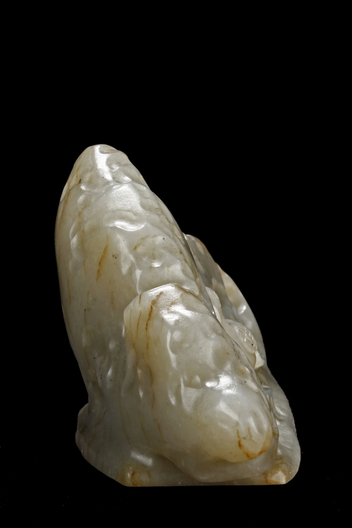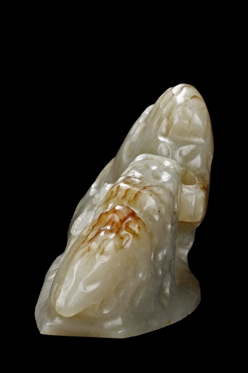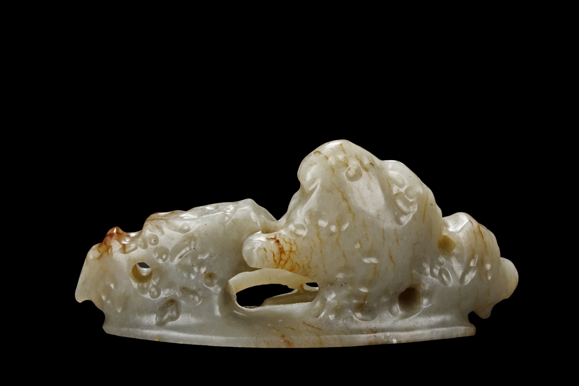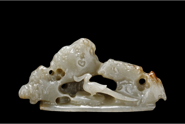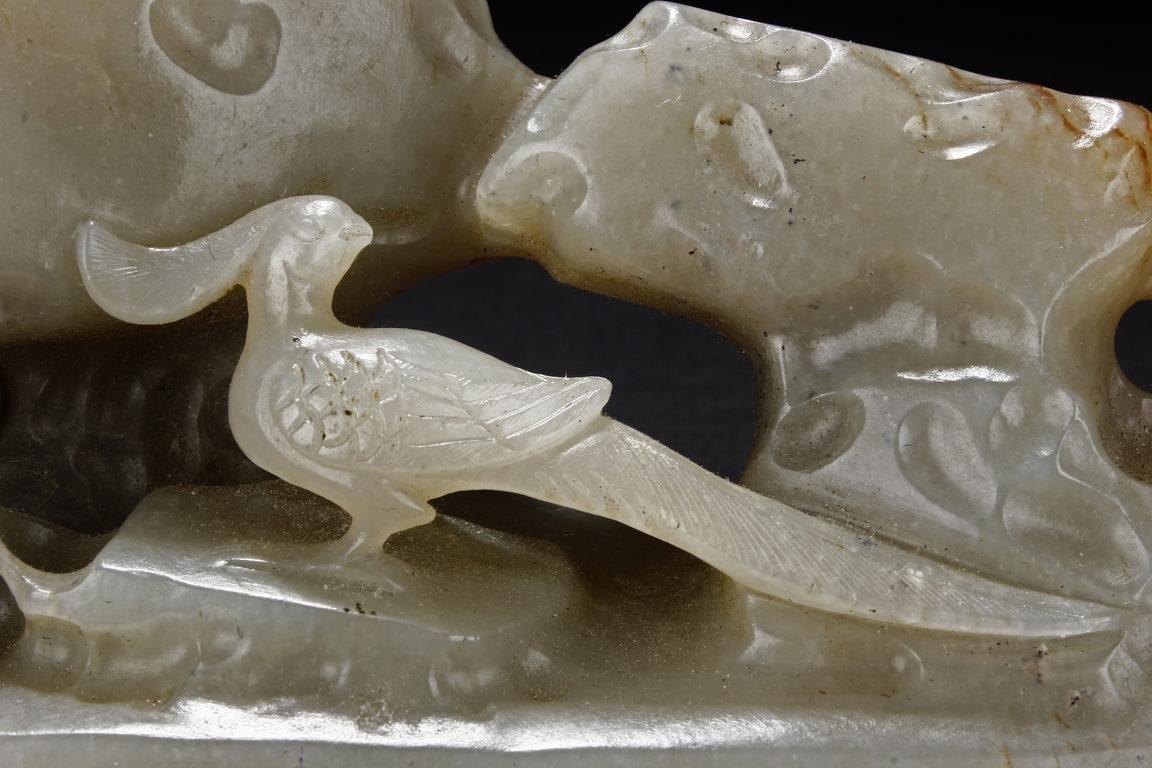 The brush rest depicts a phoenix with long tail feathers standing amidst jagged rocks, looking backwards, the stone is of reddish-white color, with visible veins, slightly mottled interior, and good translucency.