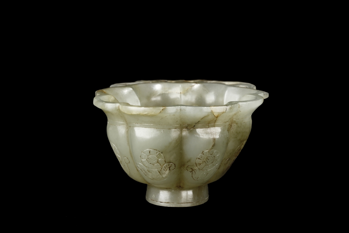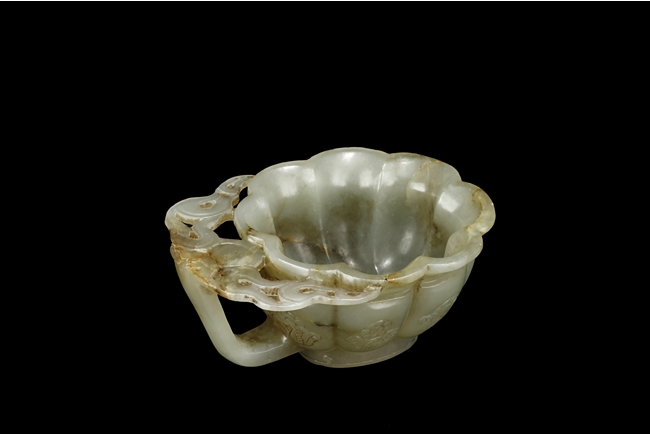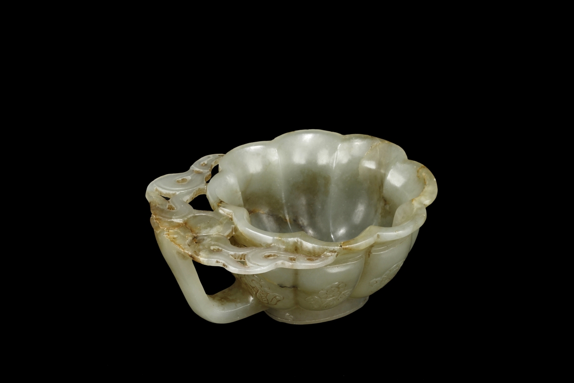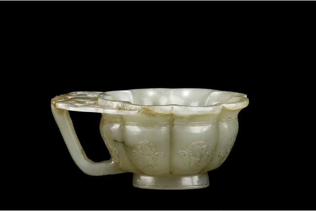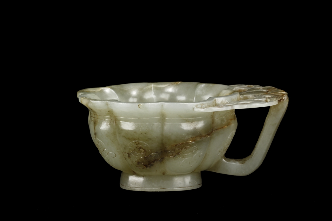 The cup with floriform rim, with well defined petals, the handle in the shape of vine and leaf, and the body carved with flower patterns, the stone of celadon with russet.