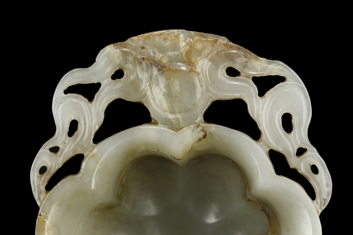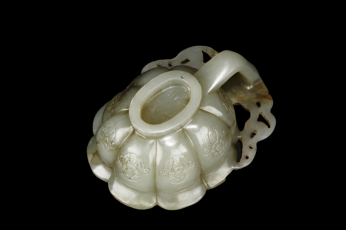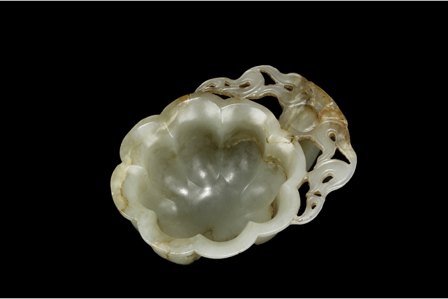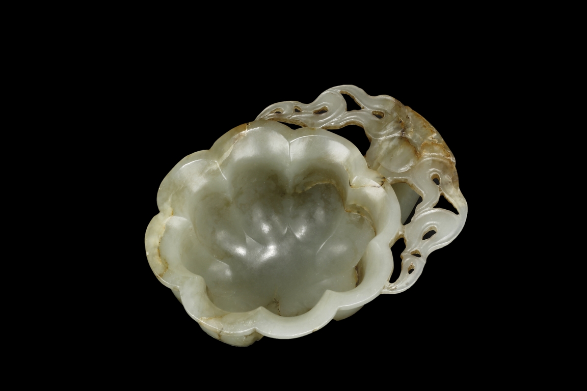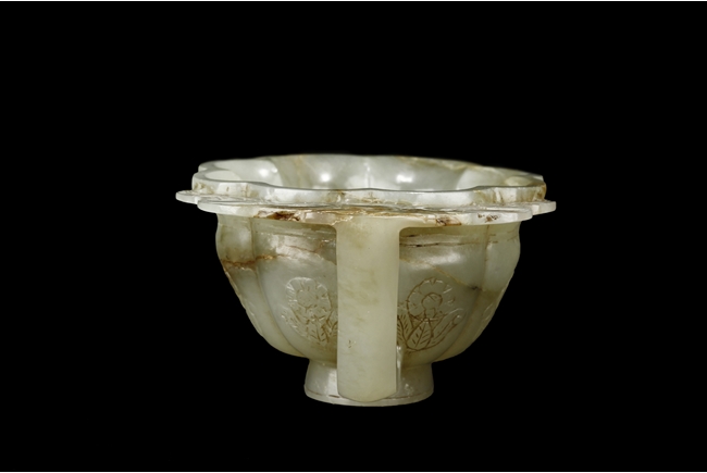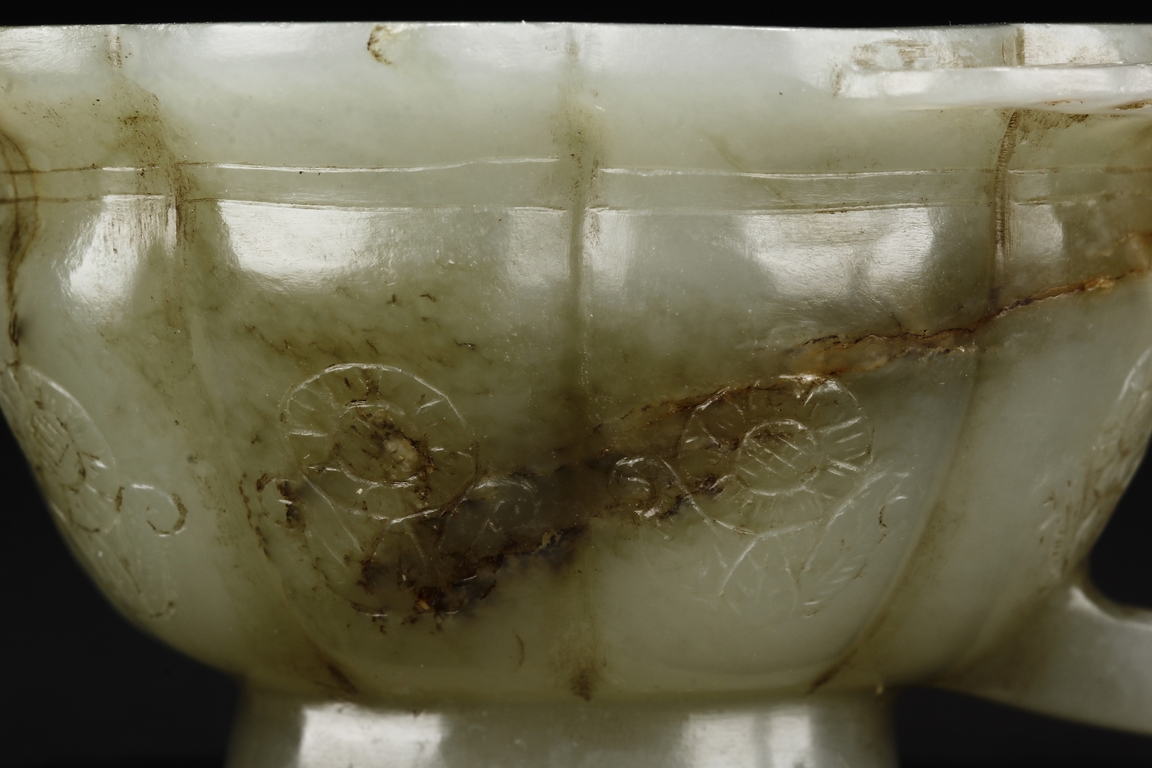 The cup with floriform rim, with well defined petals, the handle in the shape of vine and leaf, and the body carved with flower patterns, the stone of celadon with russet.