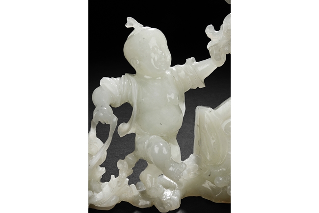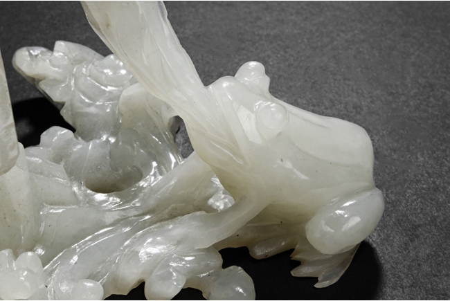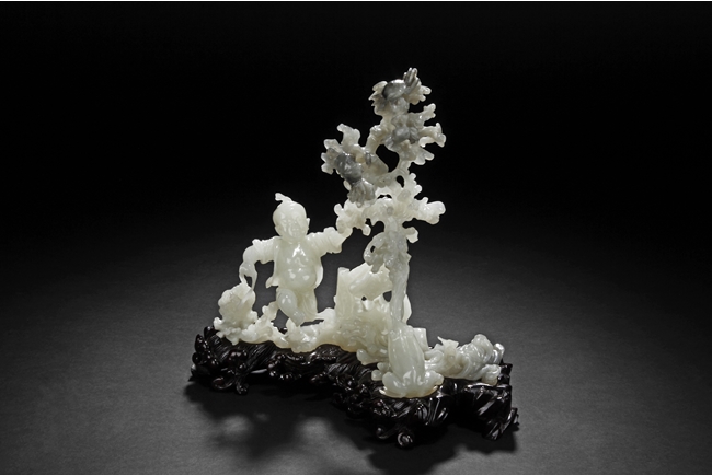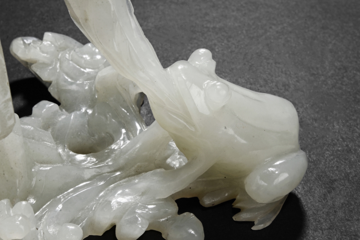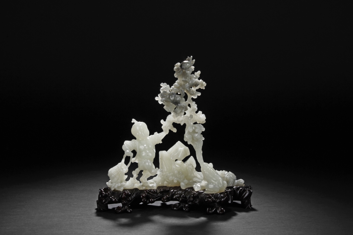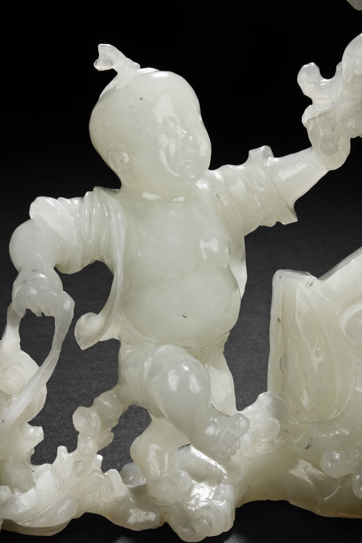 The figural group is pierced and carved with a boy with bared belly and holding a basket on the right hand with sleeves rolled up, reaching up to pick a crab on the water fountain issuing from a mythical frog. The stone is of overall white tone with varying tone of grey and darker areas on the water fountain.