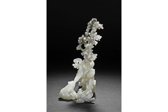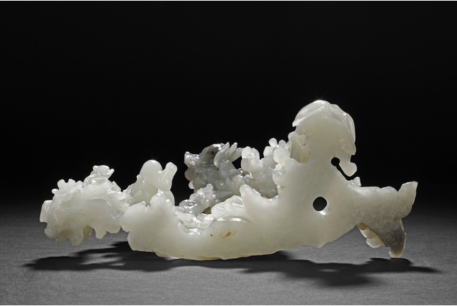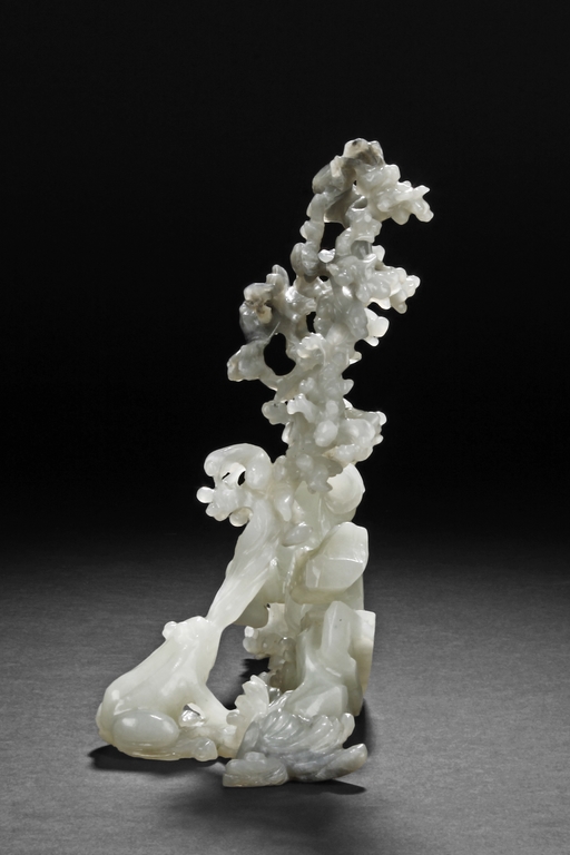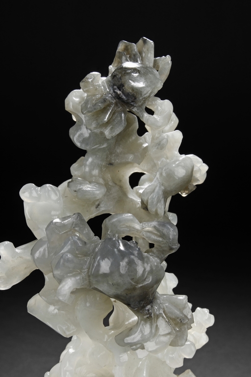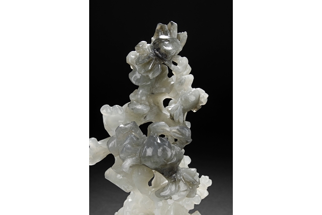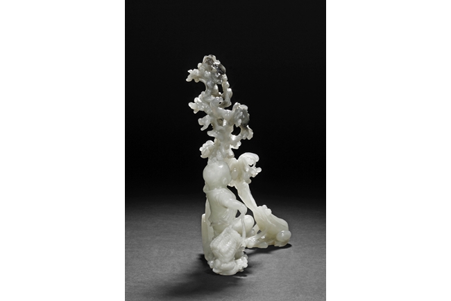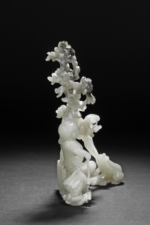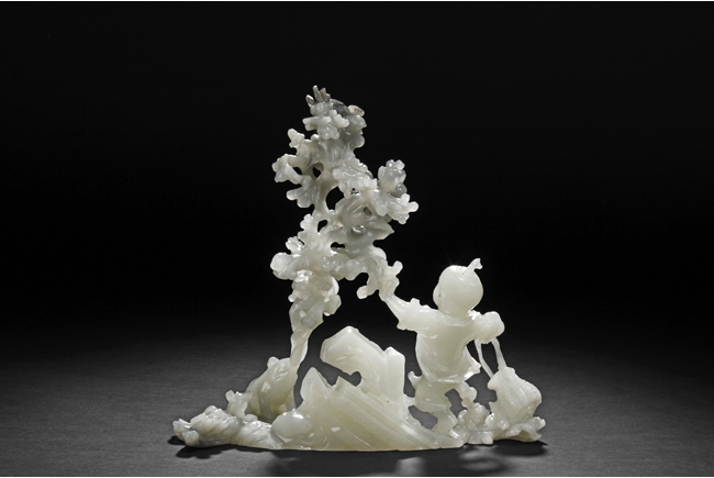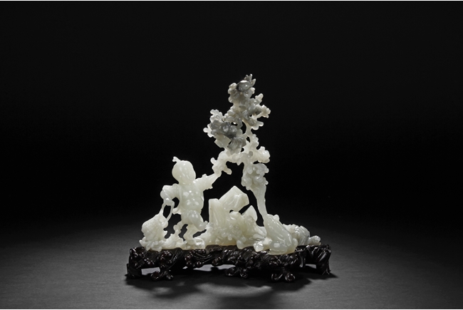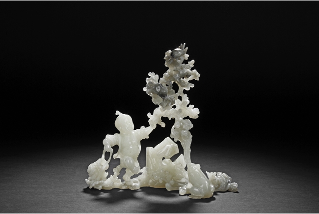 The figural group is pierced and carved with a boy with bared belly and holding a basket on the right hand with sleeves rolled up, reaching up to pick a crab on the water fountain issuing from a mythical frog. The stone is of overall white tone with varying tone of grey and darker areas on the water fountain.