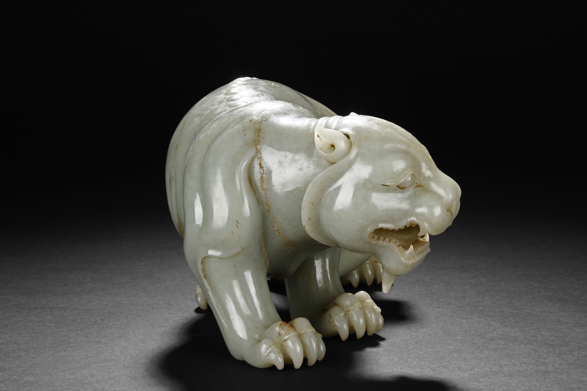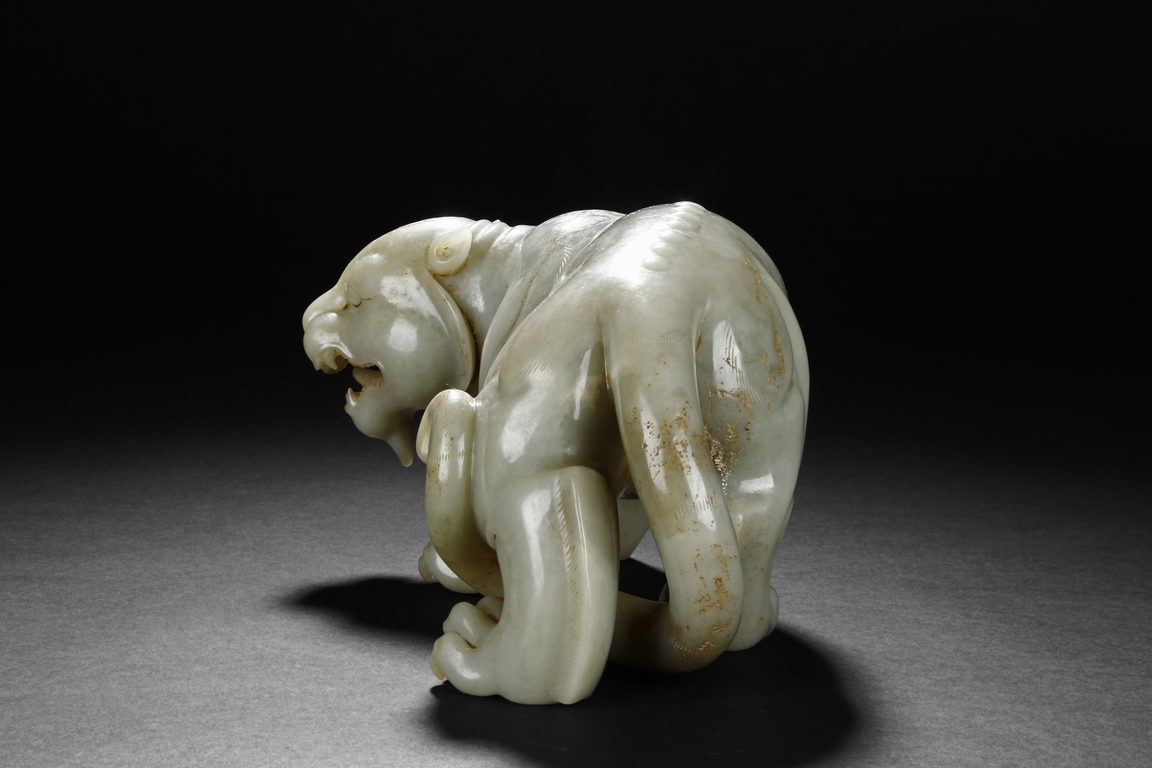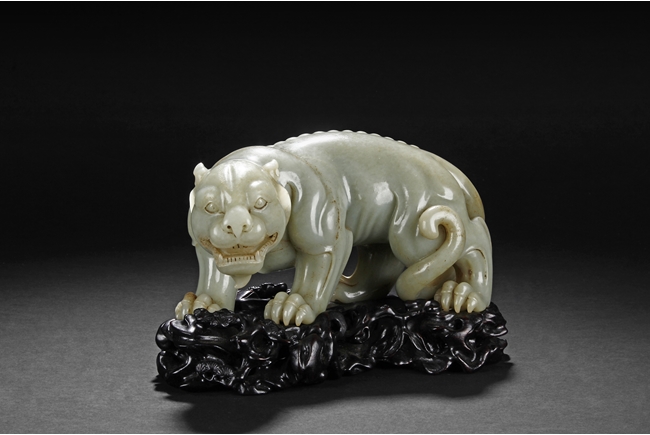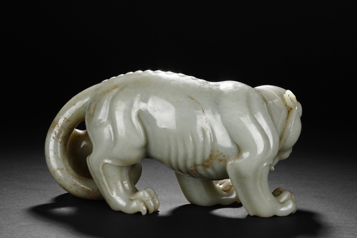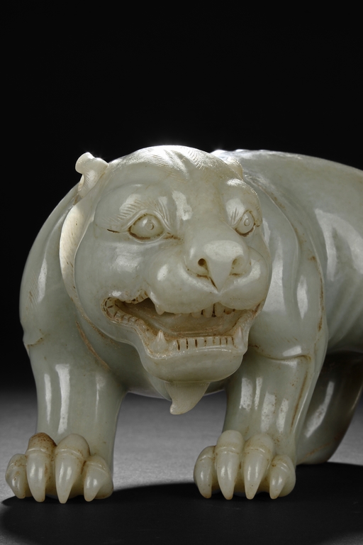The figure is realistically carved standing foursquare facing to the side, the face shown with a ferocious expression with large jaws open, the eyebrow and mane are finely detailed with incised lines, the paws are delicately carved to show the sharp claws. The smoothly polished stone is of celadon tone.