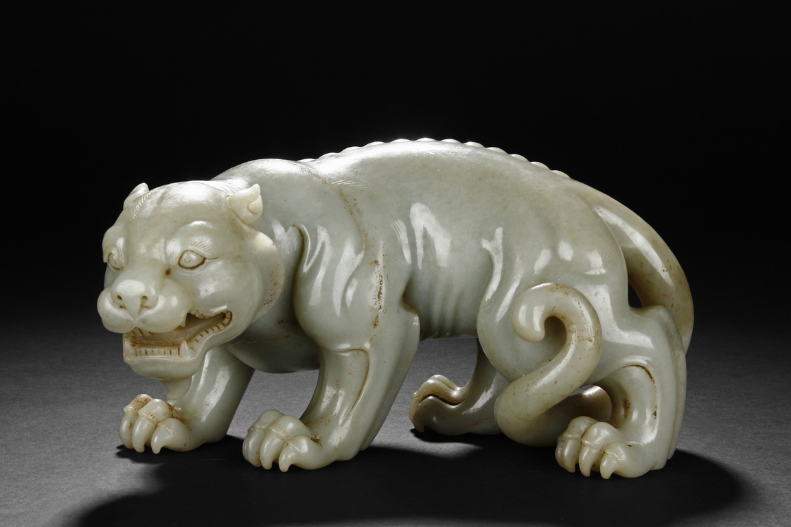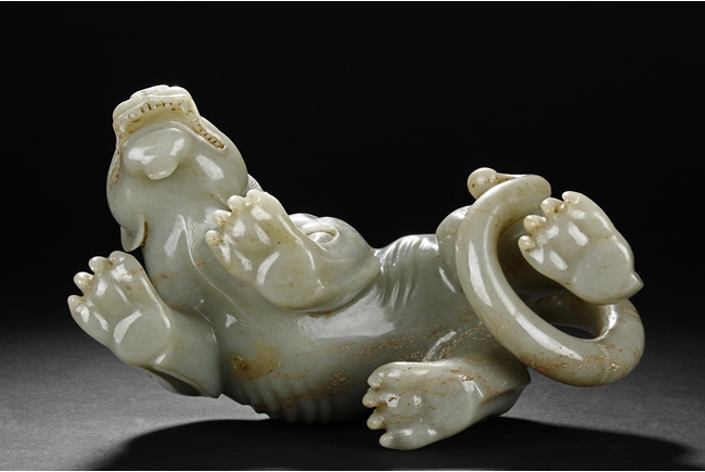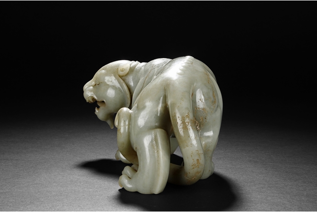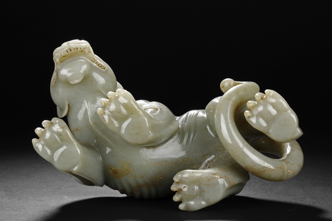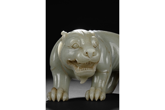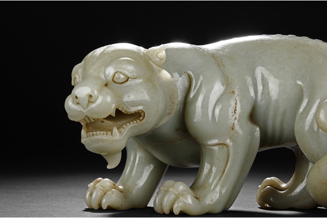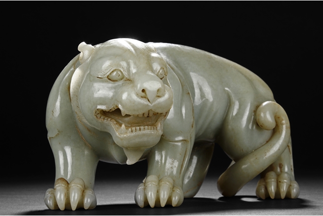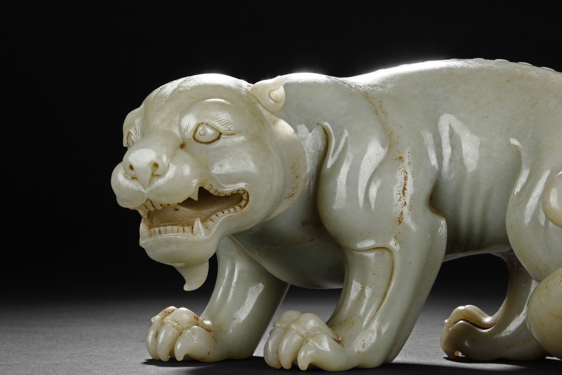 The figure is realistically carved standing foursquare facing to the side, the face shown with a ferocious expression with large jaws open, the eyebrow and mane are finely detailed with incised lines, the paws are delicately carved to show the sharp claws. The smoothly polished stone is of celadon tone.