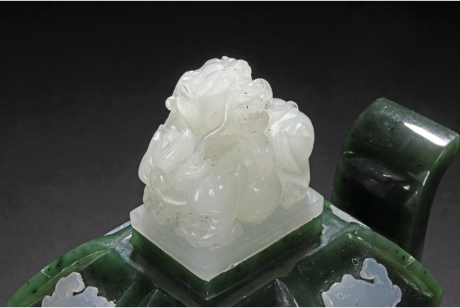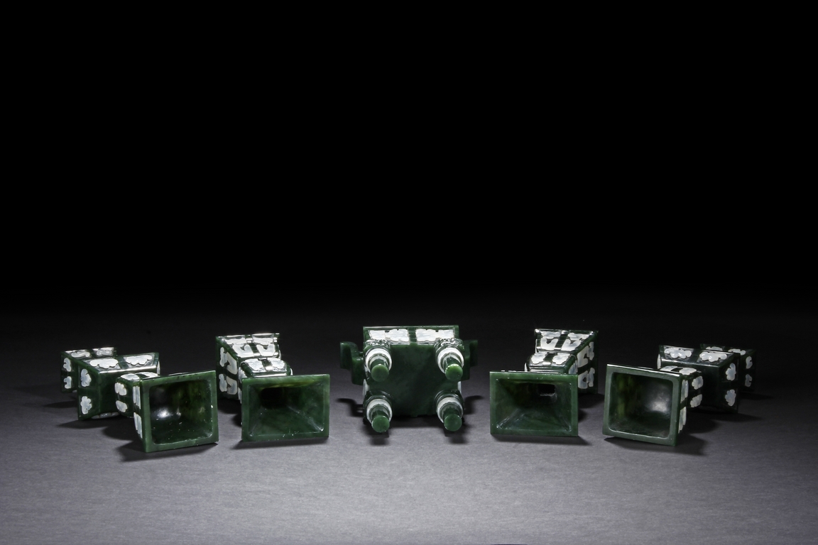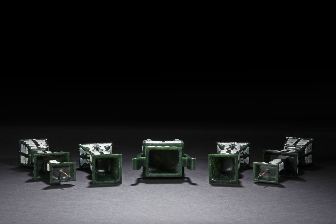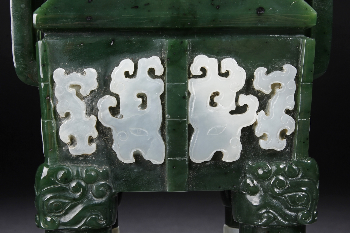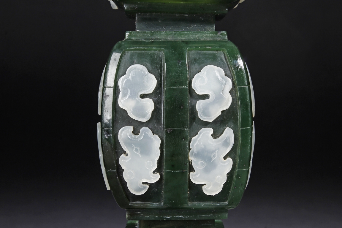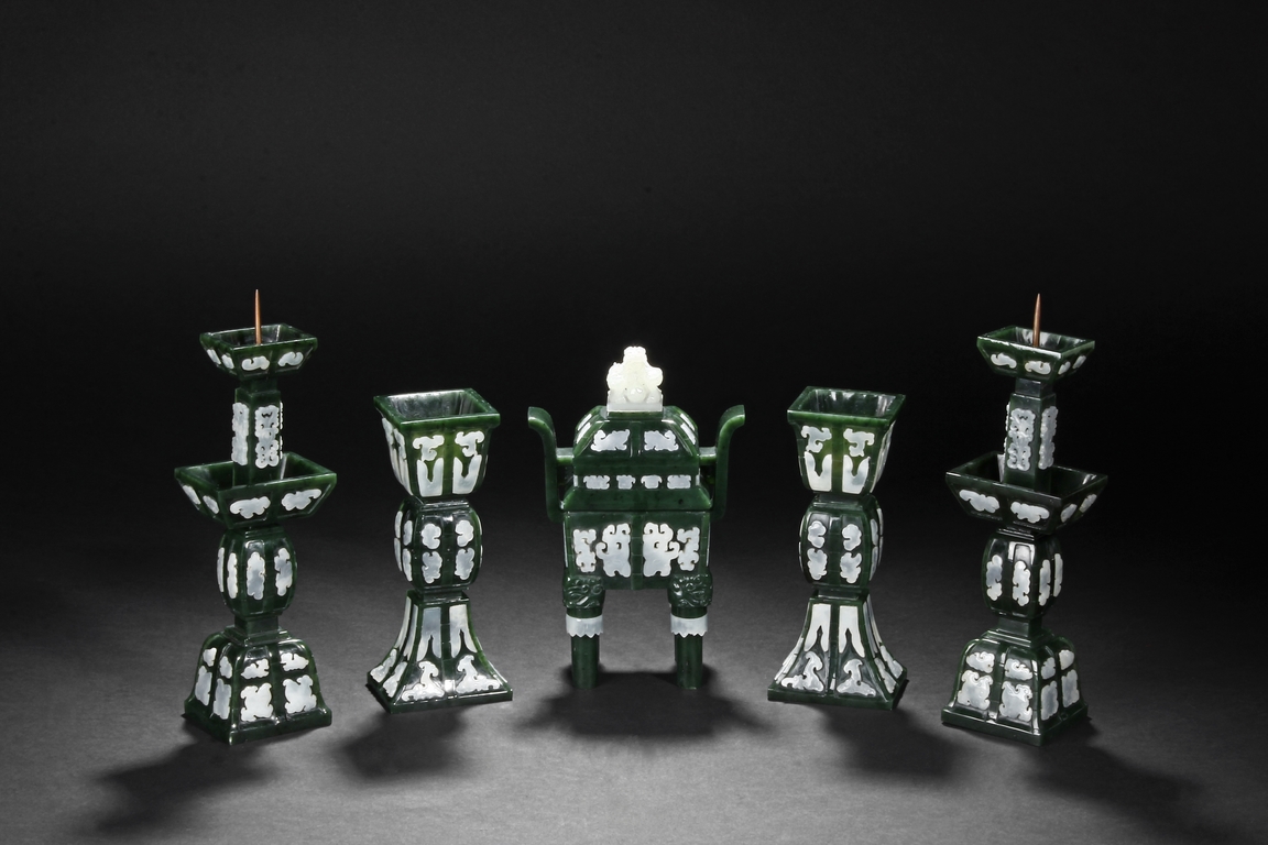 The spinach jade altar garniture set comprises of a pair of archaic fangu vases, a pair of candlesticks, and an archaic fangding censer. The fanggu is rectangular section, the mid-section overlaid with white jade decoration of stylized dragon motif on each facet with raised flanges, and stylized leave motif on neck and foot along with stylized dragon; the candle stick is of square section, each side decorated in white jade with auspicious motifs and stylized dragons; the fangding censer is raised on four taotie-headed foot with a pair of upright curved handles, the body overlaid with white jade taotie-mask and the cover surmounted with a white jade Buddhist lion as finial.