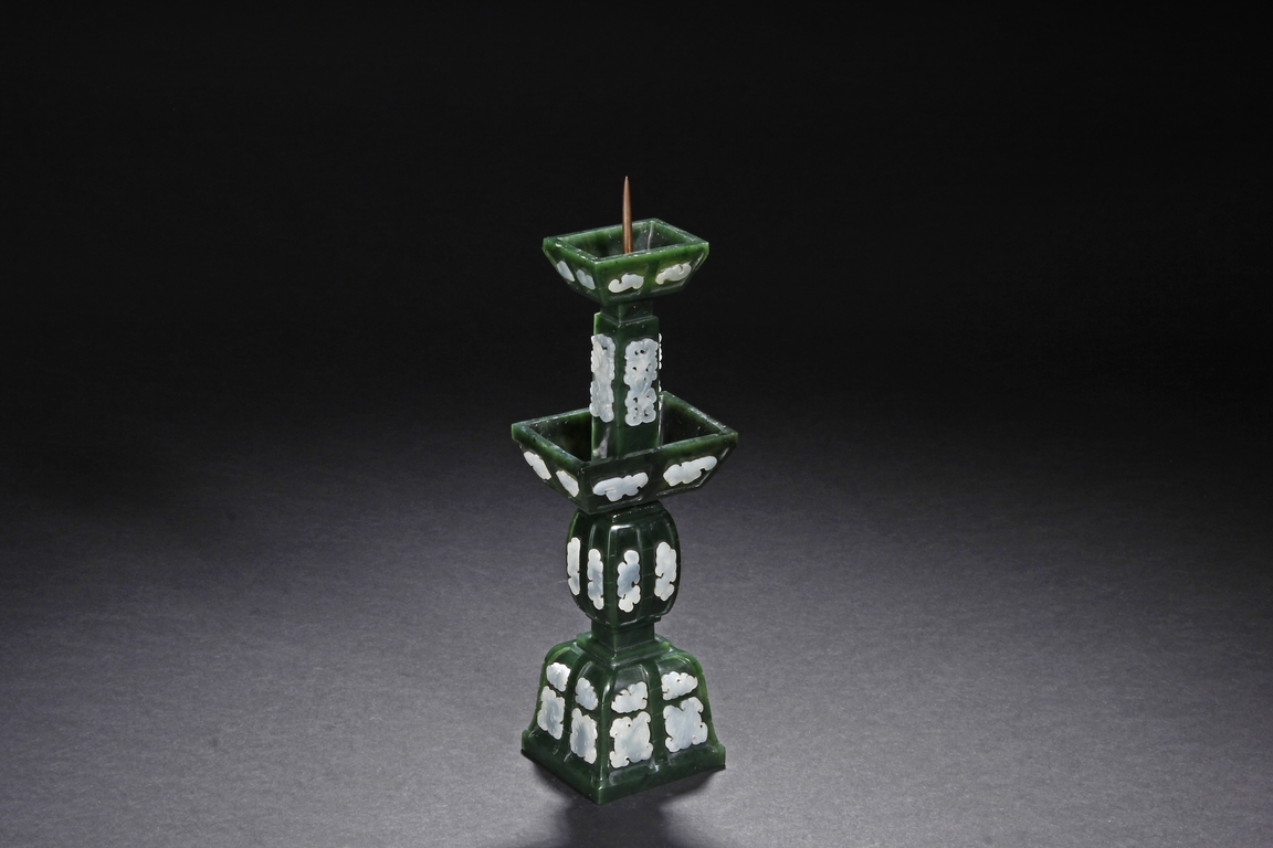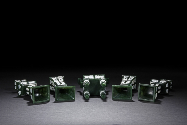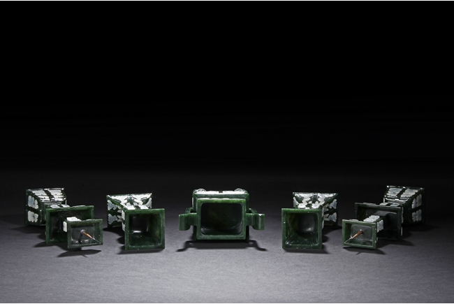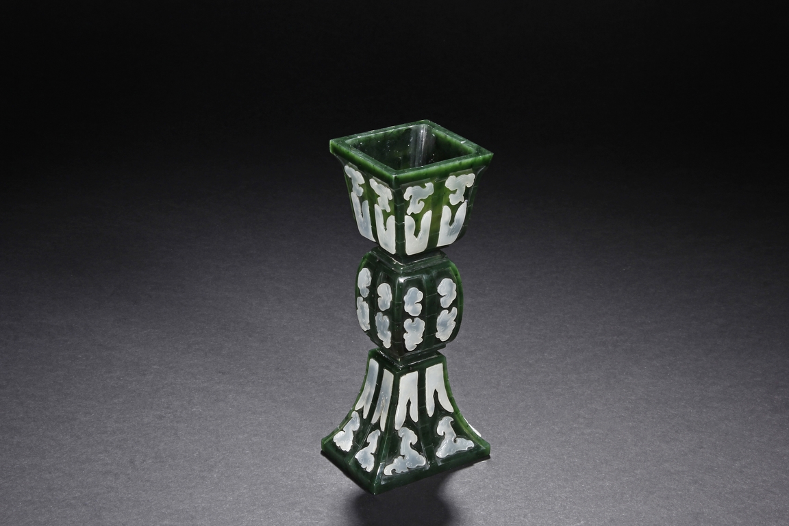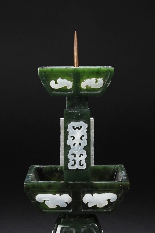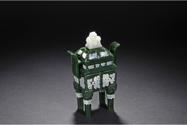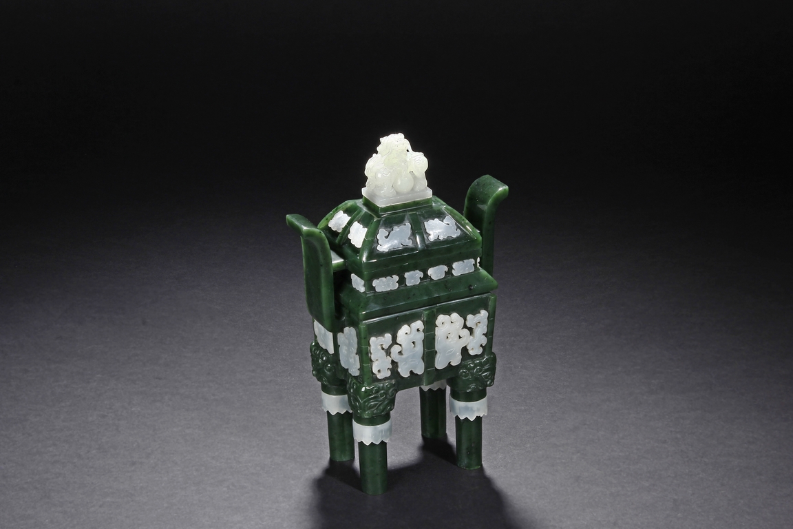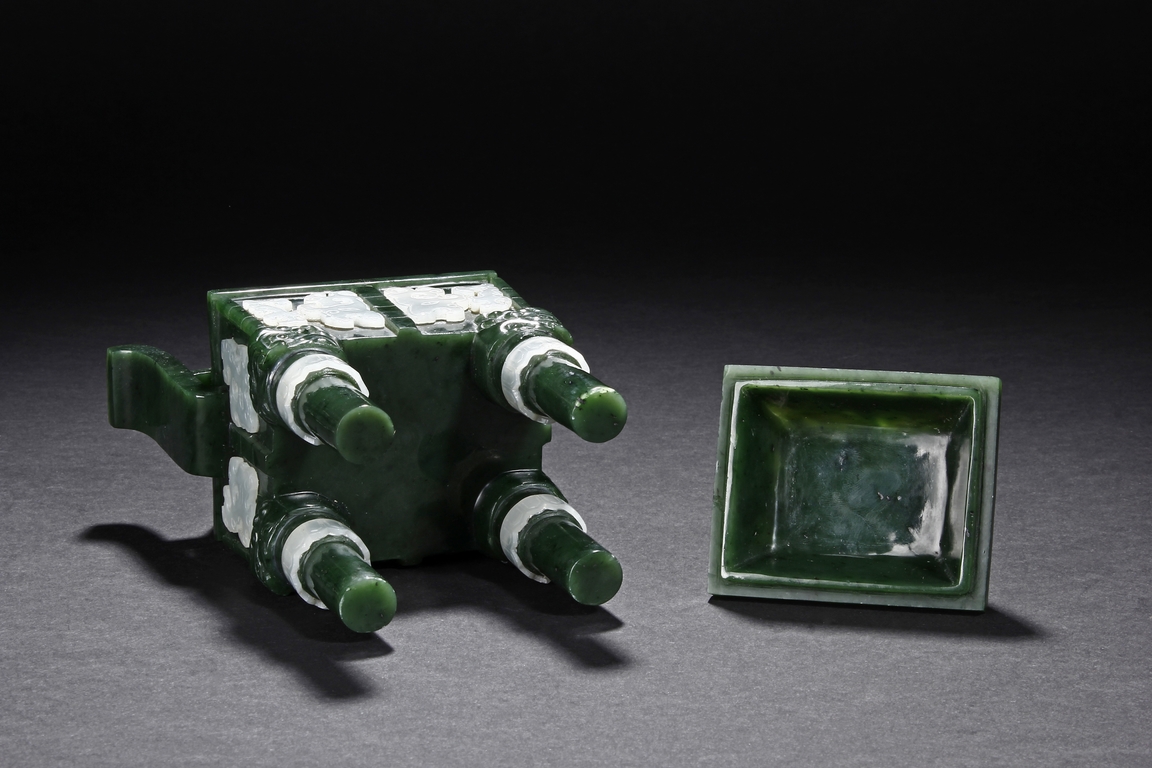 The spinach jade altar garniture set comprises of a pair of archaic fangu vases, a pair of candlesticks, and an archaic fangding censer. The fanggu is rectangular section, the mid-section overlaid with white jade decoration of stylized dragon motif on each facet with raised flanges, and stylized leave motif on neck and foot along with stylized dragon; the candle stick is of square section, each side decorated in white jade with auspicious motifs and stylized dragons; the fangding censer is raised on four taotie-headed foot with a pair of upright curved handles, the body overlaid with white jade taotie-mask and the cover surmounted with a white jade Buddhist lion as finial.