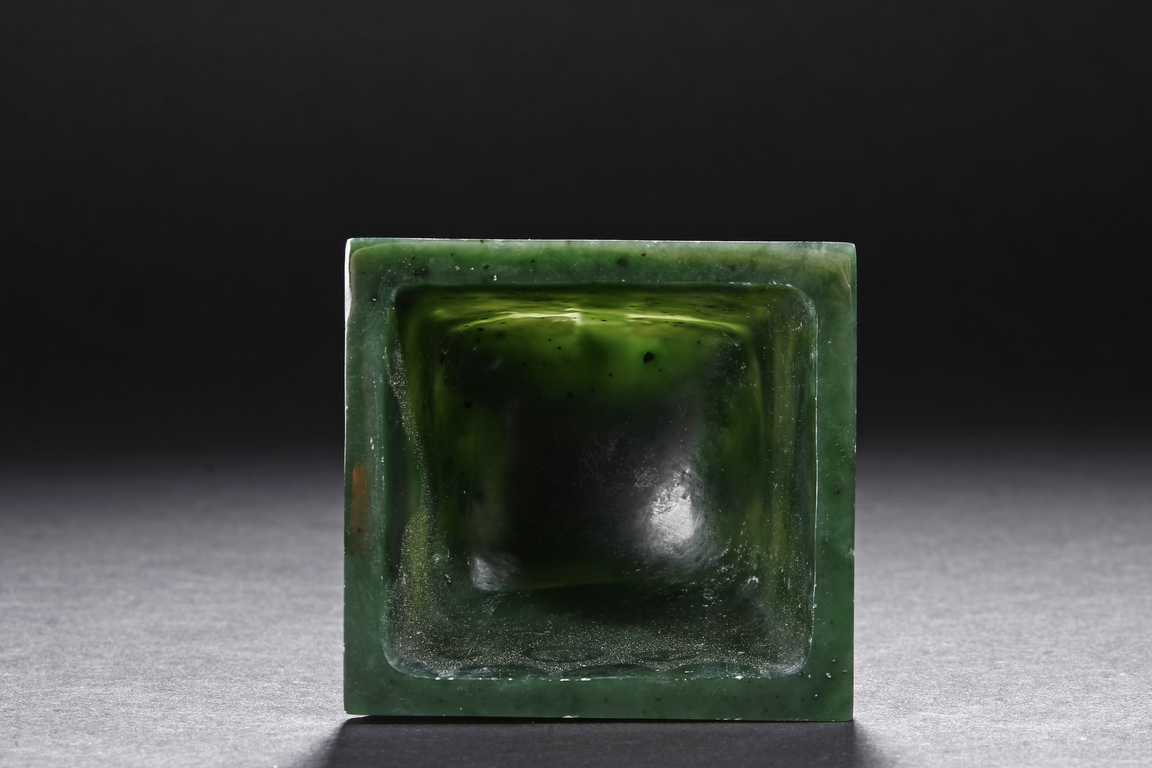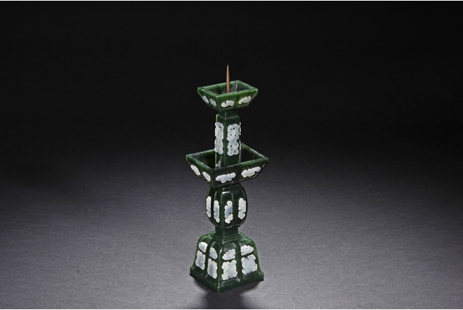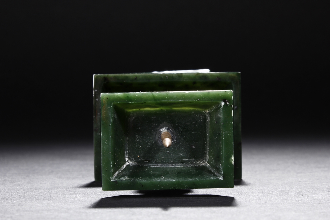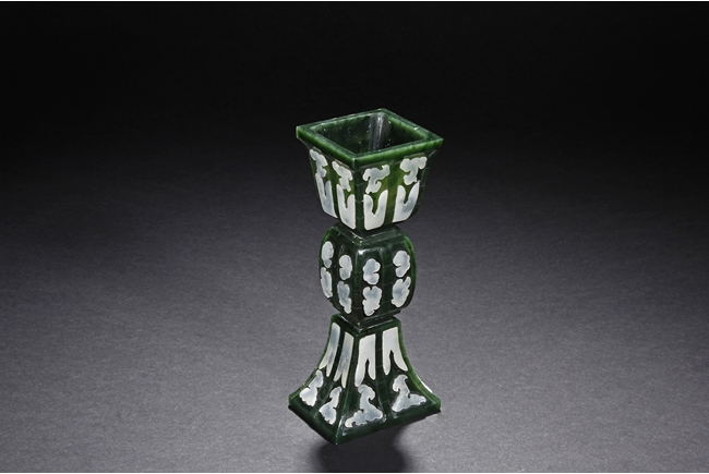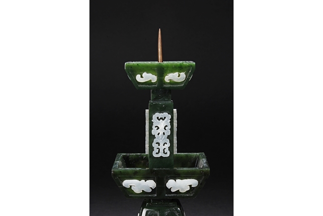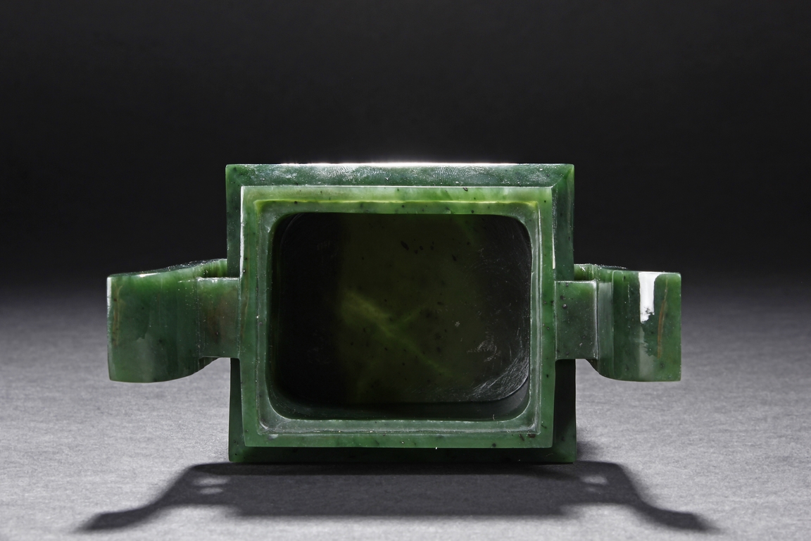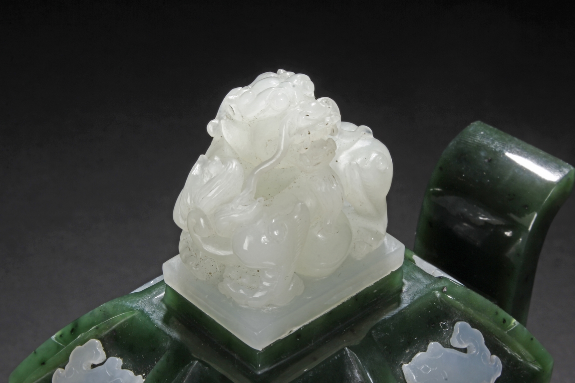 The spinach jade altar garniture set comprises of a pair of archaic fangu vases, a pair of candlesticks, and an archaic fangding censer. The fanggu is rectangular section, the mid-section overlaid with white jade decoration of stylized dragon motif on each facet with raised flanges, and stylized leave motif on neck and foot along with stylized dragon; the candle stick is of square section, each side decorated in white jade with auspicious motifs and stylized dragons; the fangding censer is raised on four taotie-headed foot with a pair of upright curved handles, the body overlaid with white jade taotie-mask and the cover surmounted with a white jade Buddhist lion as finial.