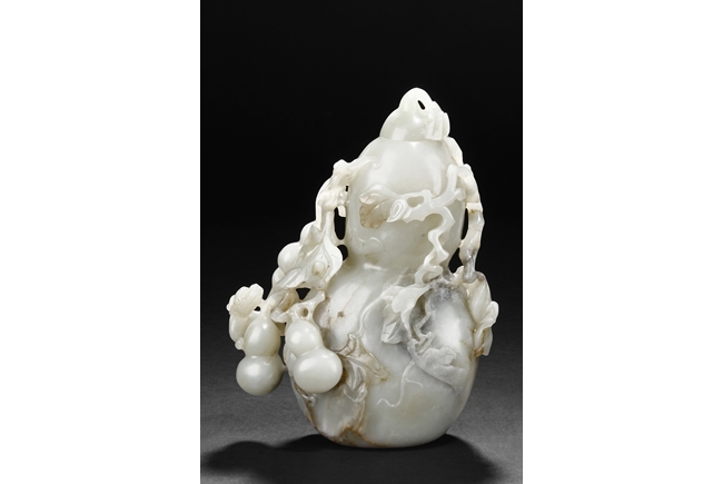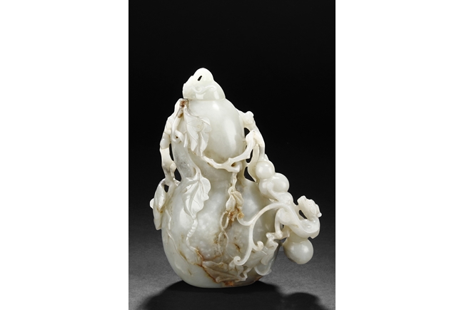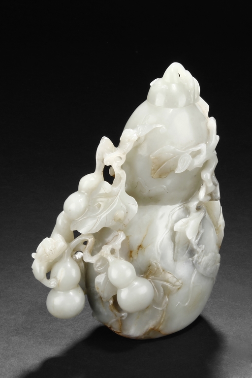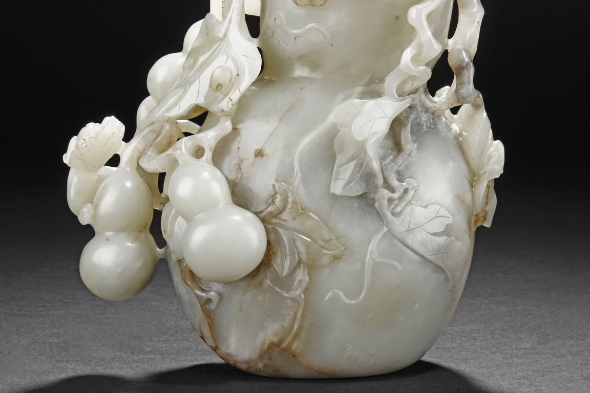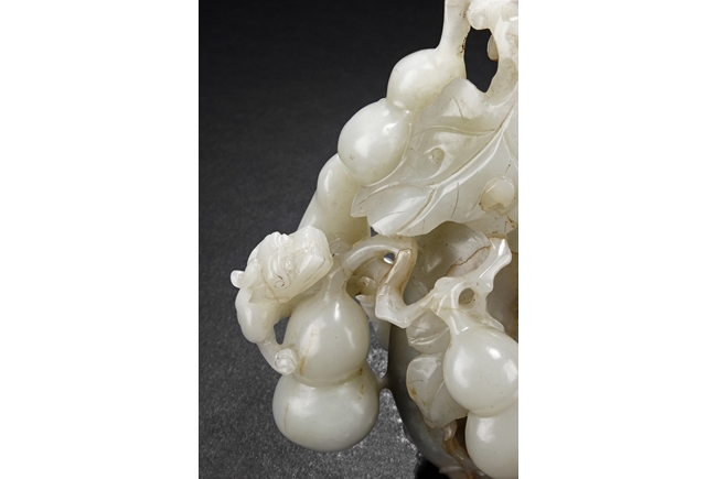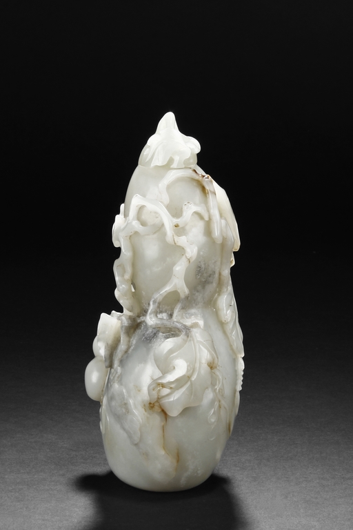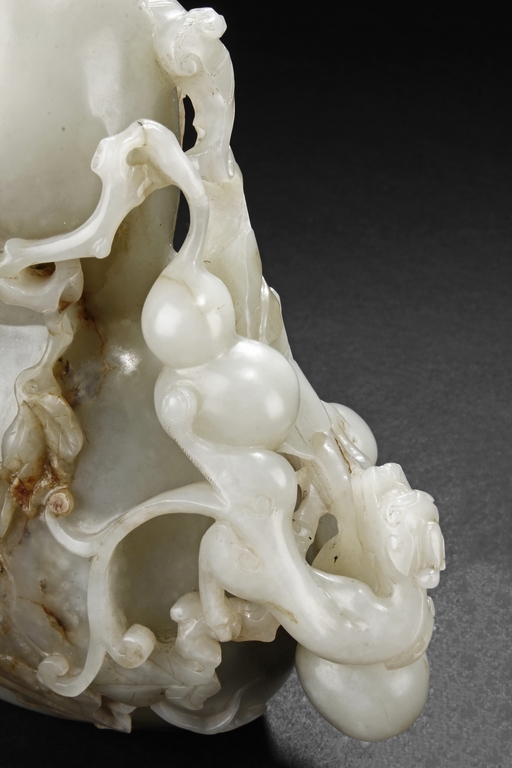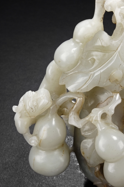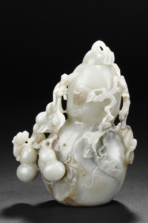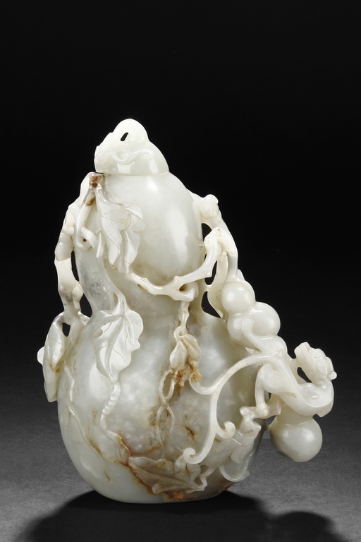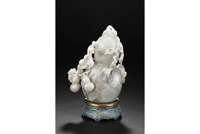 Of double-gourd form, it is supported on a gilt-bronze cloisonne enamel stand decorated with floral scroll patterns, the body is carved and pierced around the sides with trailing, leafy vines and smaller gourds, with a mythical beast crawling upon them, its tail divided to three branches. The stone is of mostly white tone with varying tone of grey and russet in some areas.