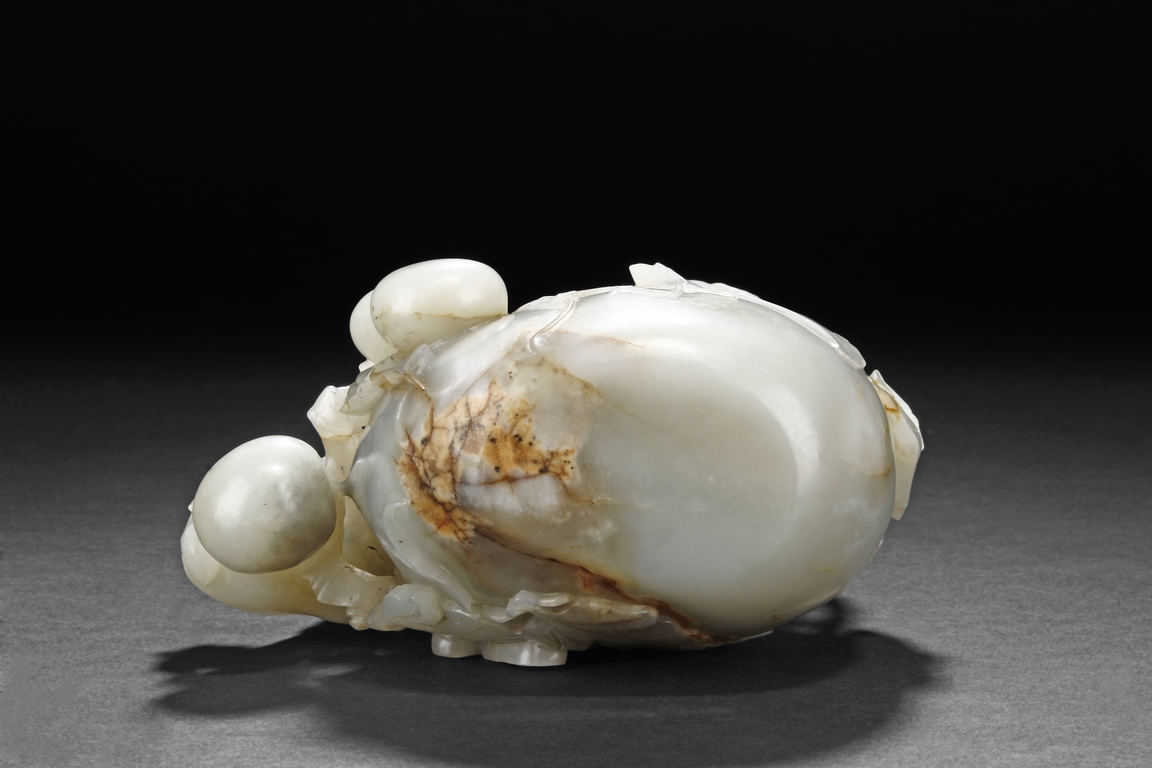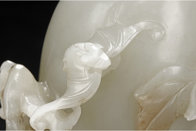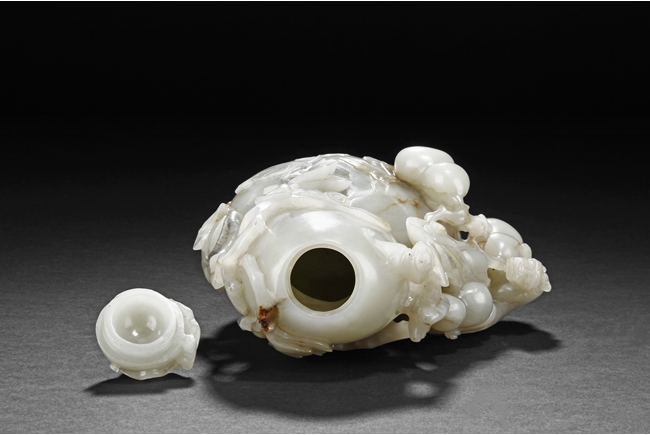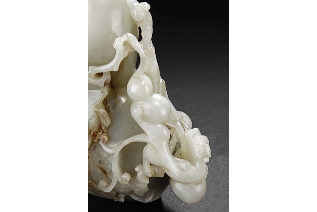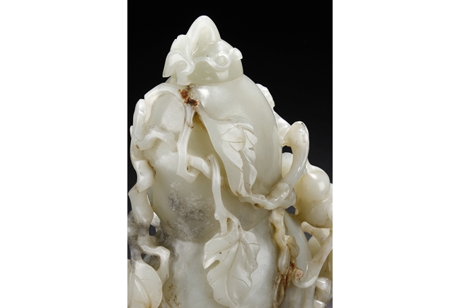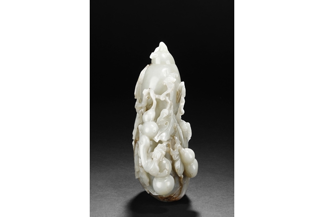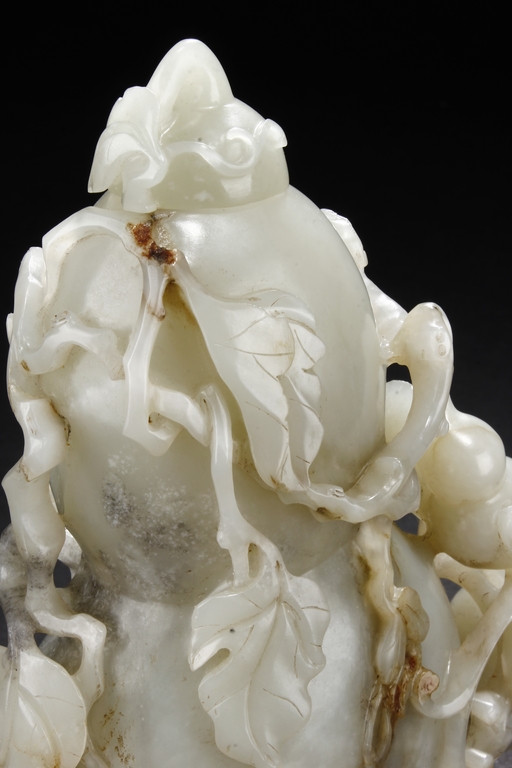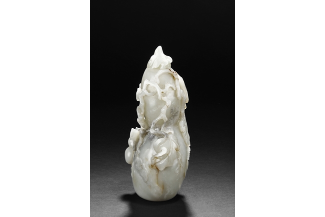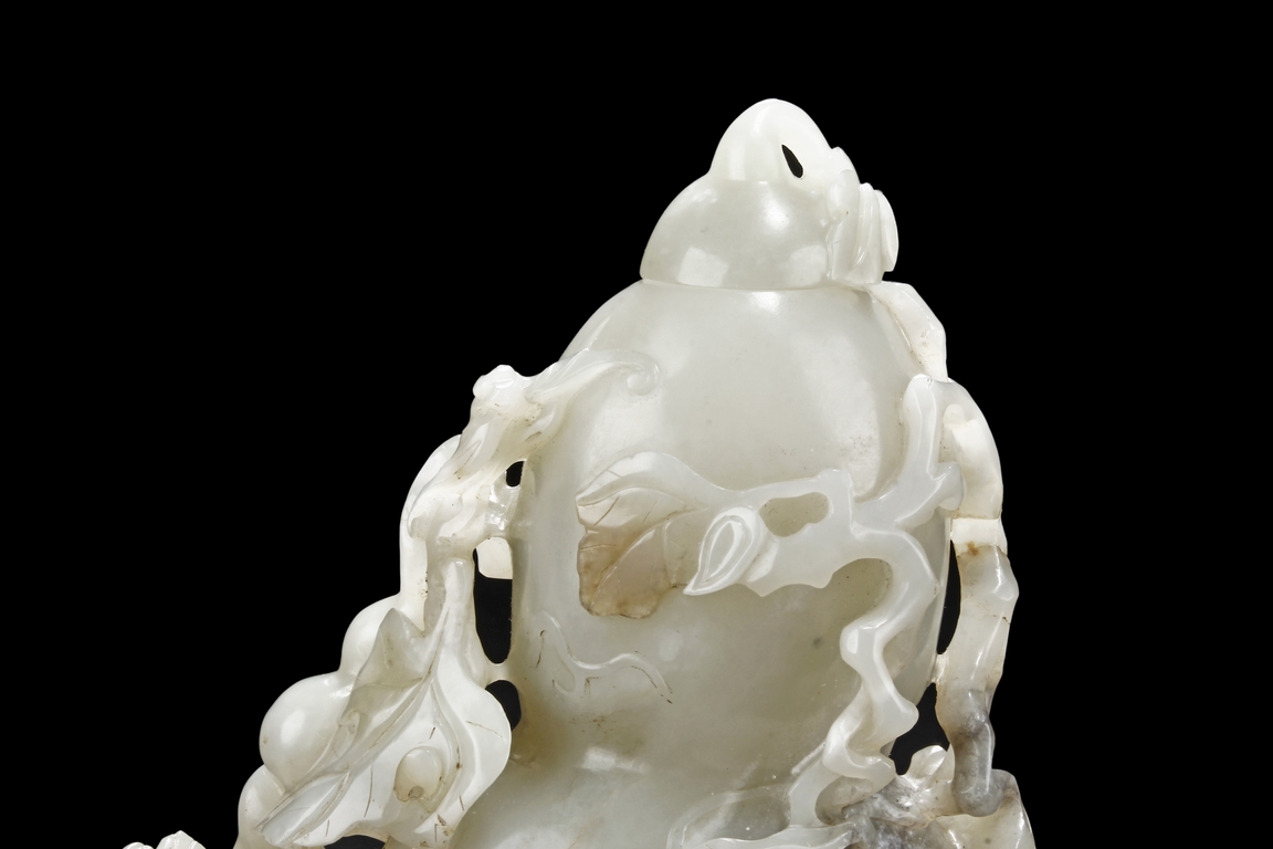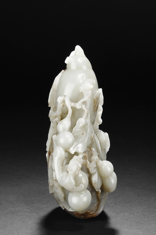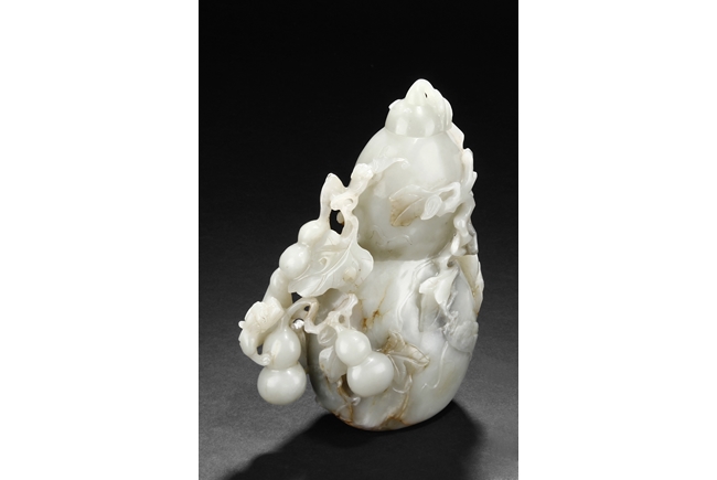 Of double-gourd form, it is supported on a gilt-bronze cloisonne enamel stand decorated with floral scroll patterns, the body is carved and pierced around the sides with trailing, leafy vines and smaller gourds, with a mythical beast crawling upon them, its tail divided to three branches. The stone is of mostly white tone with varying tone of grey and russet in some areas.