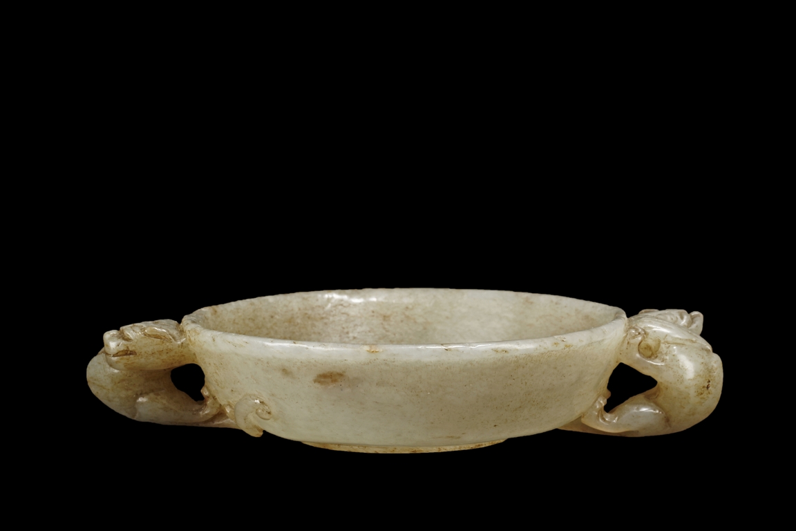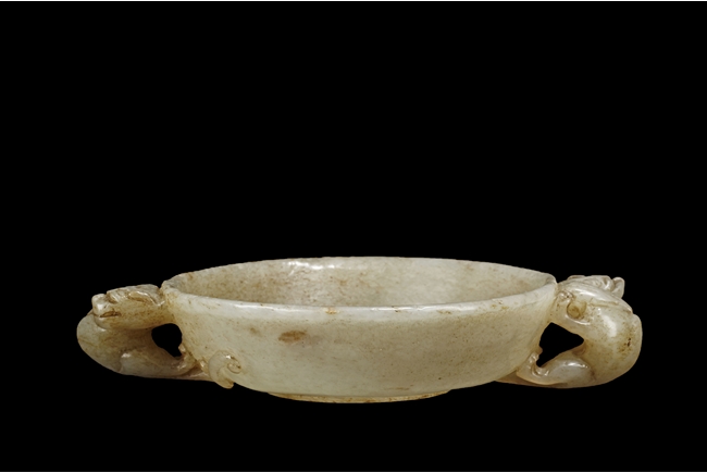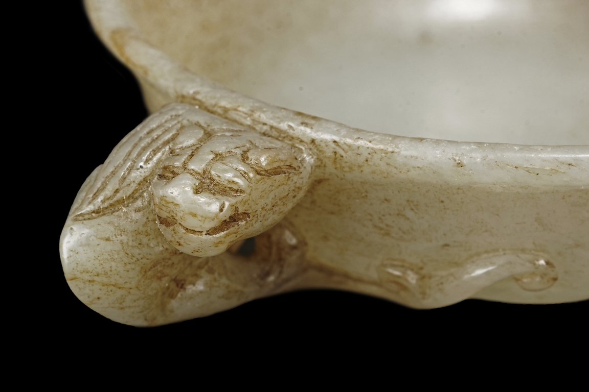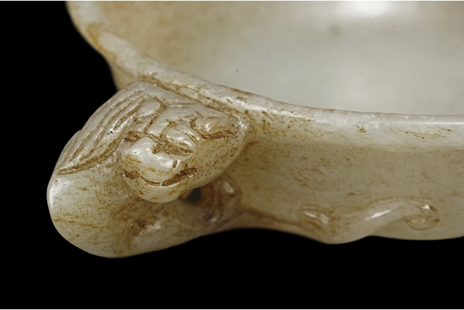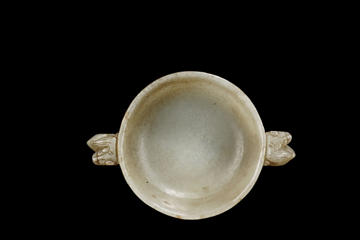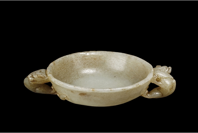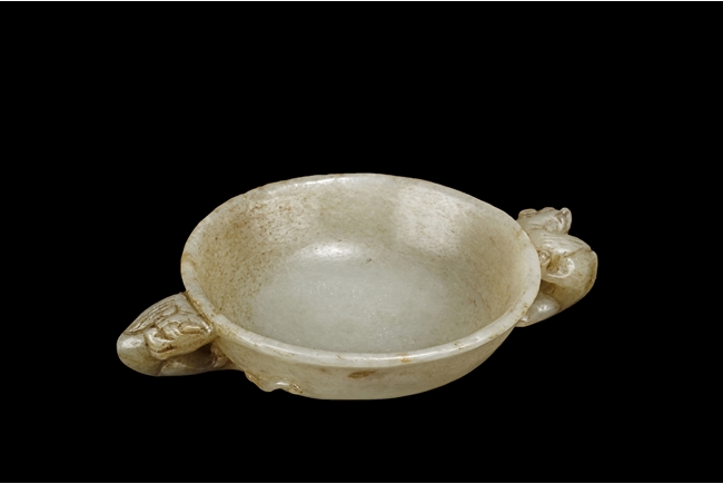The shallow cup has two mythical beast shaped handles on the sides, the body is of white and russet color, with mottled and translucent interior.