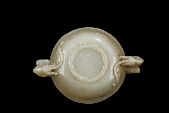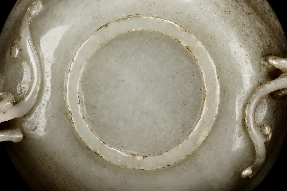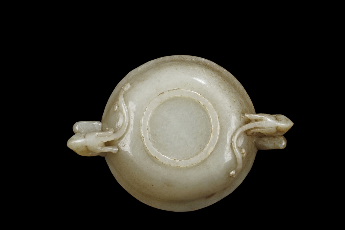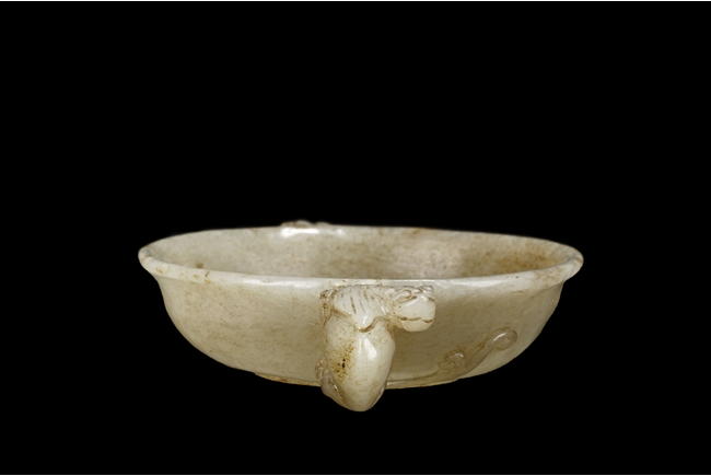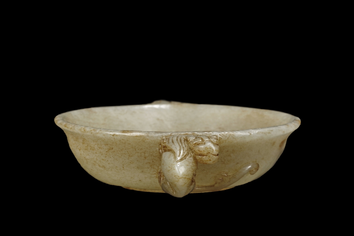 The shallow cup has two mythical beast shaped handles on the sides, the body is of white and russet color, with mottled and translucent interior.