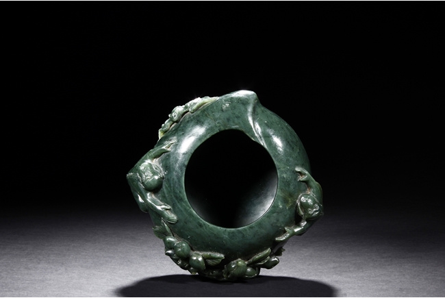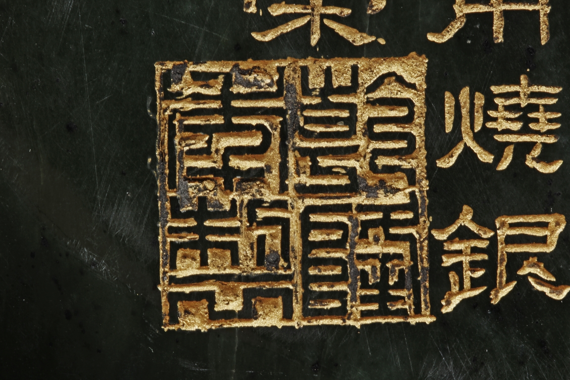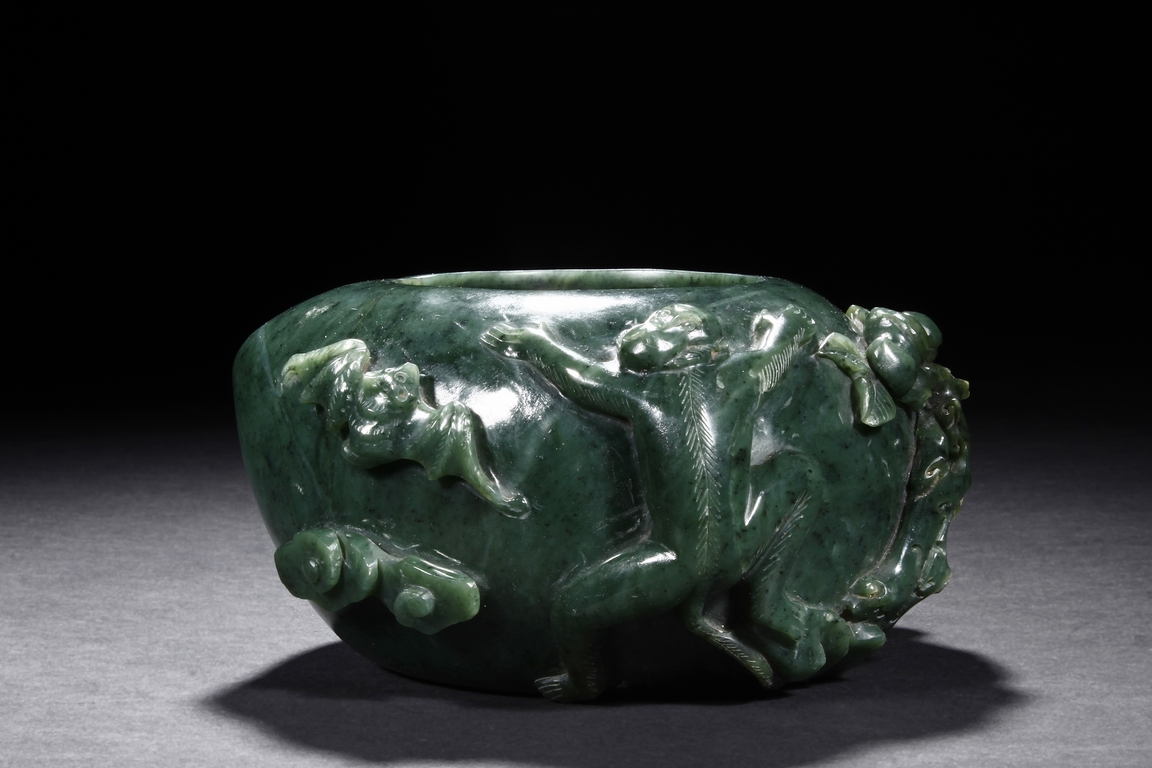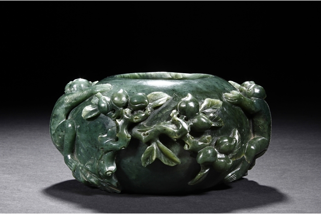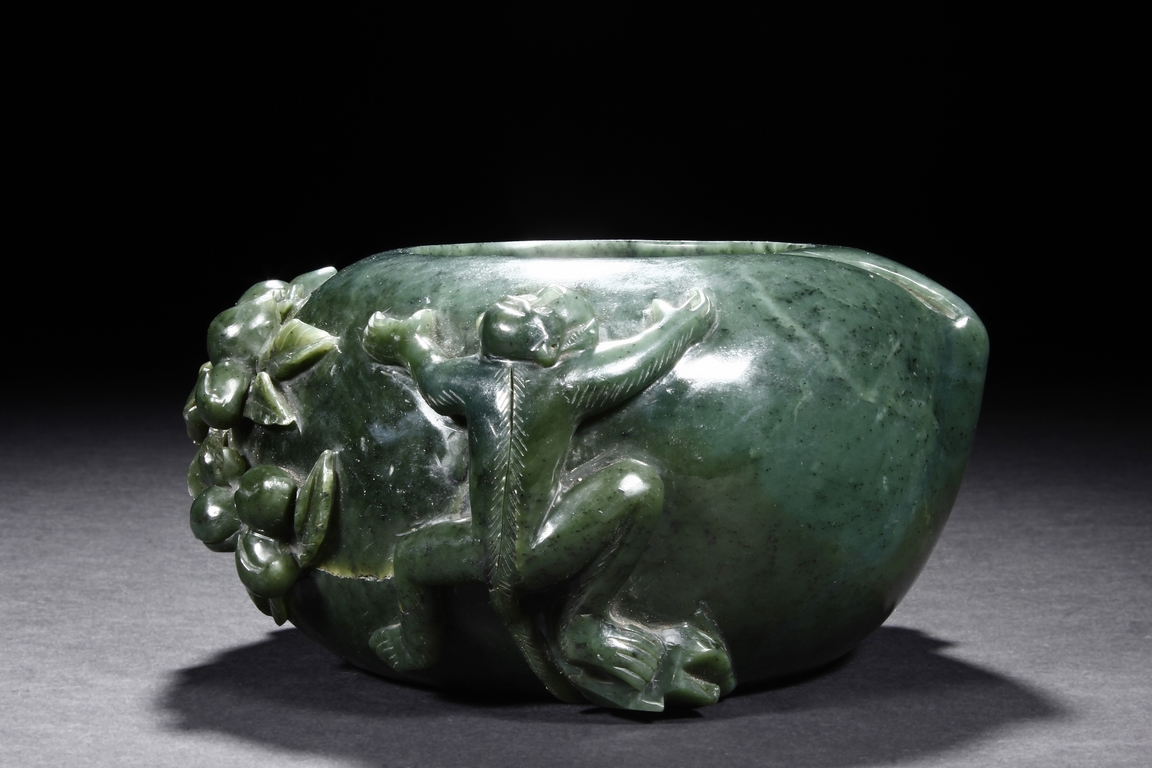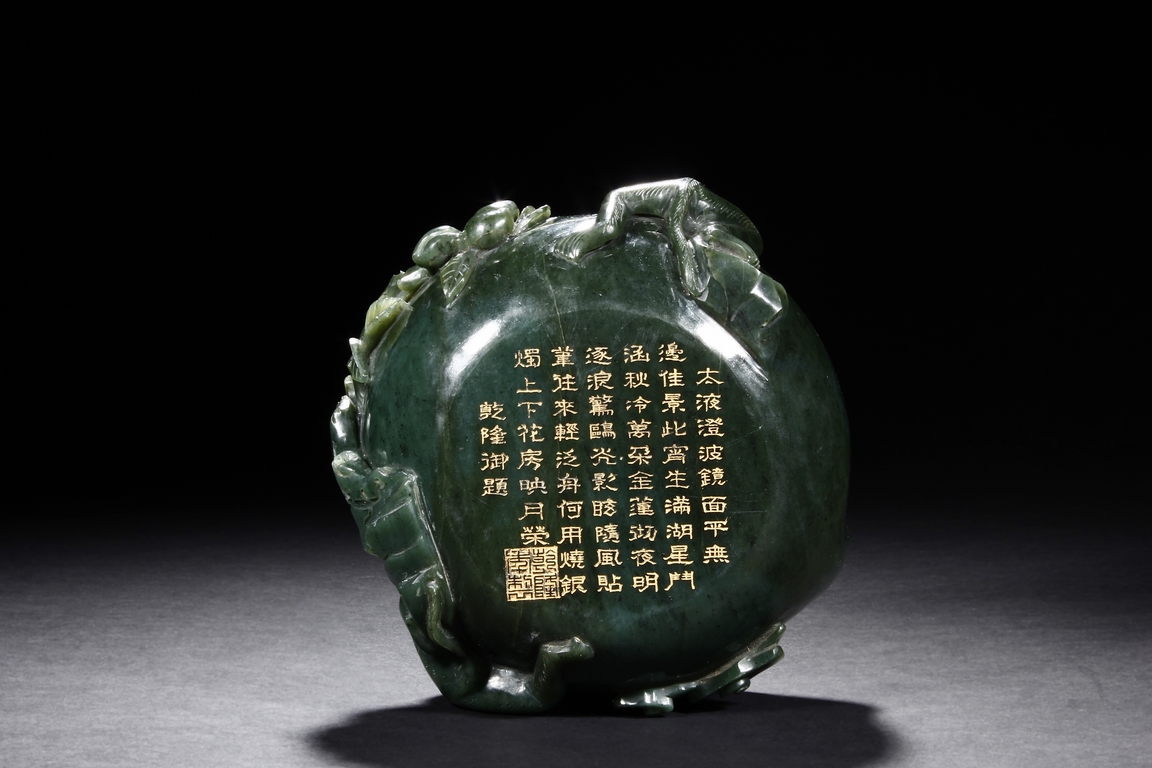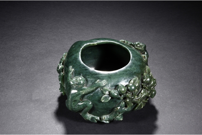 Modelled in the shape of a peach, the spinach jade water-pot is carved in the exterior in high relief with monkeys and bats flanking leafy peach branches. The bottom is incised in gilt with imperial poem. The stone is of spinach green tone with tiny black spots.
