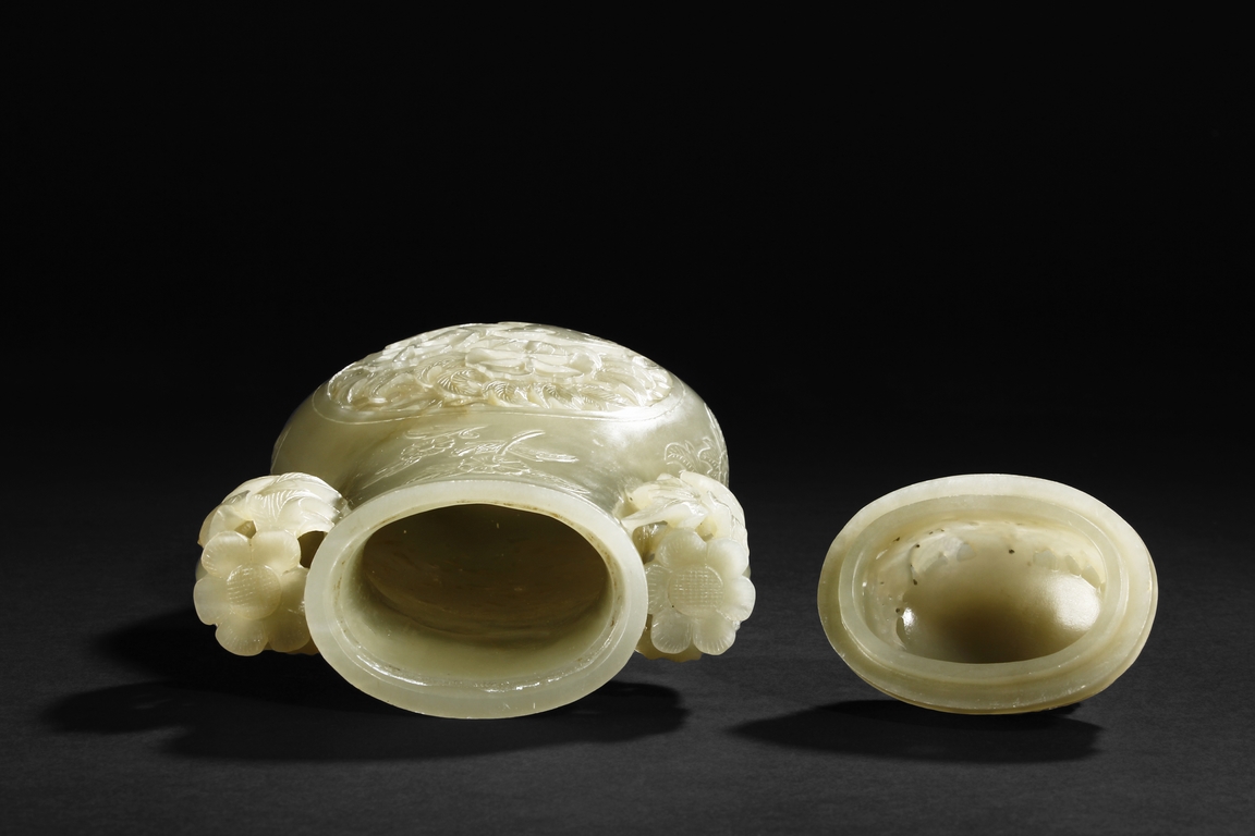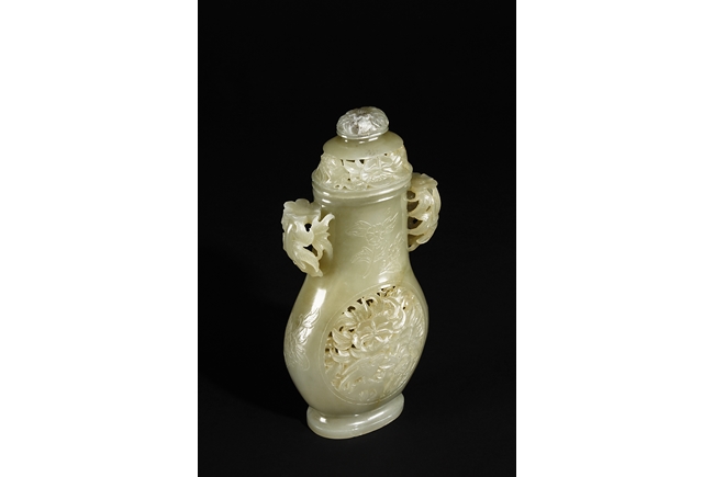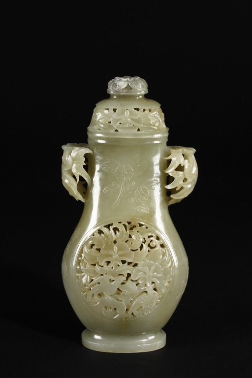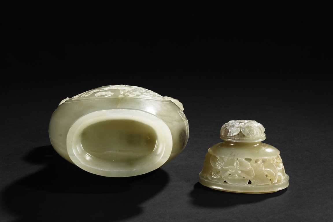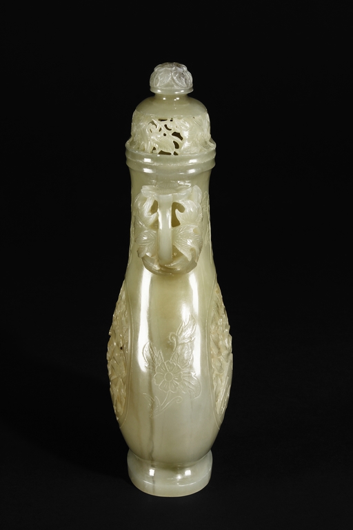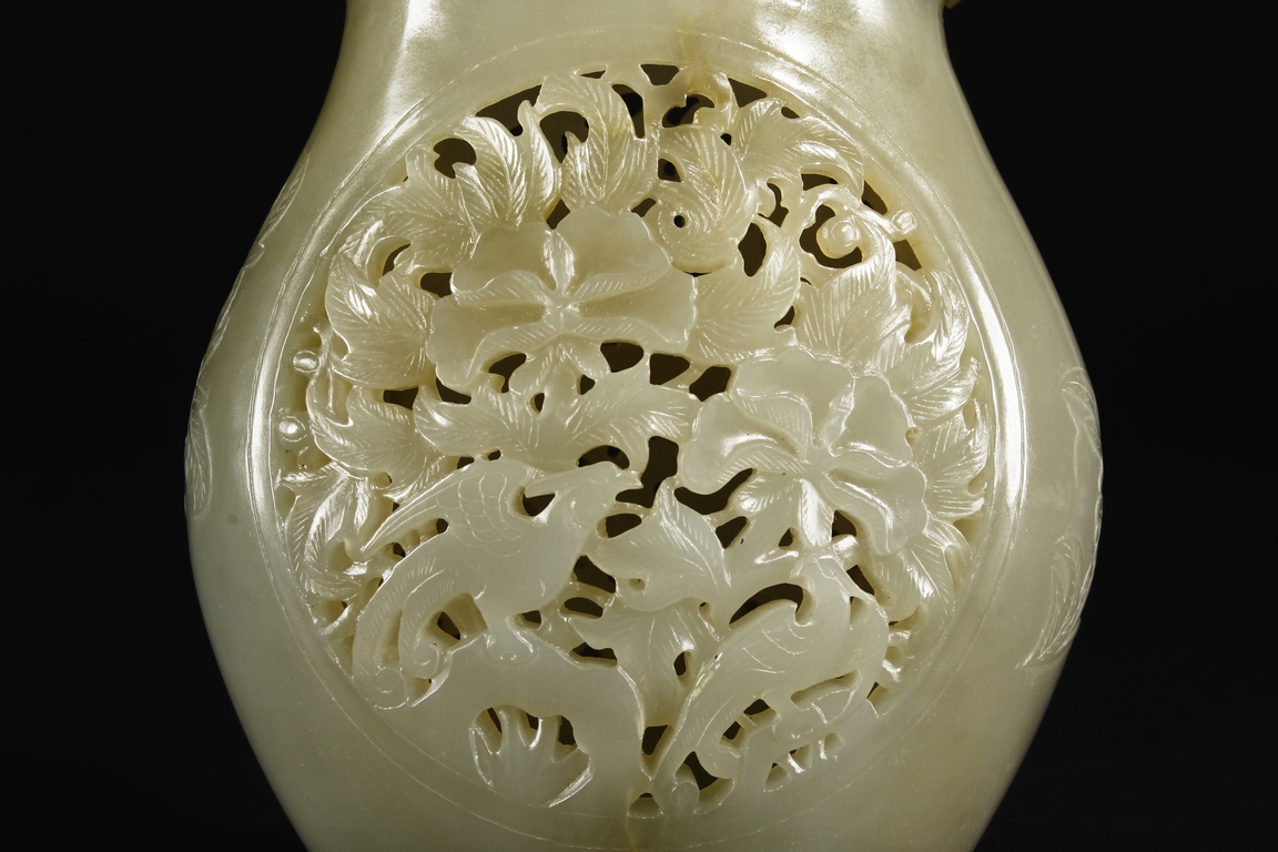 Of flattened and baluster form, the bottle vase carved in openworks, the body supported by an oval ring foot, the center roundel on the body depicting two birds amidst blooming flowers, the surface lightly carved with additional flowers, two floriform handles on the side, and the lid carved with additional flowers, topped with a domed flower finial. The stone of yellowish white, with slight russet.