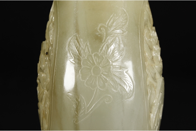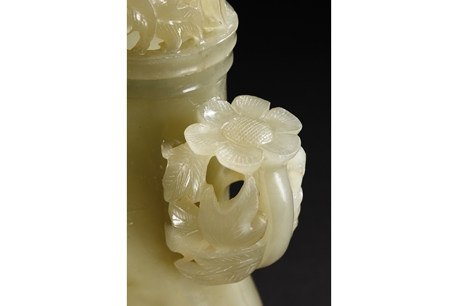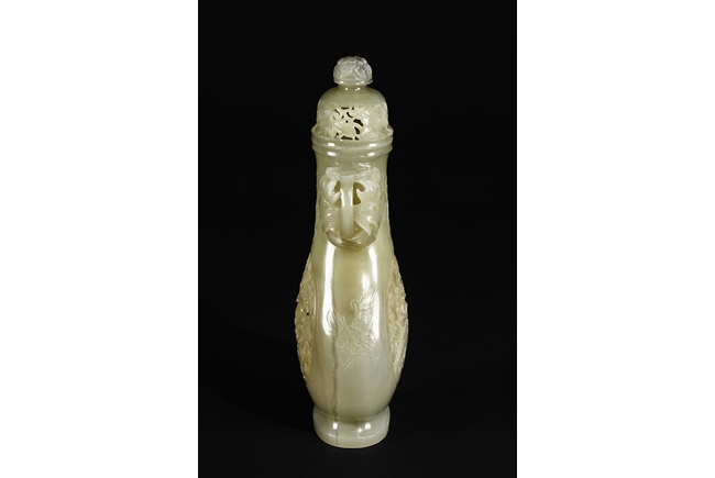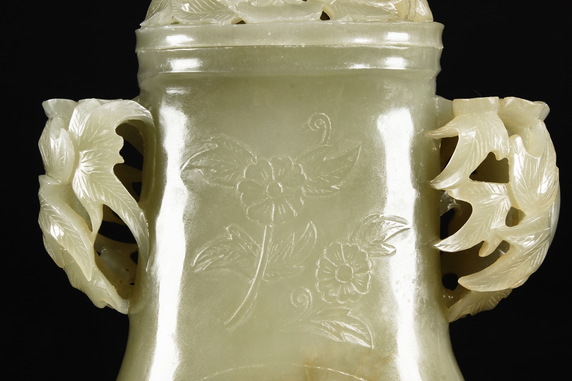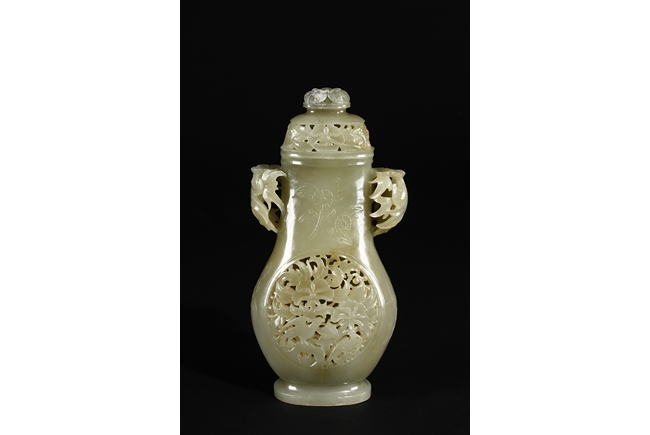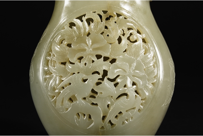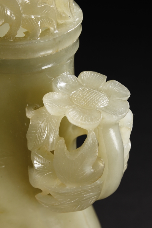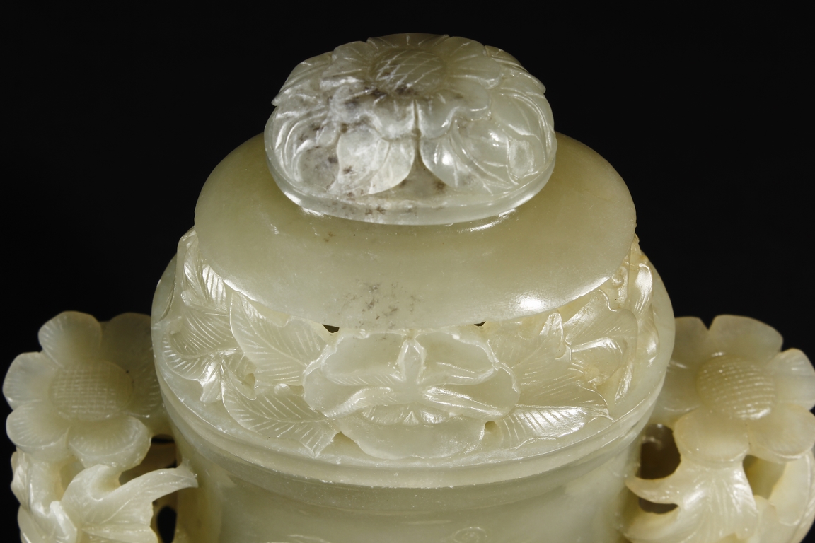 Of flattened and baluster form, the bottle vase carved in openworks, the body supported by an oval ring foot, the center roundel on the body depicting two birds amidst blooming flowers, the surface lightly carved with additional flowers, two floriform handles on the side, and the lid carved with additional flowers, topped with a domed flower finial. The stone of yellowish white, with slight russet.