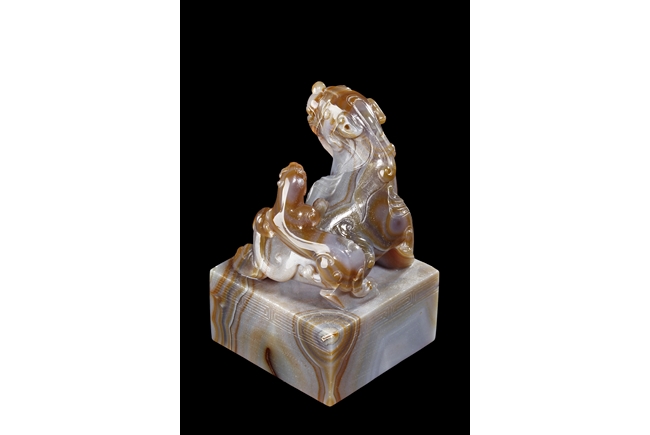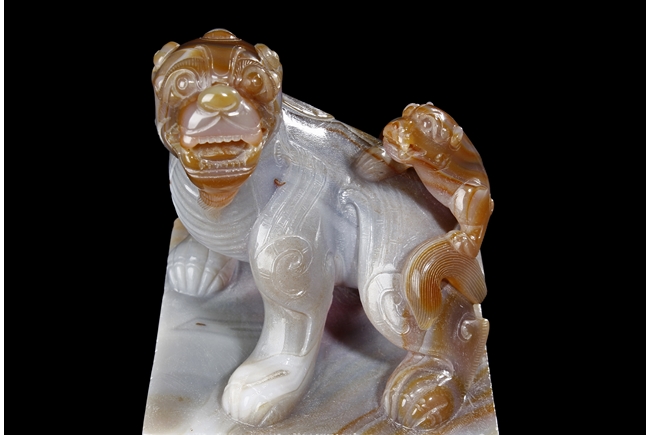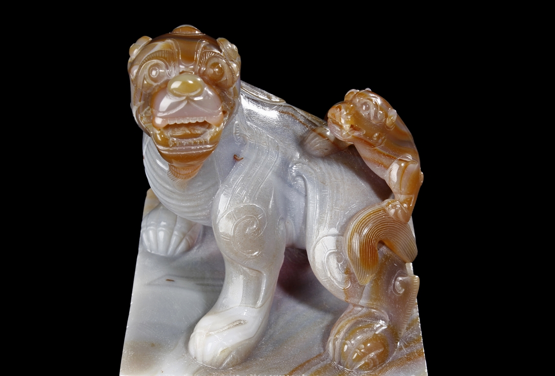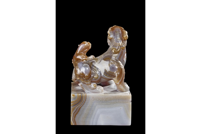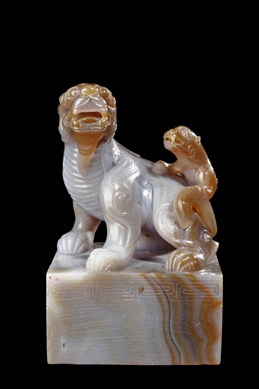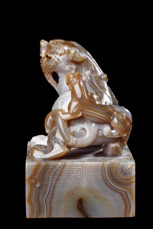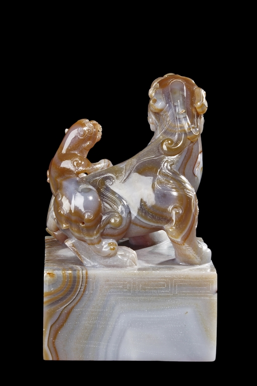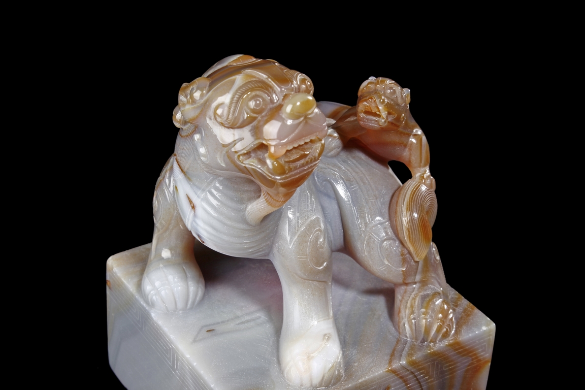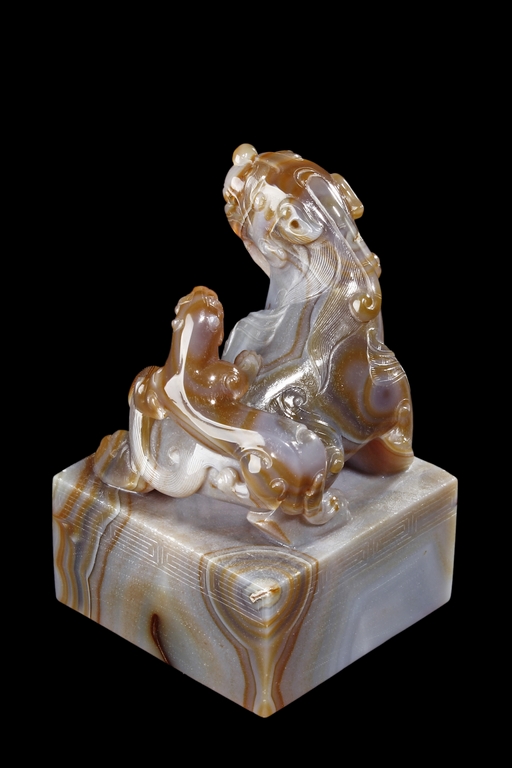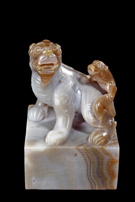 The slightly compressed square stamp seal lightly carved on the side with scrolling key-fret patterns, the top mounted with two mythical beasts, the smaller one standing on the larger one's back, the stone of natural color and layers, the bottom carved with four Chinese characters.