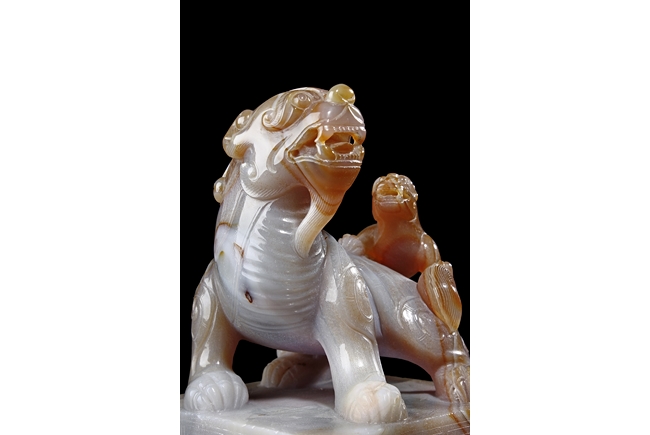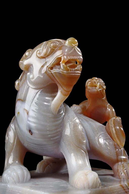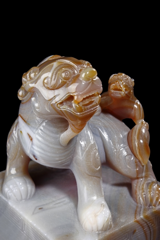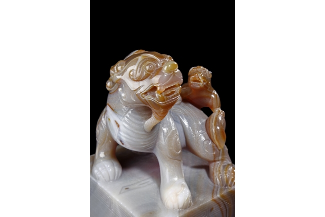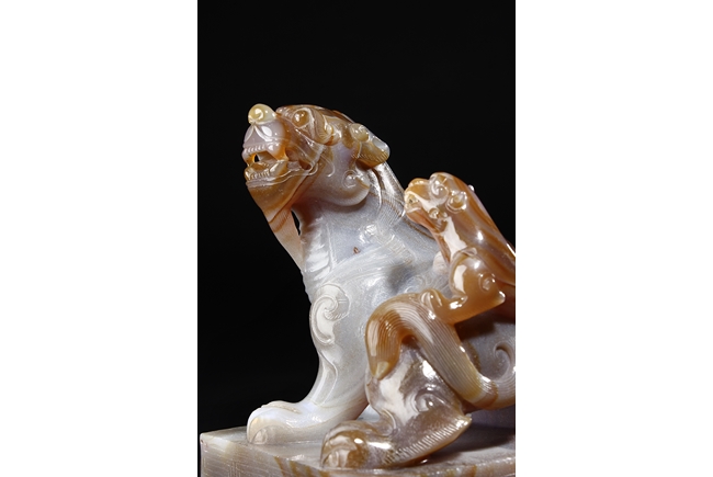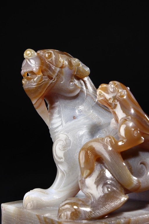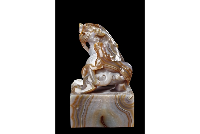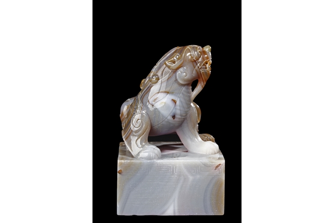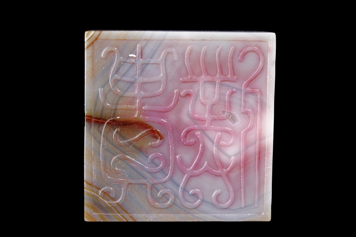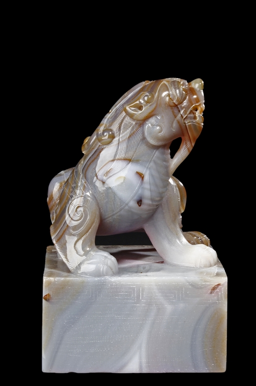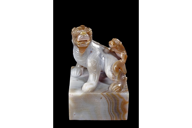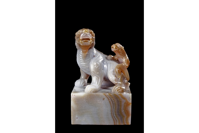 The slightly compressed square stamp seal lightly carved on the side with scrolling key-fret patterns, the top mounted with two mythical beasts, the smaller one standing on the larger one's back, the stone of natural color and layers, the bottom carved with four Chinese characters.